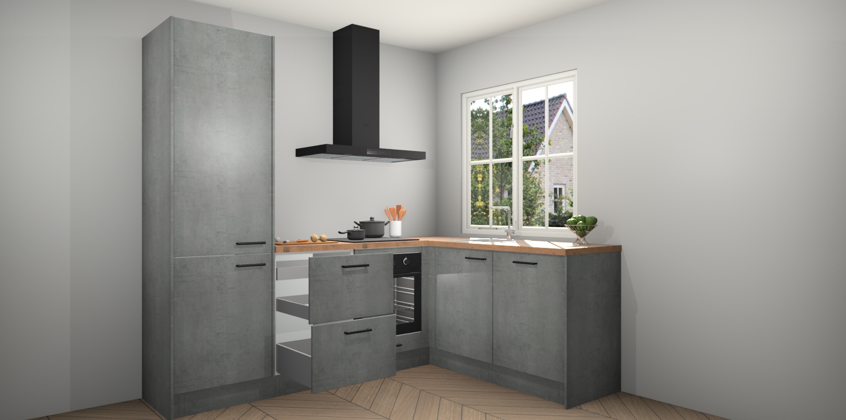 De Beton Parelgrijs keuken Linz is de perfecte keuze voor uw nieuwe moderne en tijdloze keuken. Ga voor moderne en tijdloze elegantie in uw keuken. De prachtige hoekkeuken biedt een verfrissende kijk op de manier waarop we ons vertrouwde keukenontwerp kunnen aanpassen in een nieuwe stijl. Één blik om alles te zien: zo mooi dat het bijna magisch lijkt.