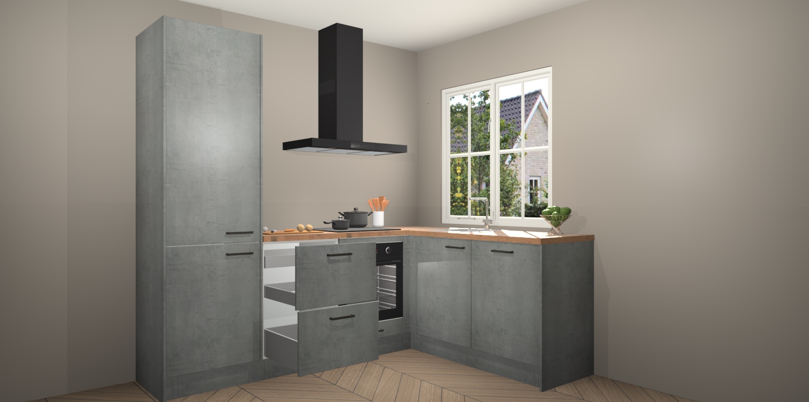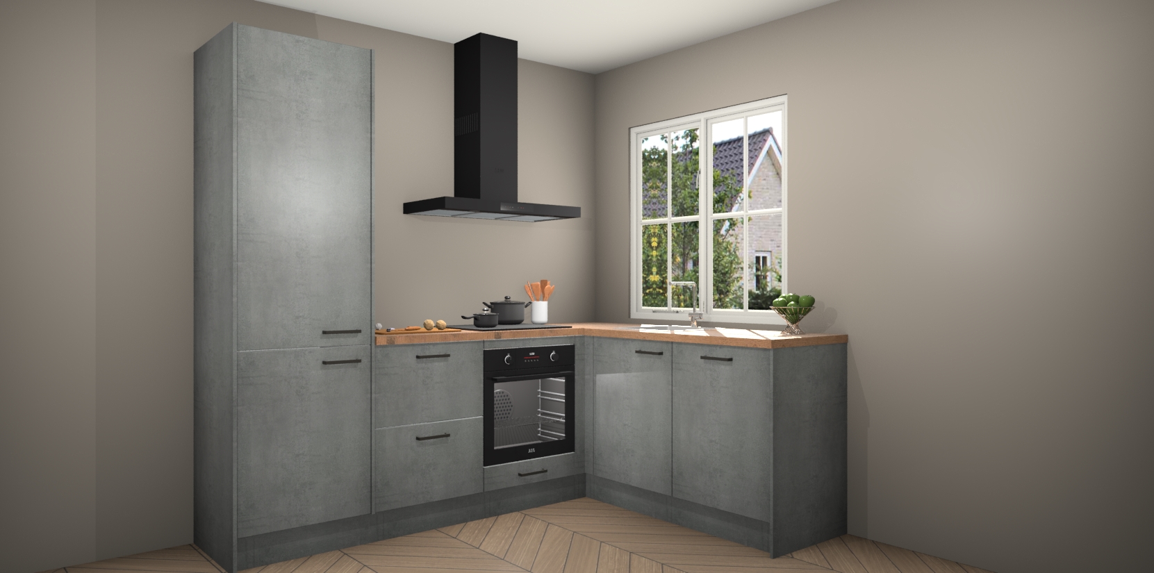 De Beton Parelgrijs keuken Linz is de perfecte keuze voor uw nieuwe moderne en tijdloze keuken. Ga voor moderne en tijdloze elegantie in uw keuken. De prachtige hoekkeuken biedt een verfrissende kijk op de manier waarop we ons vertrouwde keukenontwerp kunnen aanpassen in een nieuwe stijl. Één blik om alles te zien: zo mooi dat het bijna magisch lijkt.