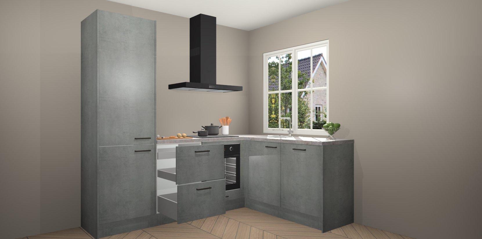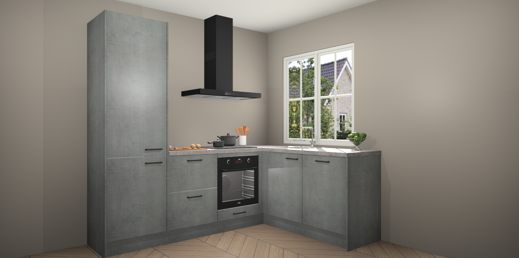 De Beton Parelgrijs keuken Linz is de perfecte keuze voor uw nieuwe moderne en tijdloze keuken. Ga voor moderne en tijdloze elegantie in uw keuken. De prachtige hoekkeuken biedt een verfrissende kijk op de manier waarop we ons vertrouwde keukenontwerp kunnen aanpassen in een nieuwe stijl. Één blik om alles te zien: zo mooi dat het bijna magisch lijkt.