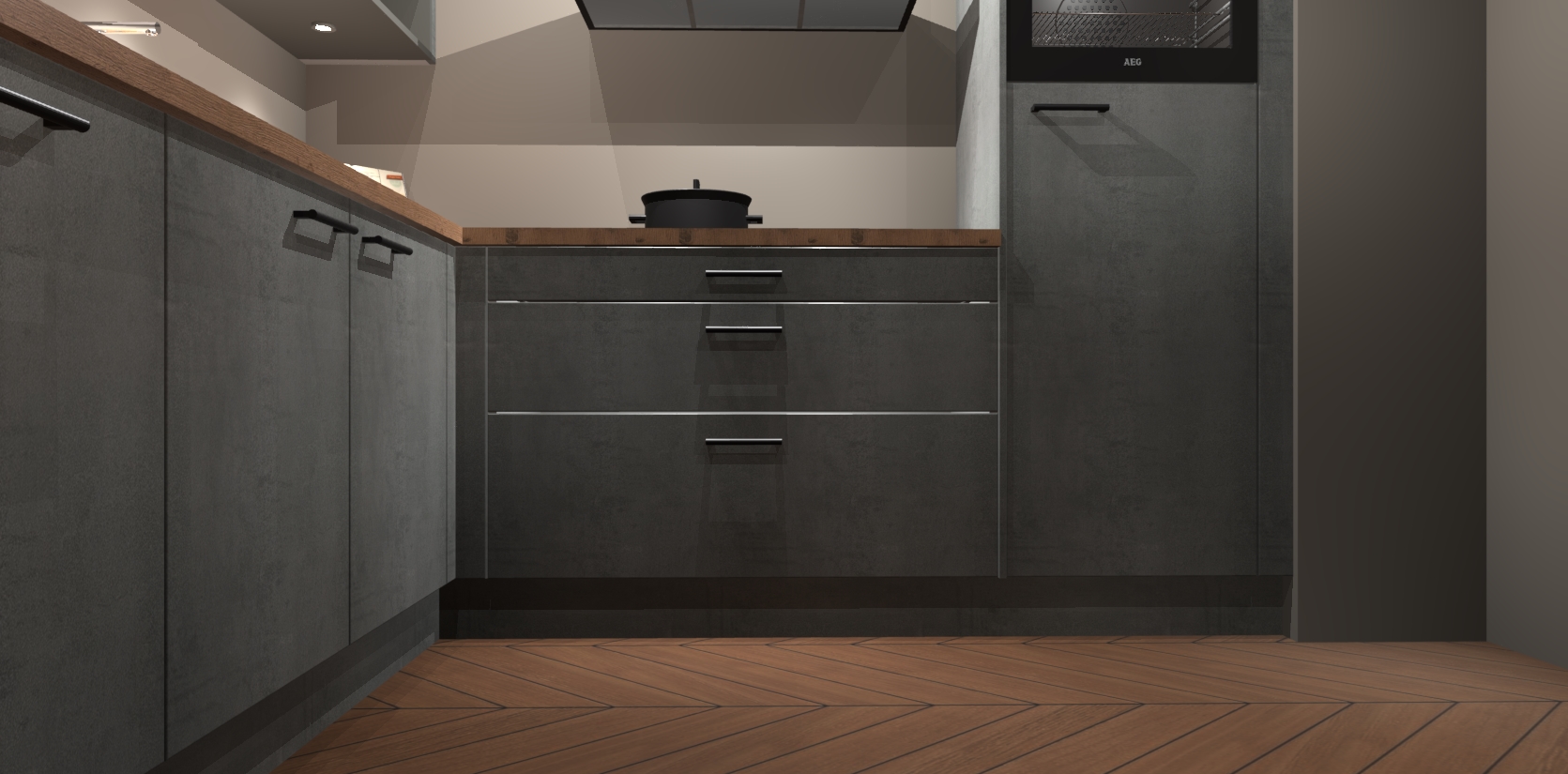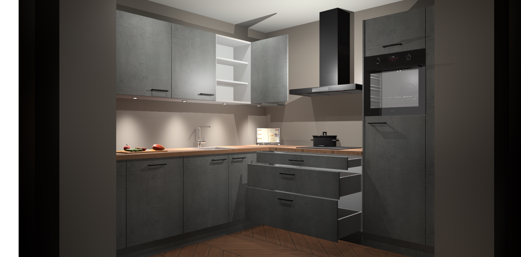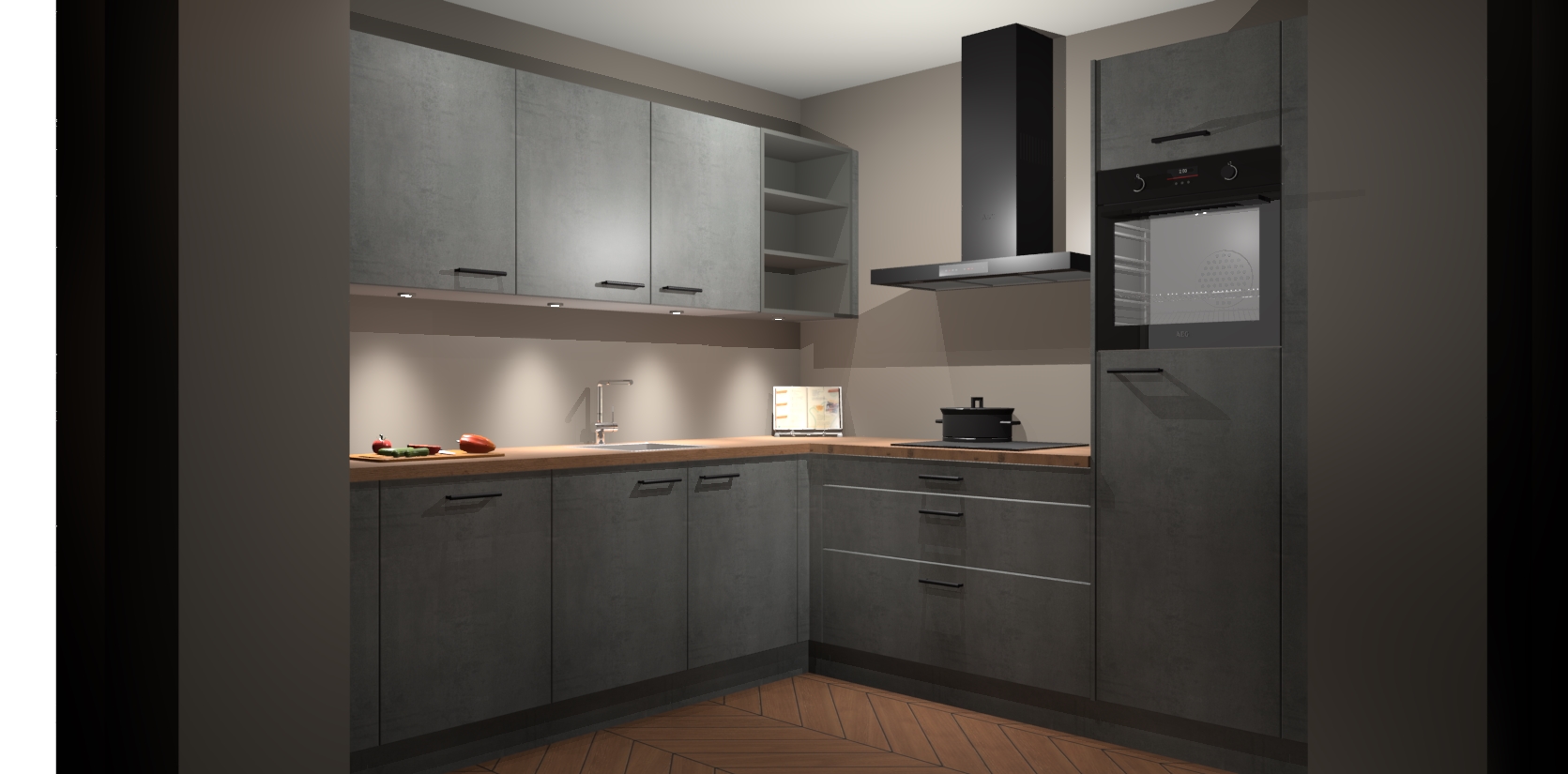 Met een modern, tijdloos design en ruime opslagruimte, zult u zich in no-time thuis voelen in uw nieuwe keuken. Uw leven wordt eenvoudiger met de soft-close deuren die voor het ultieme stille comfort zorgen - geen geluid dat u stoort terwijl u kookt. Ook is de keuken voorzien van 5 ingebouwde apparaten: een oven, inductie kookplaat, afzuigkap, vaatwasser en koelkast. Deze kunnen gemakkelijk na bestelling worden bijgewerkt naar AEG - waardoor uw luxe ervaring compleet is.
