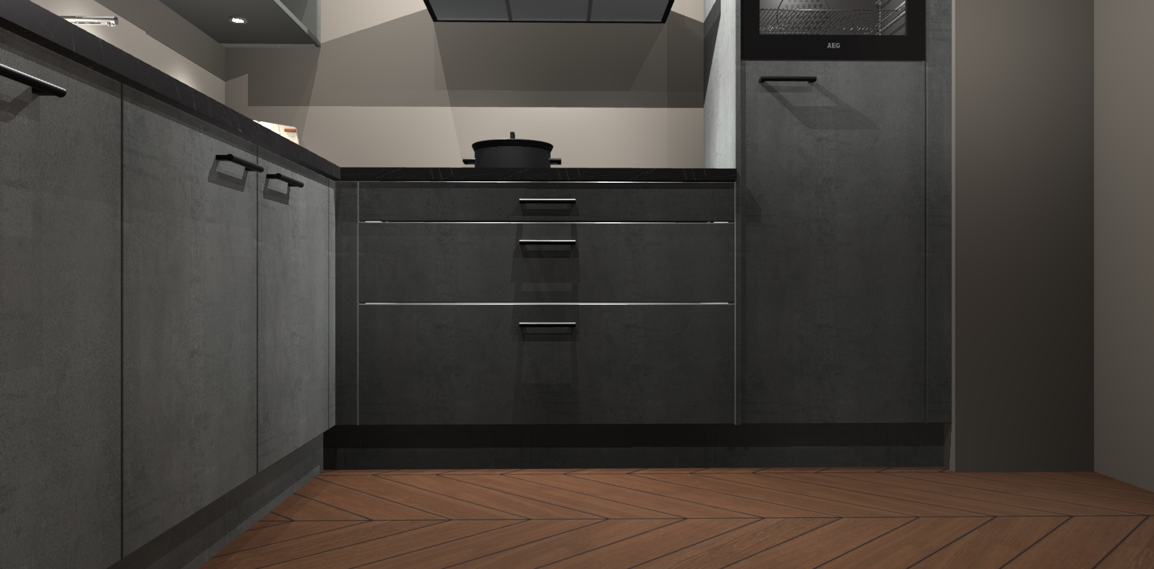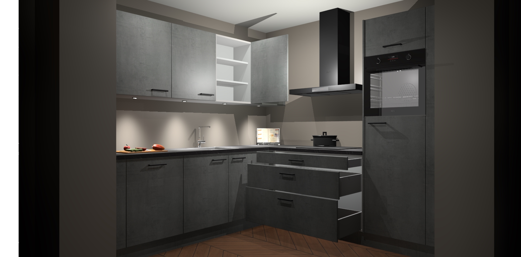 Met een modern, tijdloos design en ruime opslagruimte, zult u zich in no-time thuis voelen in uw nieuwe keuken. Uw leven wordt eenvoudiger met de soft-close deuren die voor het ultieme stille comfort zorgen - geen geluid dat u stoort terwijl u kookt. Ook is de keuken voorzien van 5 ingebouwde apparaten: een oven, inductie kookplaat, afzuigkap, vaatwasser en koelkast. Deze kunnen gemakkelijk na bestelling worden bijgewerkt naar AEG - waardoor uw luxe ervaring compleet is.