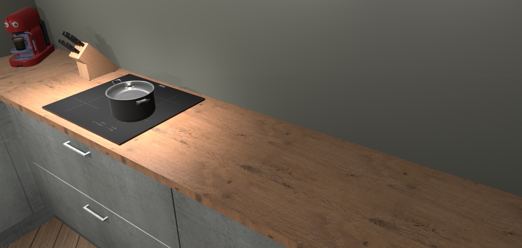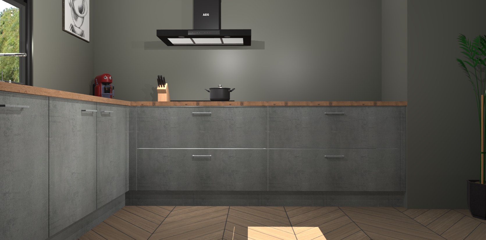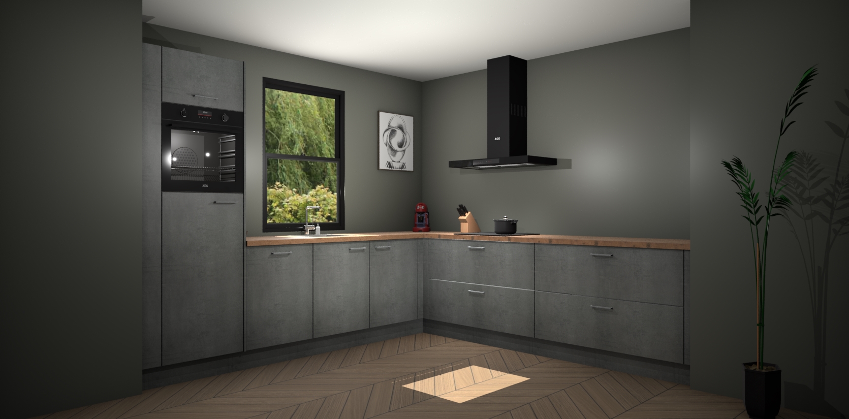 Welkom bij de Beton parelgrijs keuken Lublin. Deze prachtige keuken zal de komende jaren het middelpunt van de belangstelling in uw huis zijn. Uitgerust met vijf inbouwapparaten komt u nooit kookgereedschap tekort. Bovendien geeft de warme houtlook elke ruimte een uitnodigende en tijdloze uitstraling.