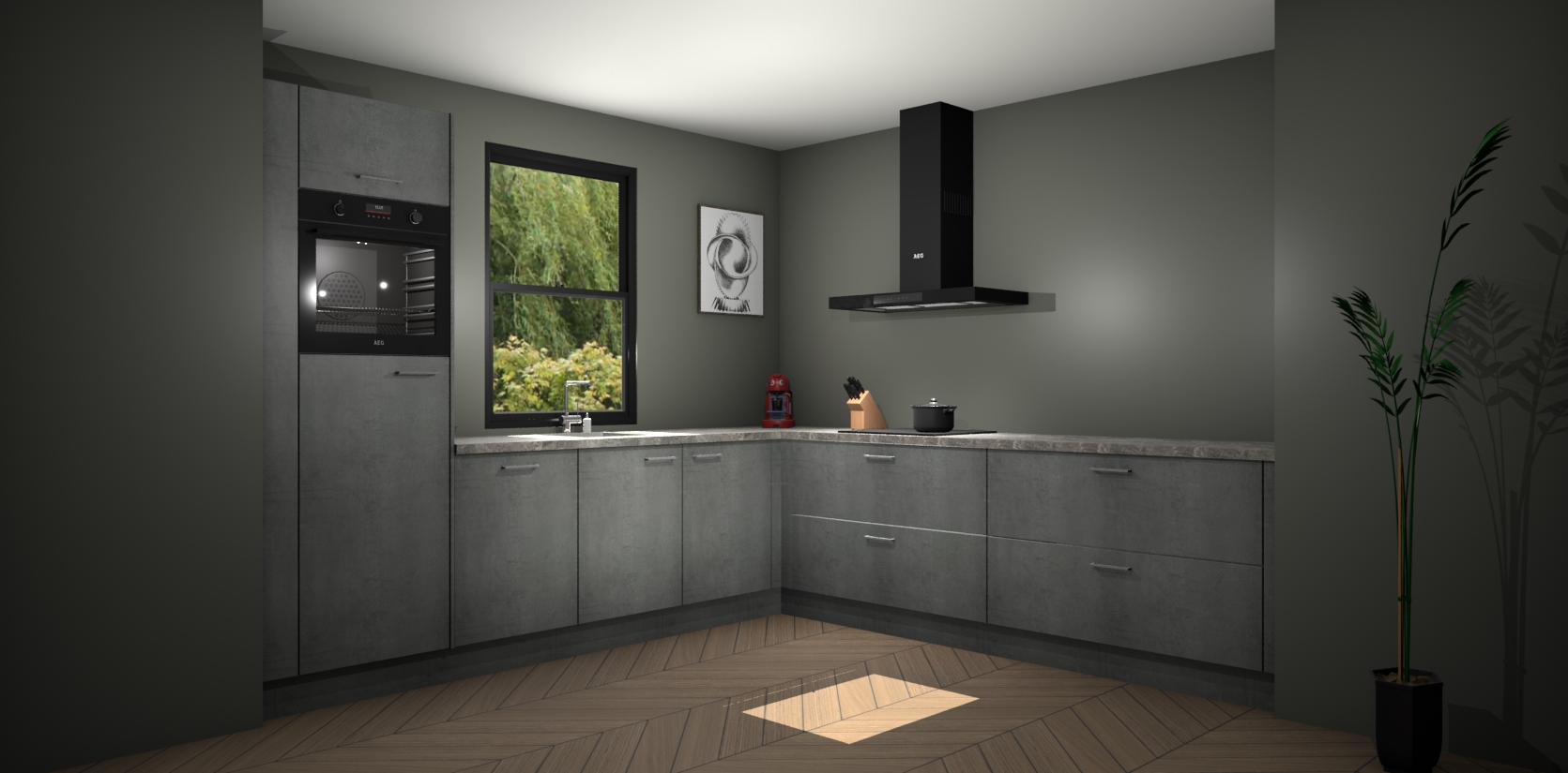 Welkom bij de Beton parelgrijs keuken Lublin. Deze prachtige keuken zal de komende jaren het middelpunt van de belangstelling in uw huis zijn. Uitgerust met vijf inbouwapparaten komt u nooit kookgereedschap tekort. Bovendien geeft de warme houtlook elke ruimte een uitnodigende en tijdloze uitstraling.
