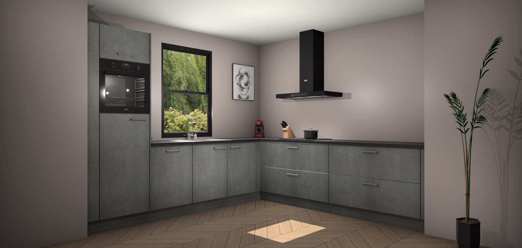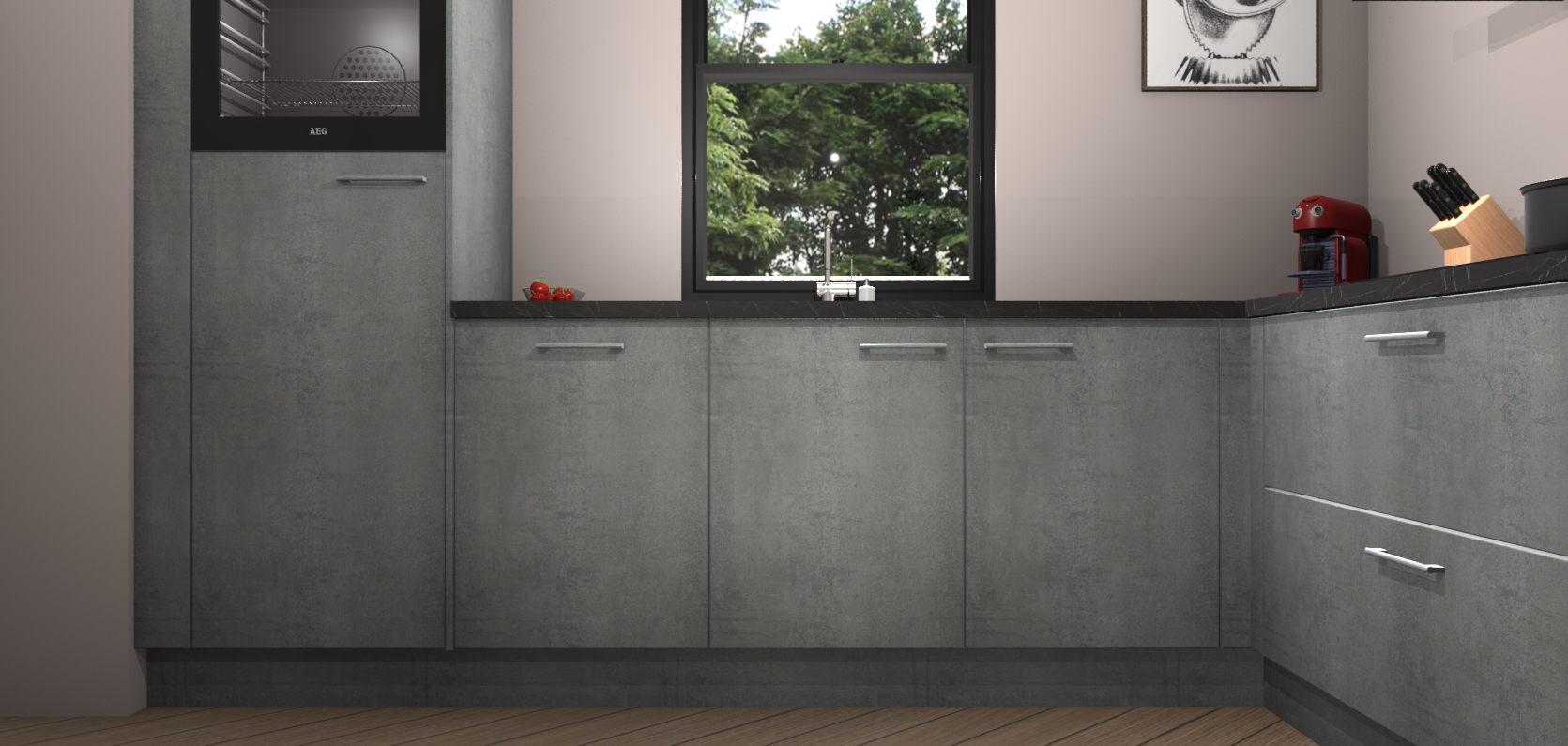 Welkom bij de Beton parelgrijs keuken Lublin. Deze prachtige keuken zal de komende jaren het middelpunt van de belangstelling in uw huis zijn. Uitgerust met vijf inbouwapparaten komt u nooit kookgereedschap tekort. Bovendien geeft de warme houtlook elke ruimte een uitnodigende en tijdloze uitstraling.