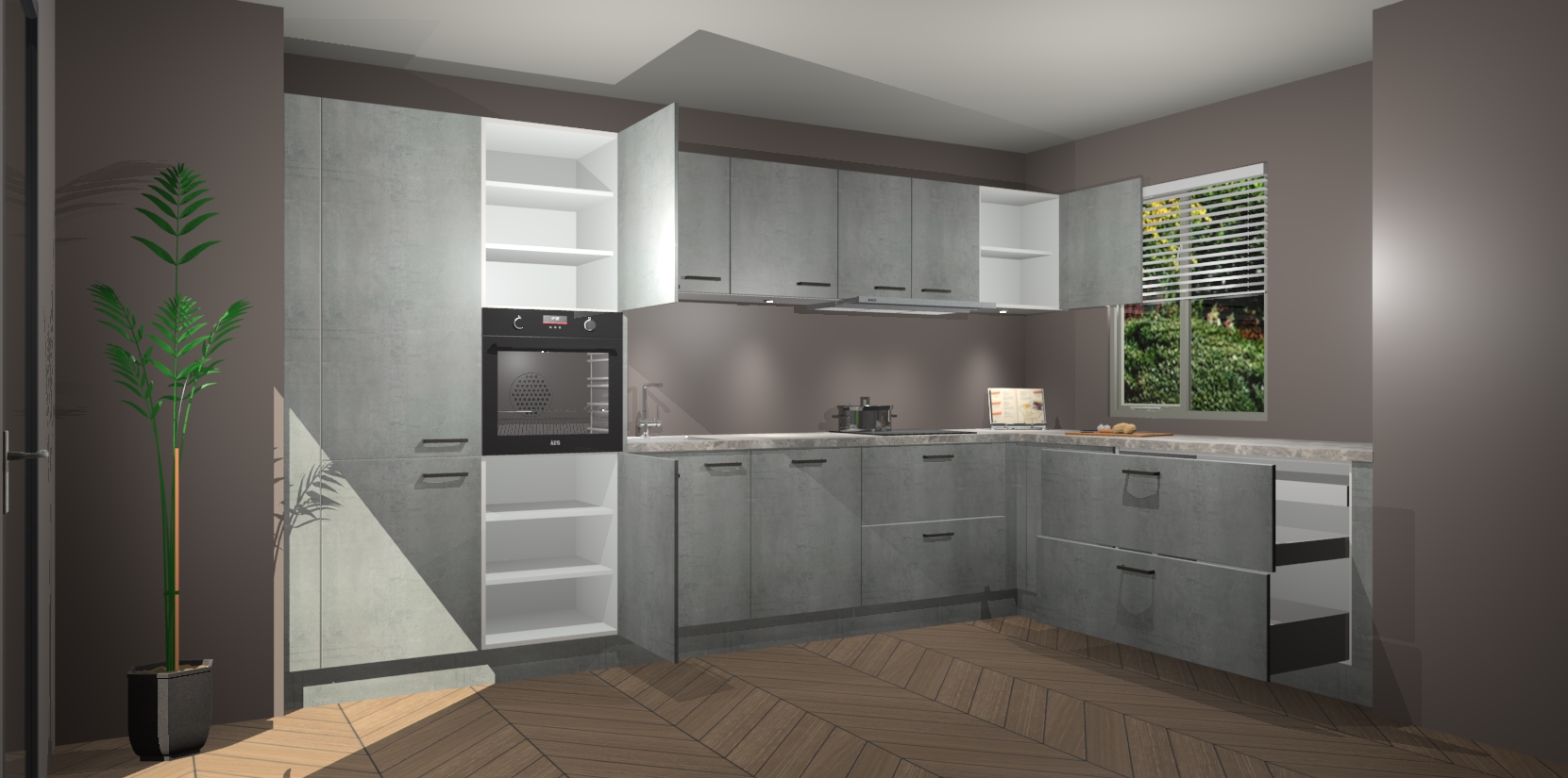 Verwelkom de natuurlijke warmte van de Beton Parelgrijs keuken Petten in uw huis. Deze prachtige hoekkeuken met zijn moderne design en warme houten look geeft u meer dan genoeg opbergruimte om uw comfortabel te voelen in uw keuken. Geniet van soft-close deuren die al uw gasten het gevoel zullen geven dat ze zich in een luxueuze ruimte bevinden.