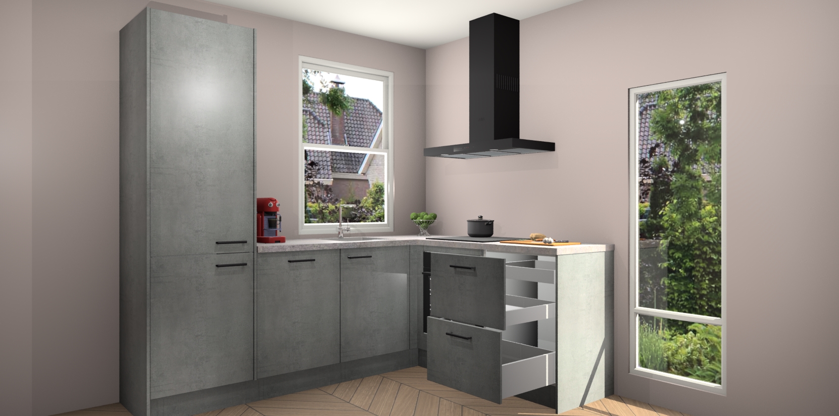 De Beton Parelgrijs keuken Phuket heeft alles wat u maar kunt wensen. Niet alleen zijn er softclose deuren, maar ook 5 ingebouwde apparaten: een oven, inductiekookplaat, afzuigkap, vaatwasser en koelkast - waarbij u later gemakkelijk naar het AEG merk, van inductiekookplaat naar kookplaat met geïntegreerde afzuiging of van oven naar combimagnetron kunt upgraden. Dat alles tegen een vast laag tarief! Bovendien geeft de Beton Parelgrijs keuken Phuket supersnelle levering van 7 weken. Echt iets voor u als u er niet op wilt wachten om het resultaat te zien in eigen keuken!