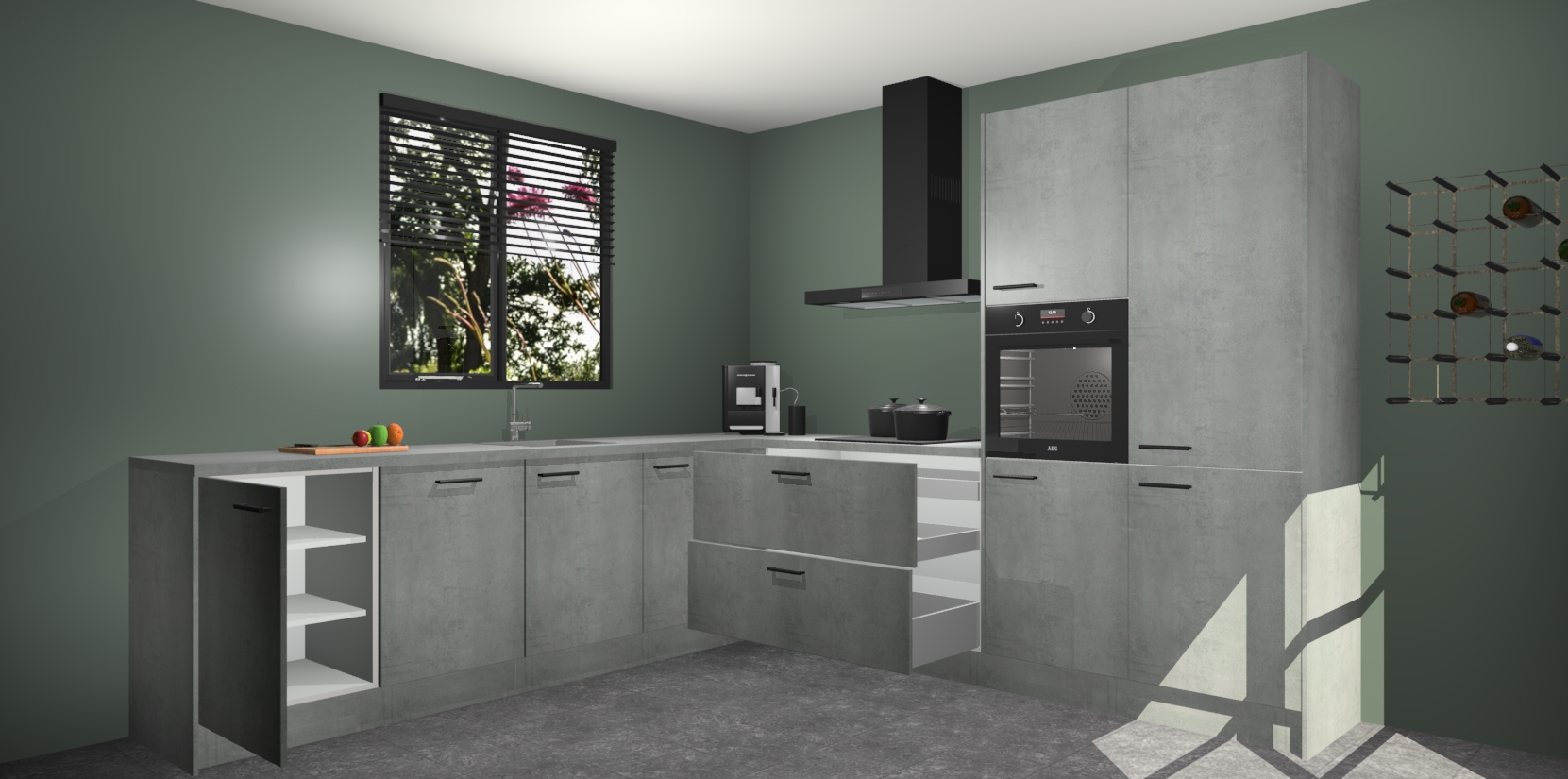 De Beton Parelgrijs keuken Porto heeft 5 ingebouwde apparaten - een oven, inductiekookplaat, afzuigkap, vaatwasser en koelkast - waarmee u in een handomdraai heerlijke gerechten bereidt. Soft-close deuren zorgen voor nog meer functionaliteit en gemak. En dit alles voor een onverslaanbaar vaste prijs. En als u nu bestelt, duurt de levering maar 7 weken! Wat nog ongelooflijker is, is dat onze kasten voor gemonteerd worden geleverd.