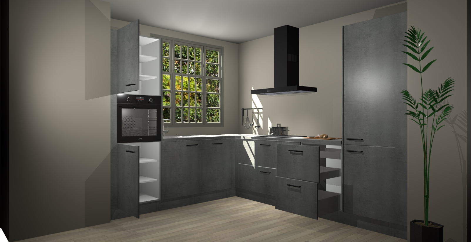 Met een modern, tijdloos design en ruime opslagruimte, zult u zich in no-time thuis voelen in uw nieuwe keuken. Uw leven wordt eenvoudiger met de soft-close deuren die voor het ultieme stille comfort zorgen - geen geluid dat u stoort terwijl u kookt. Ook is de keuken voorzien van 5 ingebouwde apparaten: een oven, inductie kookplaat, afzuigkap, vaatwasser en koelkast. Deze kunnen gemakkelijk na bestelling worden bijgewerkt naar AEG - waardoor uw luxe ervaring compleet is.