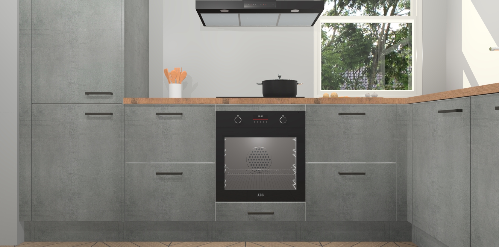 Wat maakt deze keuken zo bijzonder? Ten eerste geeft het houten werkblad uw ruimte een onmiskenbaar klassieke uitstraling. De natuurlijke afwerking roept warmte en elegantie op die nooit uit de mode zullen raken. Bovendien is het gemakkelijk schoon te houden en te onderhouden, zodat je er jarenlang plezier van kunt hebben. Als u op zoek bent naar extra gemak in uw keuken, dan heeft u bij het plaatsen van een bestelling bij ons ook de optie om uw toestellen te upgraden naar AEG-modellen - zo haalt u moderne innovatie van topmerken in apparatentechnologie rechtstreeks in huis.
