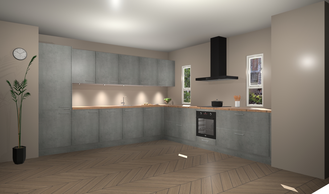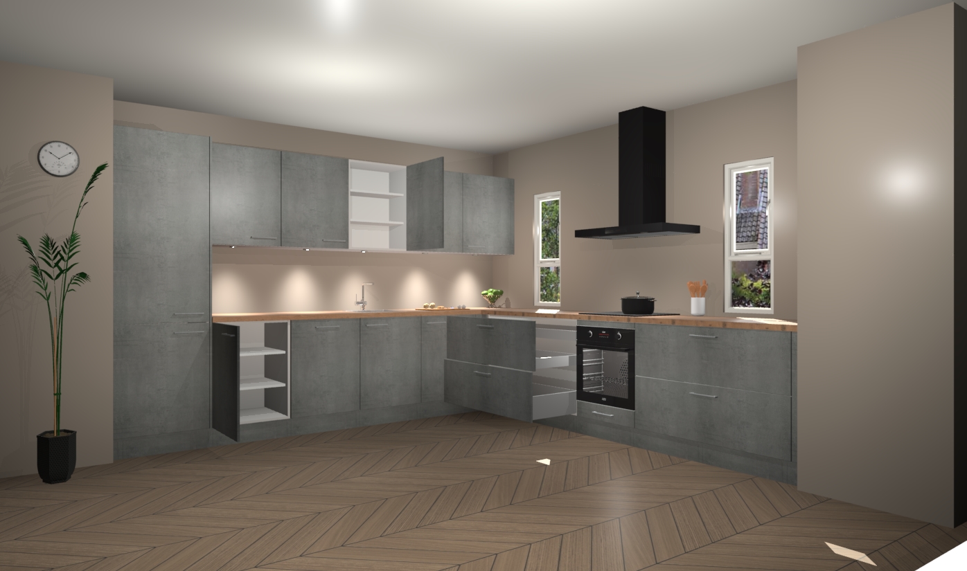 De beton parelgrijs keuken is een ideale hoekkeuken en heeft alle functies en apparatuur die u maar nodig kunt hebben. Bij de bestelling krijgt u een oven, inductiekookplaat, afzuigkap, vaatwasser en koelkast - deze kunnen desgewenst eenvoudig worden uitgebreid naar AEG na bestellen. Elke kast wordt ook voor gemonteerd geleverd met soft close deuren die jarenlang gebruik beloven. Stelt u zich voor dat u geen gedoe heeft met vervelende montage - vanaf het moment dat u uw bestelling plaats, duurt het slechts 7 weken voor het bij u thuis geleverd wordt.