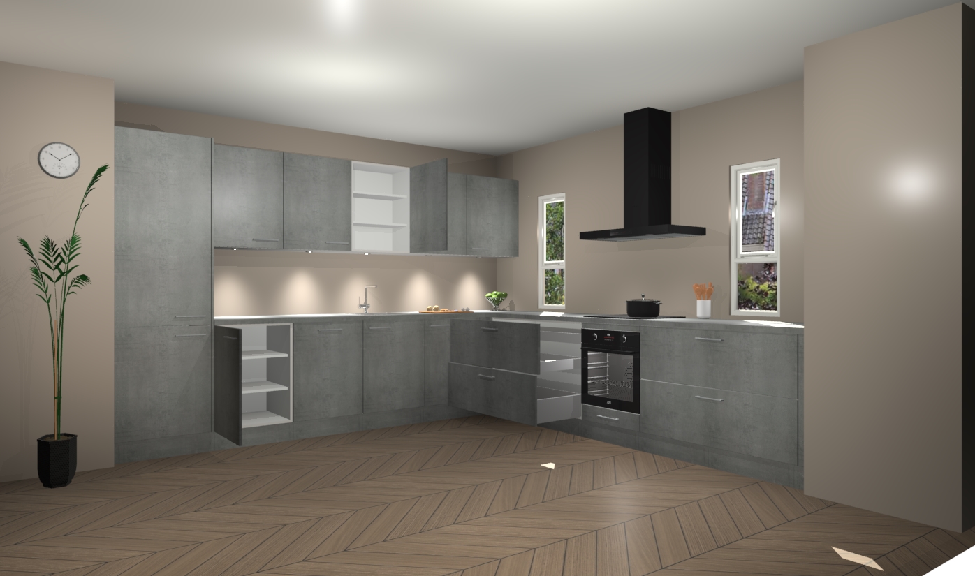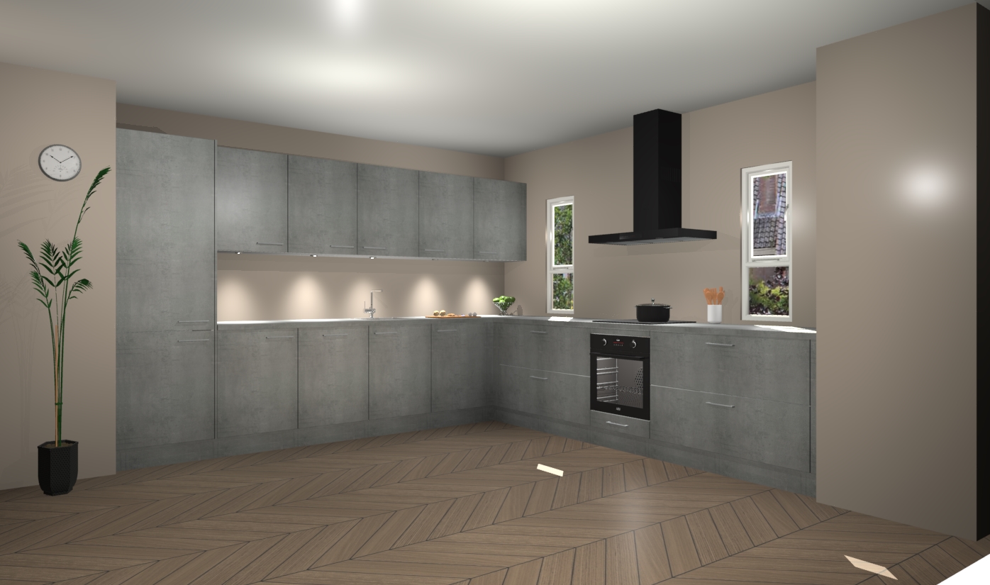 De beton parelgrijs keuken is een ideale hoekkeuken en heeft alle functies en apparatuur die u maar nodig kunt hebben. Bij de bestelling krijgt u een oven, inductiekookplaat, afzuigkap, vaatwasser en koelkast - deze kunnen desgewenst eenvoudig worden uitgebreid naar AEG na bestellen. Elke kast wordt ook voor gemonteerd geleverd met soft close deuren die jarenlang gebruik beloven. Stelt u zich voor dat u geen gedoe heeft met vervelende montage - vanaf het moment dat u uw bestelling plaats, duurt het slechts 7 weken voor het bij u thuis geleverd wordt.