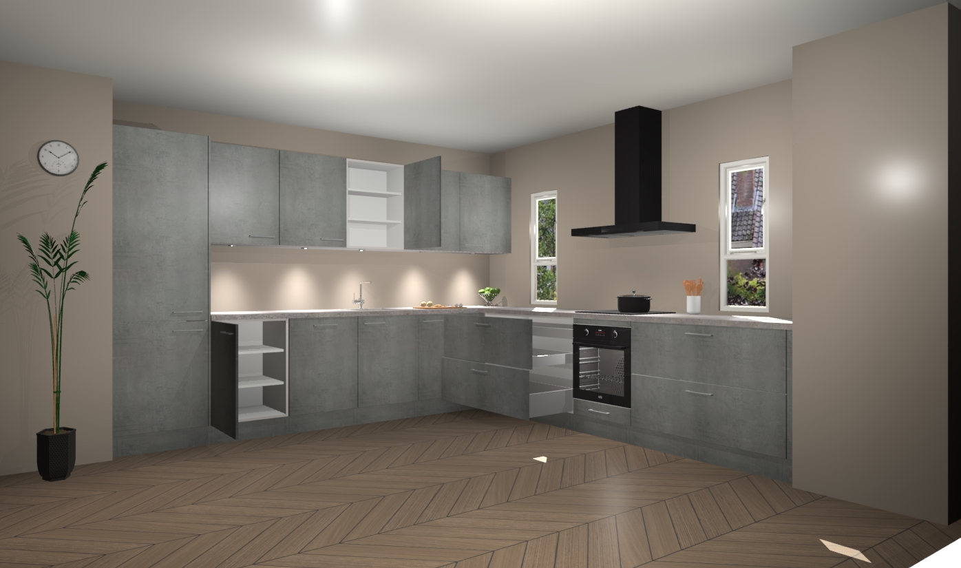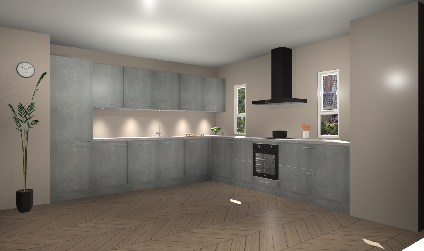 De beton parelgrijs keuken is een ideale hoekkeuken en heeft alle functies en apparatuur die u maar nodig kunt hebben. Bij de bestelling krijgt u een oven, inductiekookplaat, afzuigkap, vaatwasser en koelkast - deze kunnen desgewenst eenvoudig worden uitgebreid naar AEG na bestellen. Elke kast wordt ook voor gemonteerd geleverd met soft close deuren die jarenlang gebruik beloven. Stelt u zich voor dat u geen gedoe heeft met vervelende montage - vanaf het moment dat u uw bestelling plaats, duurt het slechts 7 weken voor het bij u thuis geleverd wordt.