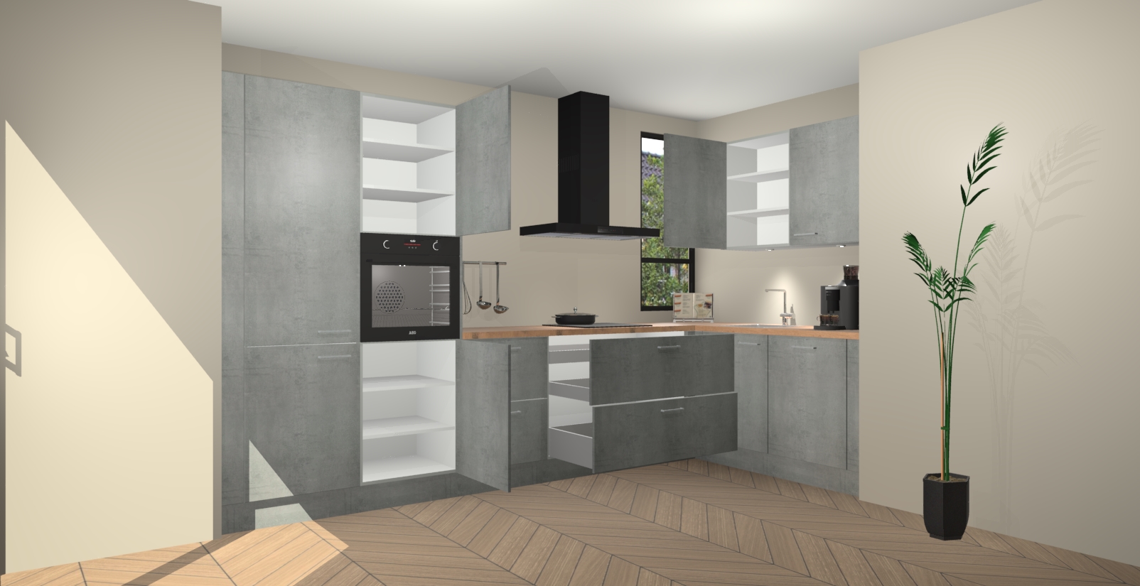 Welkom in uw nieuwe moderne keuken! Laat ons u voorstellen aan de Beton Parelgrijs keuken Vlaanderen . Deze prachtige hoekkeuken straalt exclusiviteit en luxe uit als geen ander. Het strakke design, de tijdloze kleuren en het model maken van deze keuken een moderne klassieker. En met voldoende opbergruimte heeft deze keuken echt voor ieder wat wils.