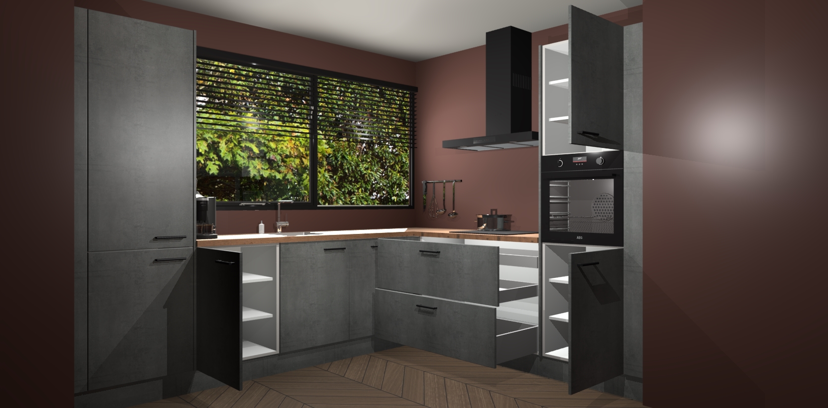 Met een modern, tijdloos design en ruime opslagruimte, zult u zich in no-time thuis voelen in uw nieuwe keuken. Uw leven wordt eenvoudiger met de soft-close deuren die voor het ultieme stille comfort zorgen - geen geluid dat u stoort terwijl u kookt. Ook is de keuken voorzien van 5 ingebouwde apparaten: een oven, inductie kookplaat, afzuigkap, vaatwasser en koelkast. Deze kunnen gemakkelijk na bestelling worden bijgewerkt naar AEG - waardoor uw luxe ervaring compleet is.