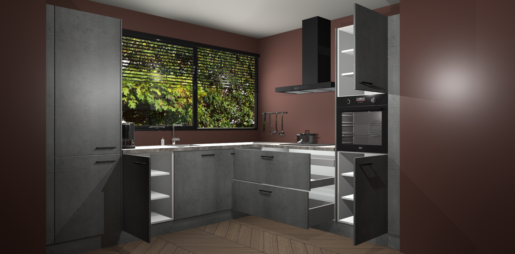 Met een modern, tijdloos design en ruime opslagruimte, zult u zich in no-time thuis voelen in uw nieuwe keuken. Uw leven wordt eenvoudiger met de soft-close deuren die voor het ultieme stille comfort zorgen - geen geluid dat u stoort terwijl u kookt. Ook is de keuken voorzien van 5 ingebouwde apparaten: een oven, inductie kookplaat, afzuigkap, vaatwasser en koelkast. Deze kunnen gemakkelijk na bestelling worden bijgewerkt naar AEG - waardoor uw luxe ervaring compleet is.