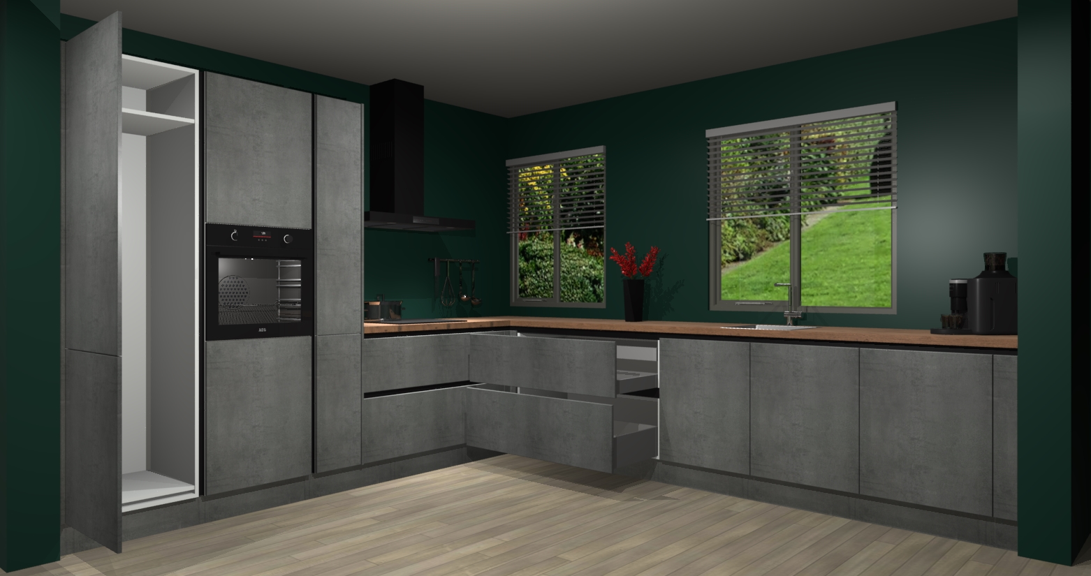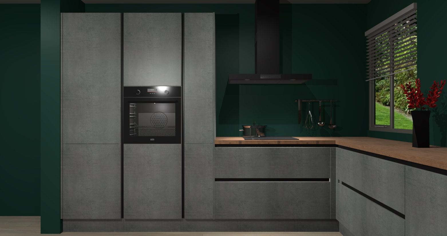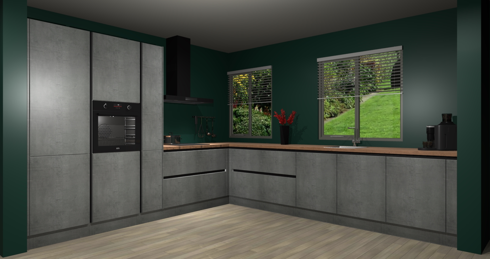 Welkom bij de Beton Parelgrijze keuken Palermo. Deze prachtige keuken zal de komende jaren het middelpunt van de belangstelling in uw huis zijn. Uitgerust met vijf inbouwapparaten komt u nooit kookgereedschap tekort. Bovendien geeft de warme houtlook elke ruimte een uitnodigende en tijdloze uitstraling.