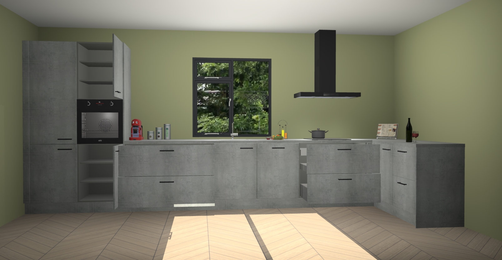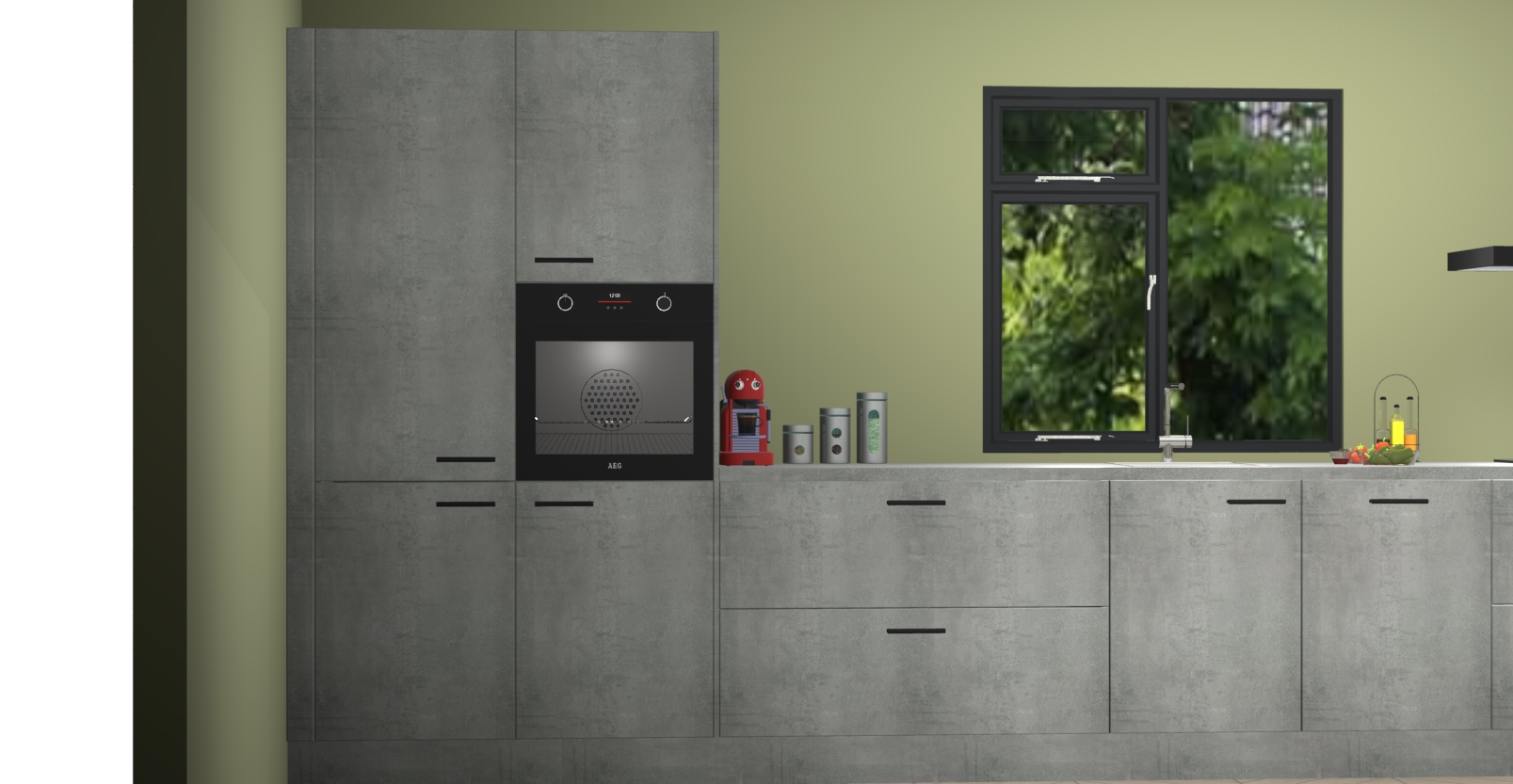 De Beton parelgrijze keuken Lille wordt geleverd met vijf inbouwapparaten - een oven, inductiekookplaat, afzuigkap, vaatwasser en koelkast. Maar dat is nog niet alles! Na bestelling kunnen deze apparaten eenvoudig worden geüpgraded naar premium AEG-apparatuur. Bovendien is er zelfs de optie om de oven te vervangen door een combimagnetron of uw inductiekookplaat te vervangen door een kookplaat met geïntegreerde afzuiging.