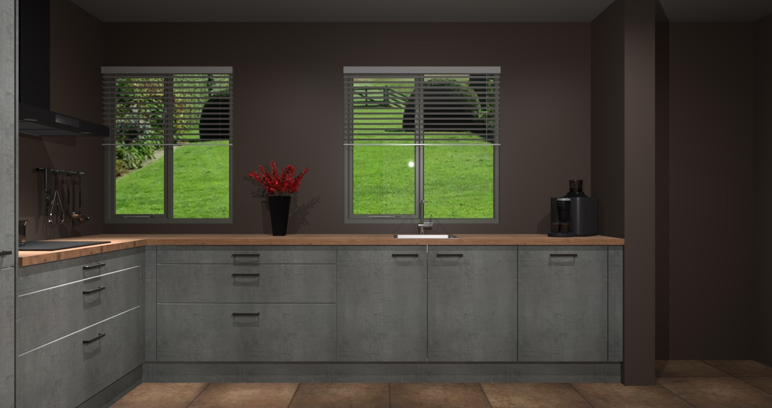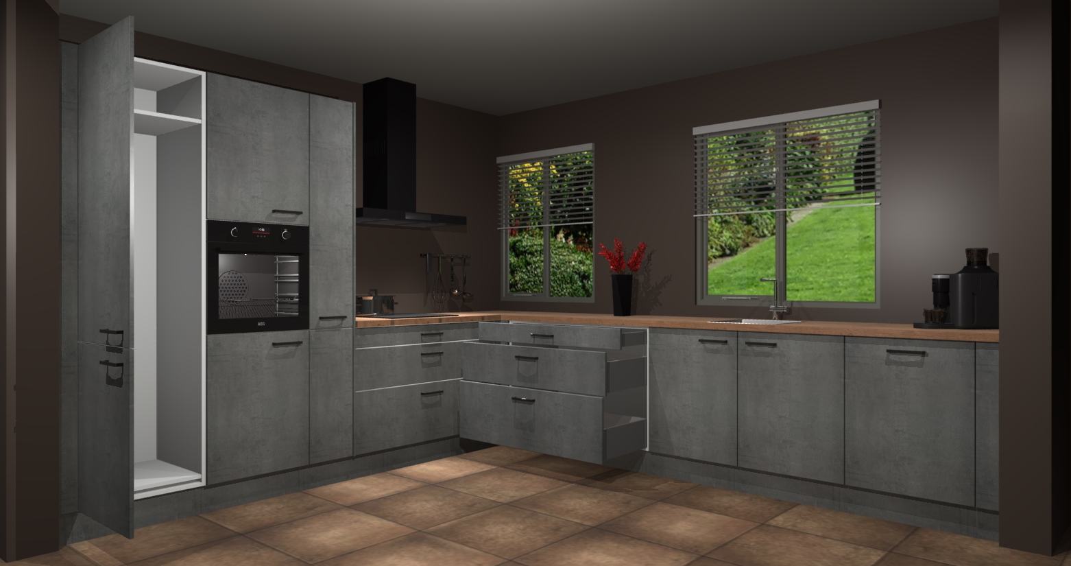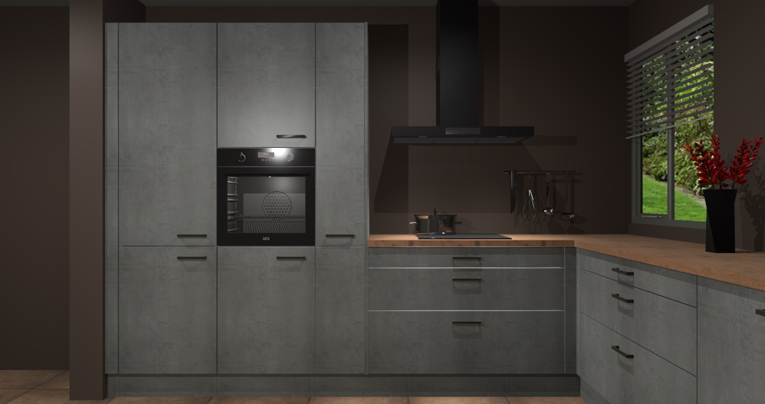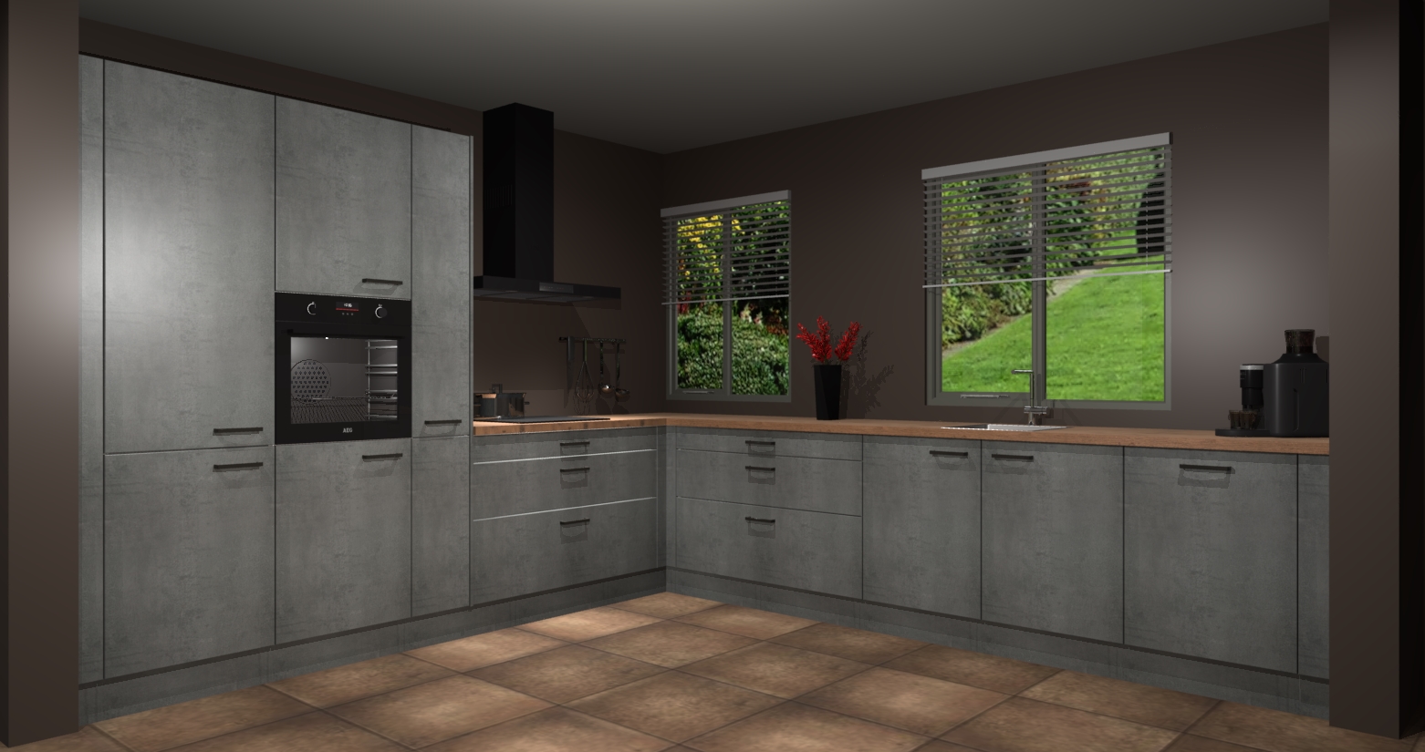 Welkom bij de Beton Parelgrijze keuken Palermo. Deze prachtige keuken zal de komende jaren het middelpunt van de belangstelling in uw huis zijn. Uitgerust met vijf inbouwapparaten komt u nooit kookgereedschap tekort. Bovendien geeft de warme houtlook elke ruimte een uitnodigende en tijdloze uitstraling.