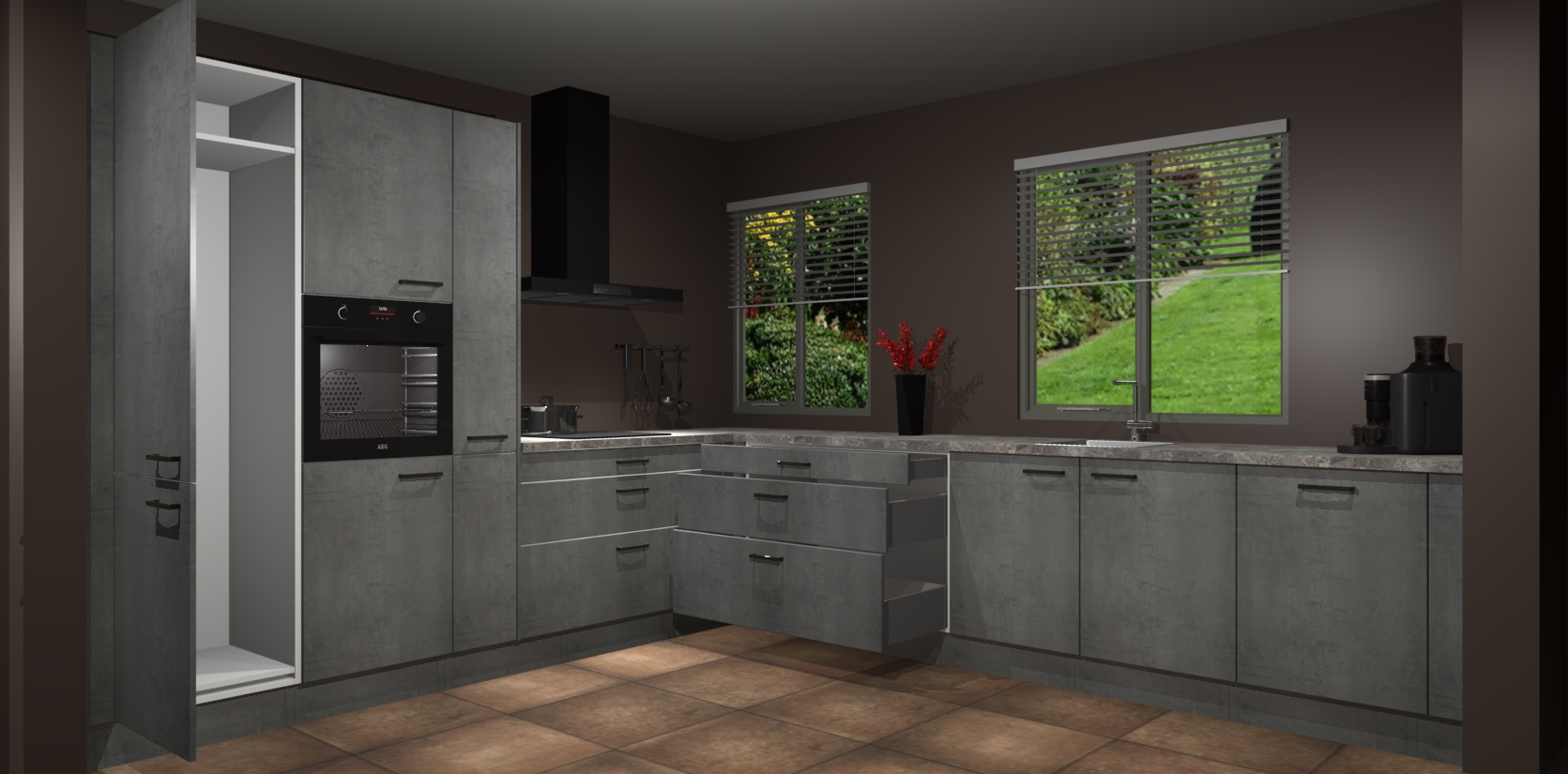 Welkom bij de Beton Parelgrijze keuken Palermo. Deze prachtige keuken zal de komende jaren het middelpunt van de belangstelling in uw huis zijn. Uitgerust met vijf inbouwapparaten komt u nooit kookgereedschap tekort. Bovendien geeft de warme houtlook elke ruimte een uitnodigende en tijdloze uitstraling.