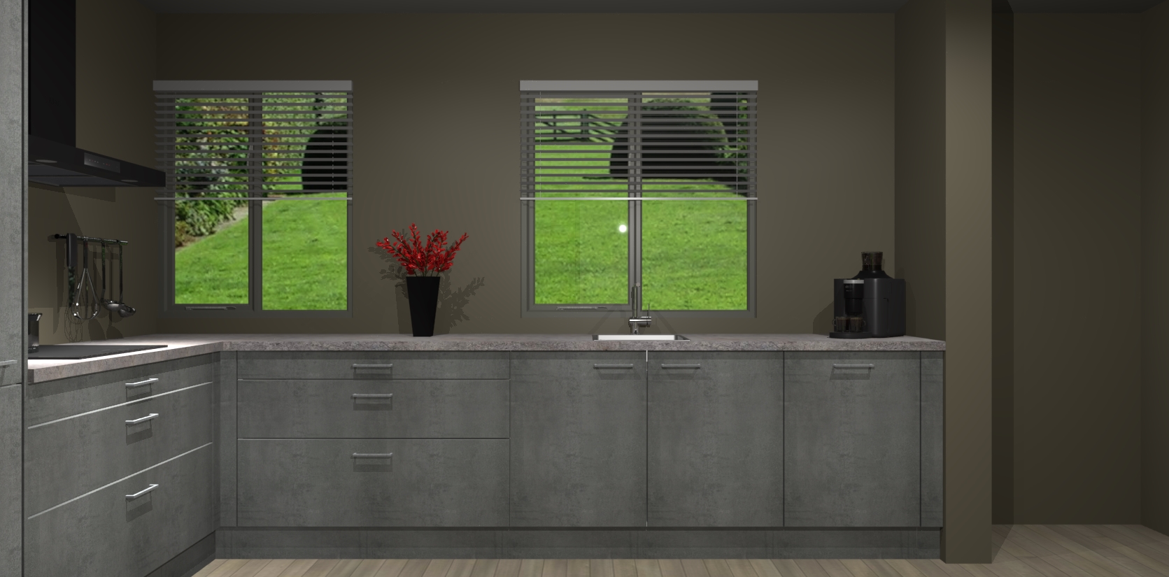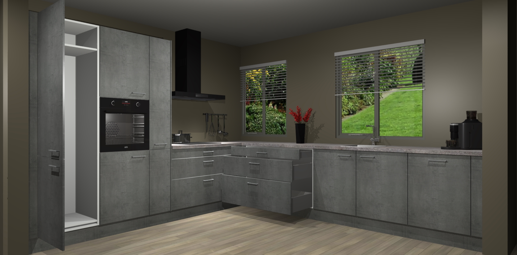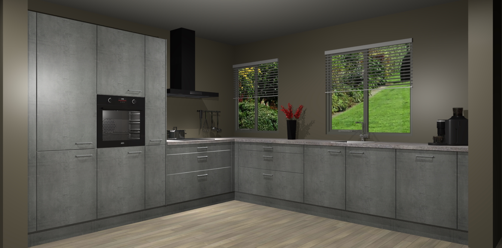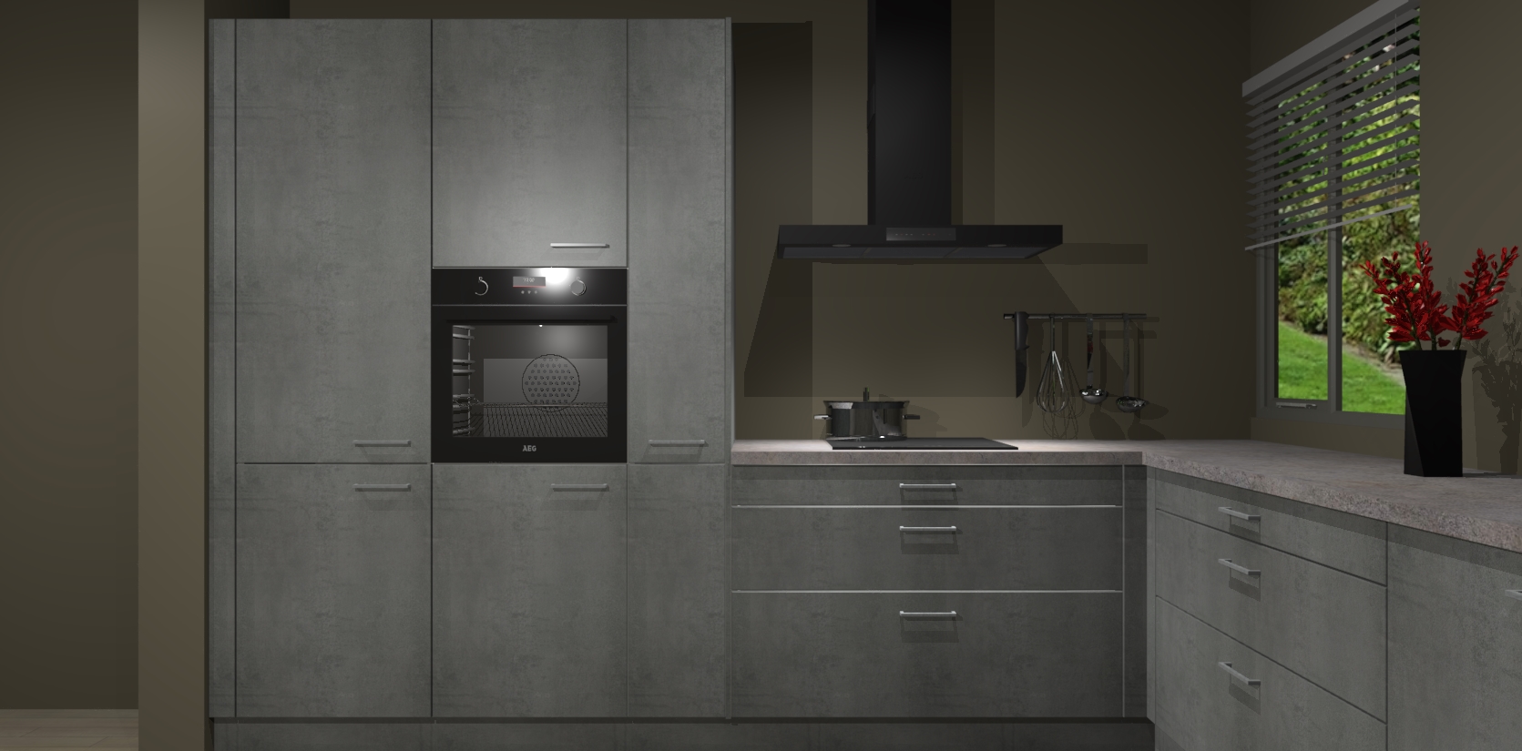 Welkom bij de Beton Parelgrijze keuken Palermo. Deze prachtige keuken zal de komende jaren het middelpunt van de belangstelling in uw huis zijn. Uitgerust met vijf inbouwapparaten komt u nooit kookgereedschap tekort. Bovendien geeft de warme houtlook elke ruimte een uitnodigende en tijdloze uitstraling.