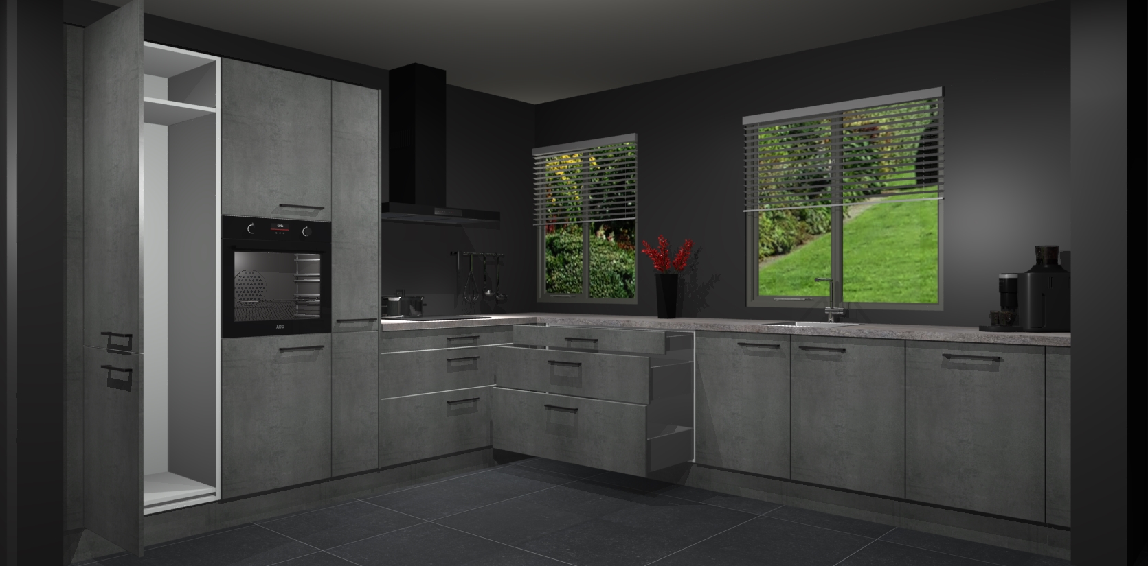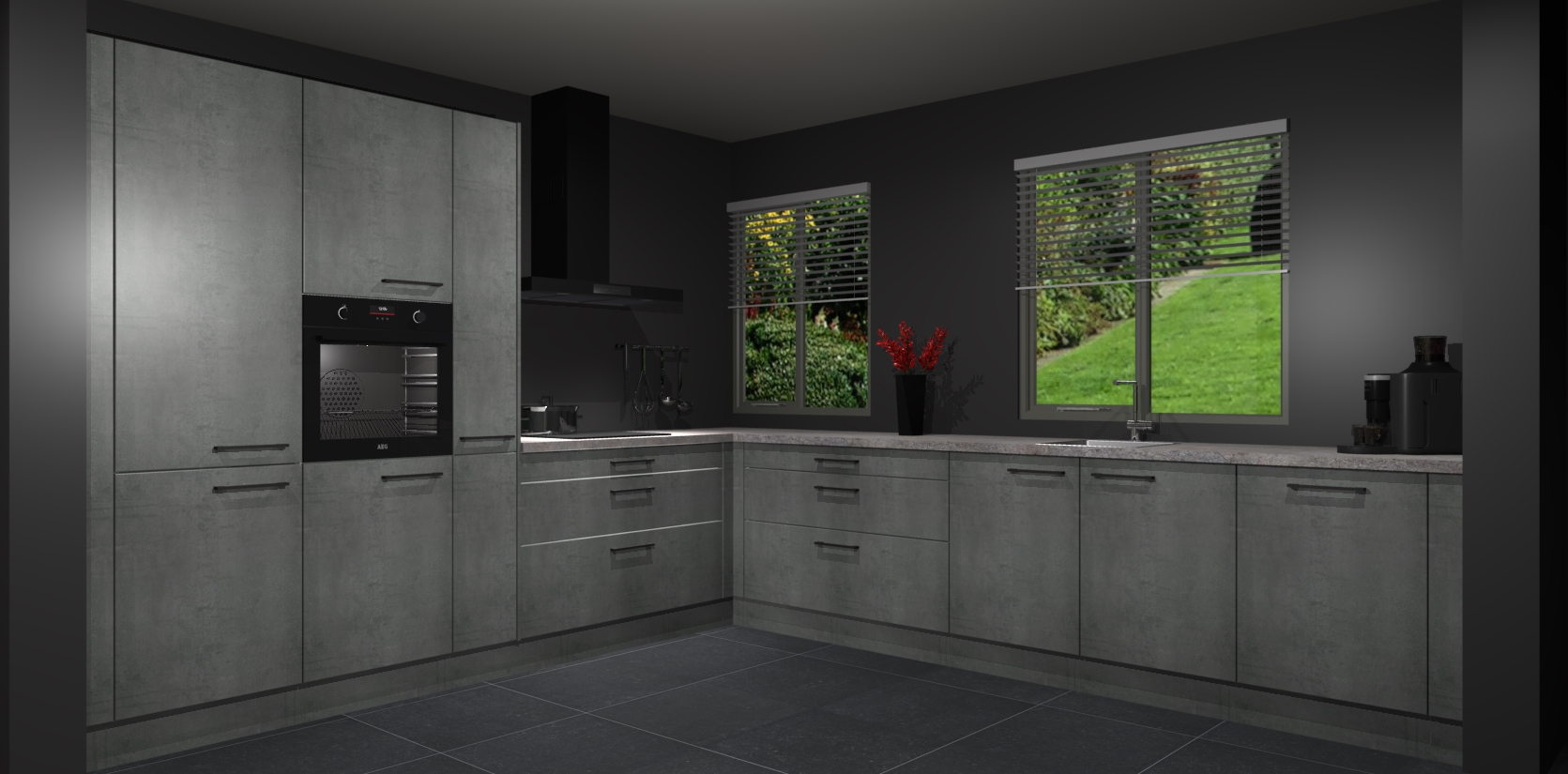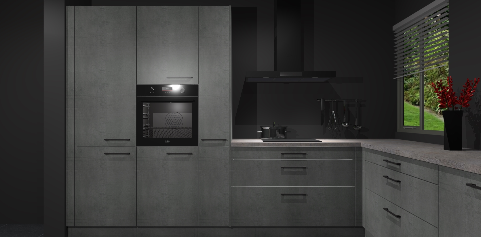 Welkom bij de Beton Parelgrijze keuken Palermo. Deze prachtige keuken zal de komende jaren het middelpunt van de belangstelling in uw huis zijn. Uitgerust met vijf inbouwapparaten komt u nooit kookgereedschap tekort. Bovendien geeft de warme houtlook elke ruimte een uitnodigende en tijdloze uitstraling.