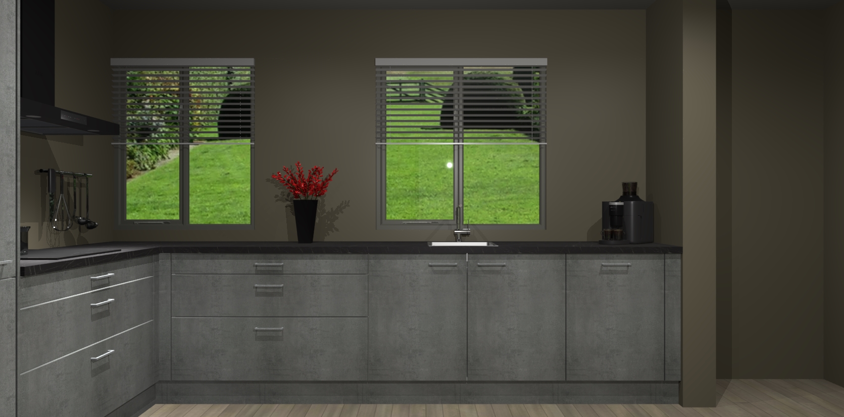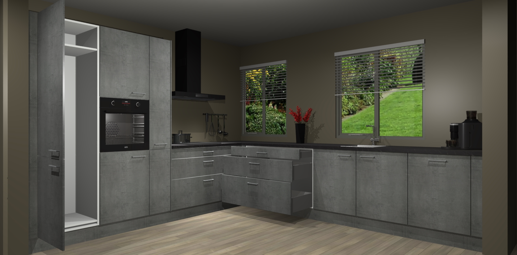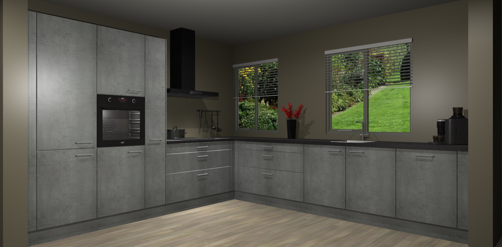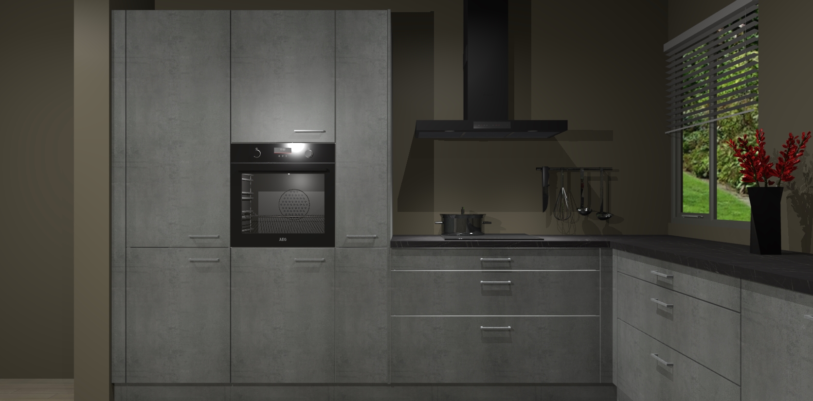Welkom bij de Beton Parelgrijze keuken Palermo. Deze prachtige keuken zal de komende jaren het middelpunt van de belangstelling in uw huis zijn. Uitgerust met vijf inbouwapparaten komt u nooit kookgereedschap tekort. Bovendien geeft de warme houtlook elke ruimte een uitnodigende en tijdloze uitstraling.