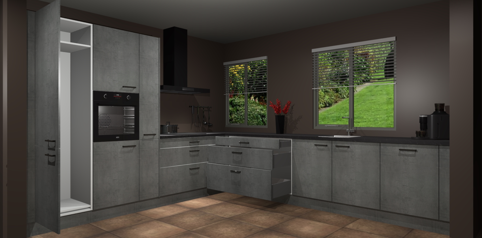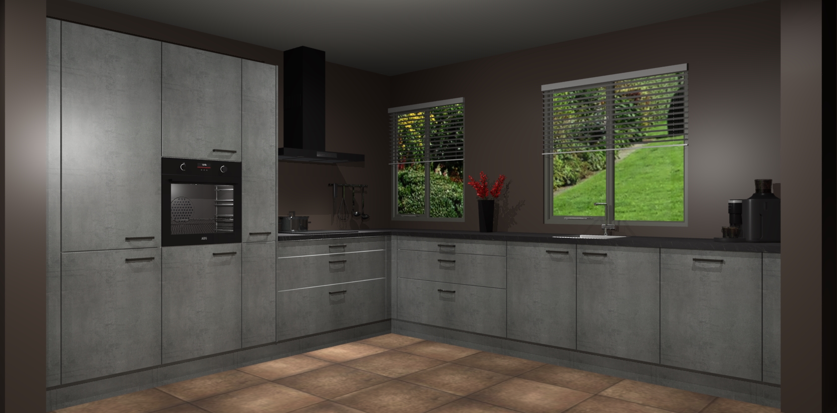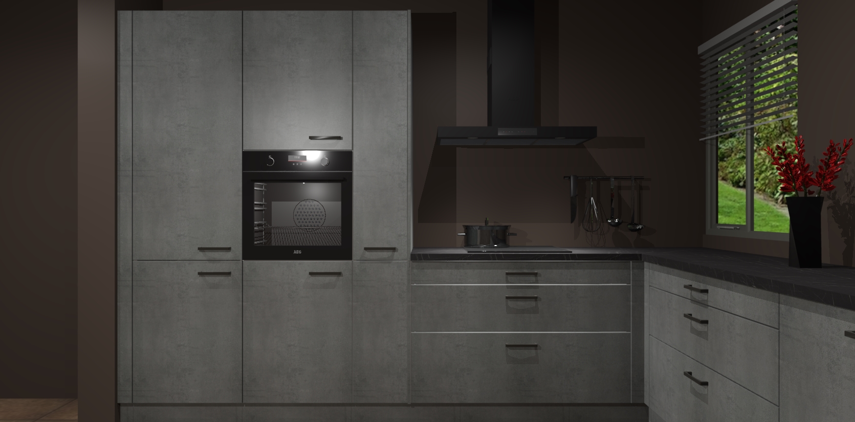 Welkom bij de Beton Parelgrijze keuken Palermo. Deze prachtige keuken zal de komende jaren het middelpunt van de belangstelling in uw huis zijn. Uitgerust met vijf inbouwapparaten komt u nooit kookgereedschap tekort. Bovendien geeft de warme houtlook elke ruimte een uitnodigende en tijdloze uitstraling.