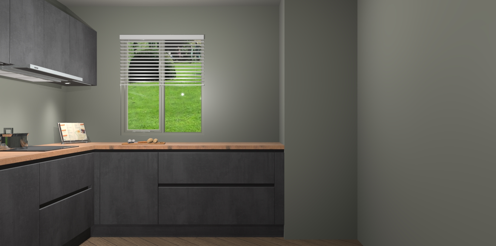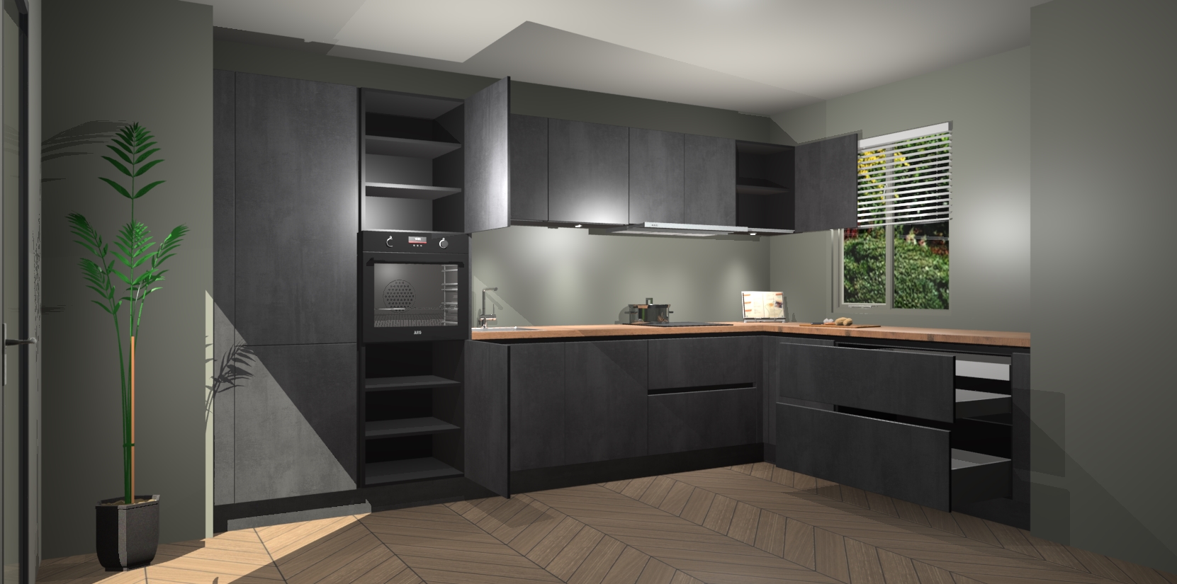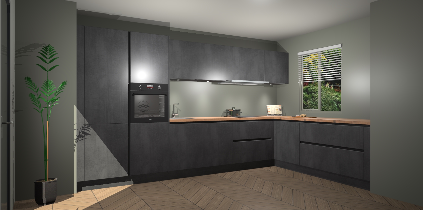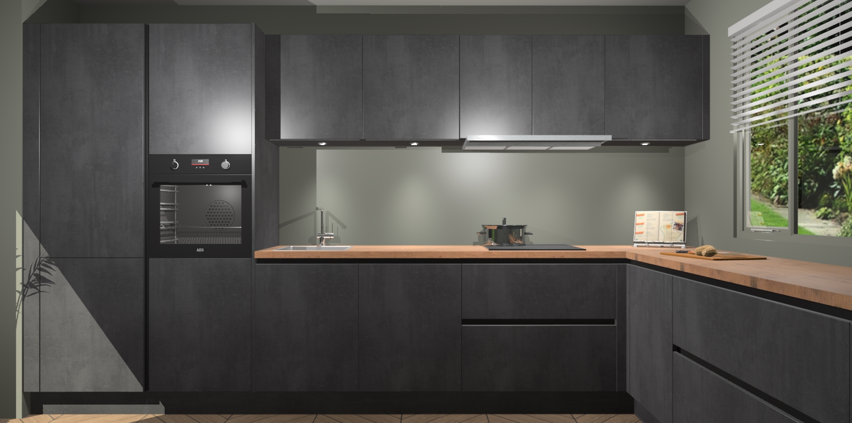 Verwelkom de natuurlijke warmte van de Beton Zwart greeploze keuken Petten in uw huis. Deze prachtige hoekkeuken met zijn moderne design en warme houten look geeft u meer dan genoeg opbergruimte om uw comfortabel te voelen in uw keuken. Geniet van soft-close deuren die al uw gasten het gevoel zullen geven dat ze zich in een luxueuze ruimte bevinden.