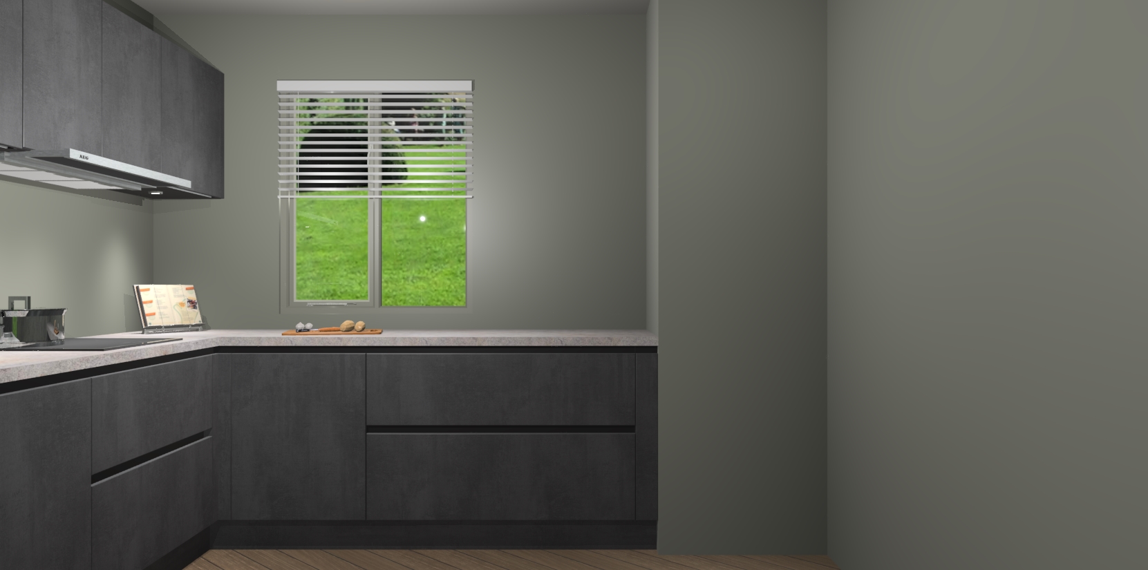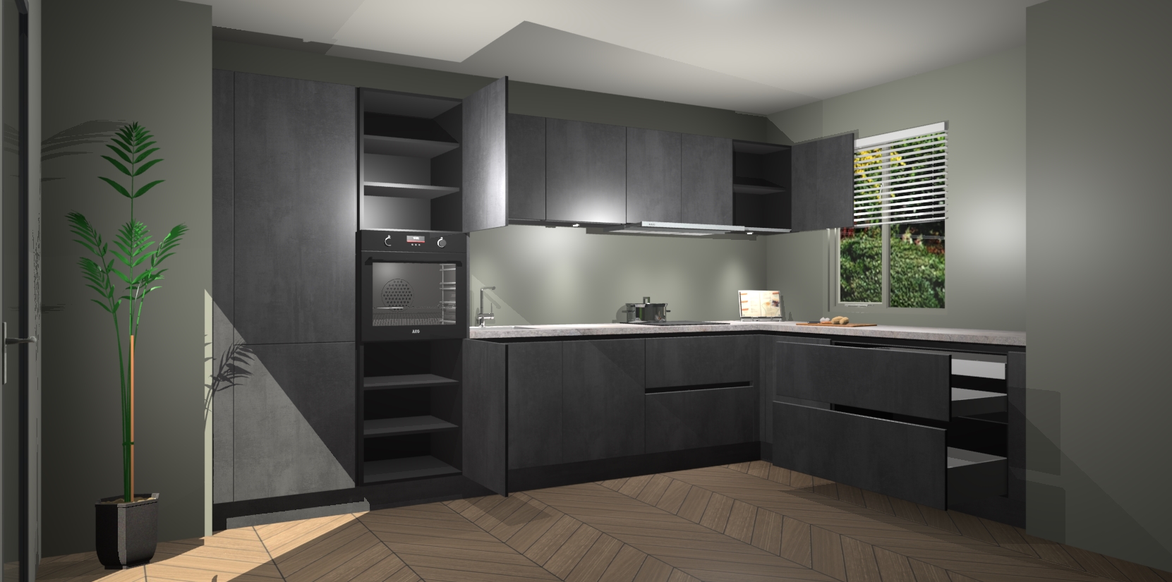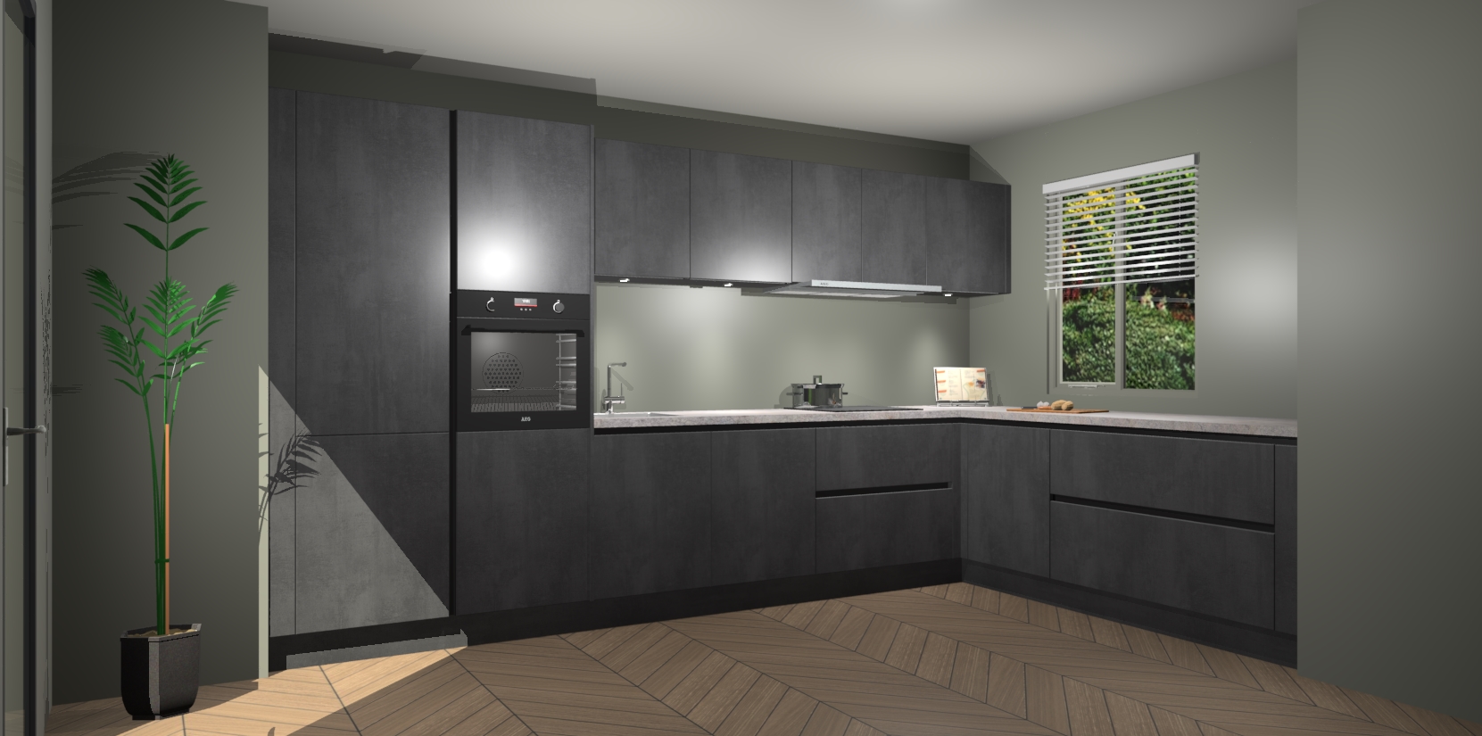 Verwelkom de natuurlijke warmte van de Beton Zwart greeploze keuken Petten in uw huis. Deze prachtige hoekkeuken met zijn moderne design en warme houten look geeft u meer dan genoeg opbergruimte om uw comfortabel te voelen in uw keuken. Geniet van soft-close deuren die al uw gasten het gevoel zullen geven dat ze zich in een luxueuze ruimte bevinden.