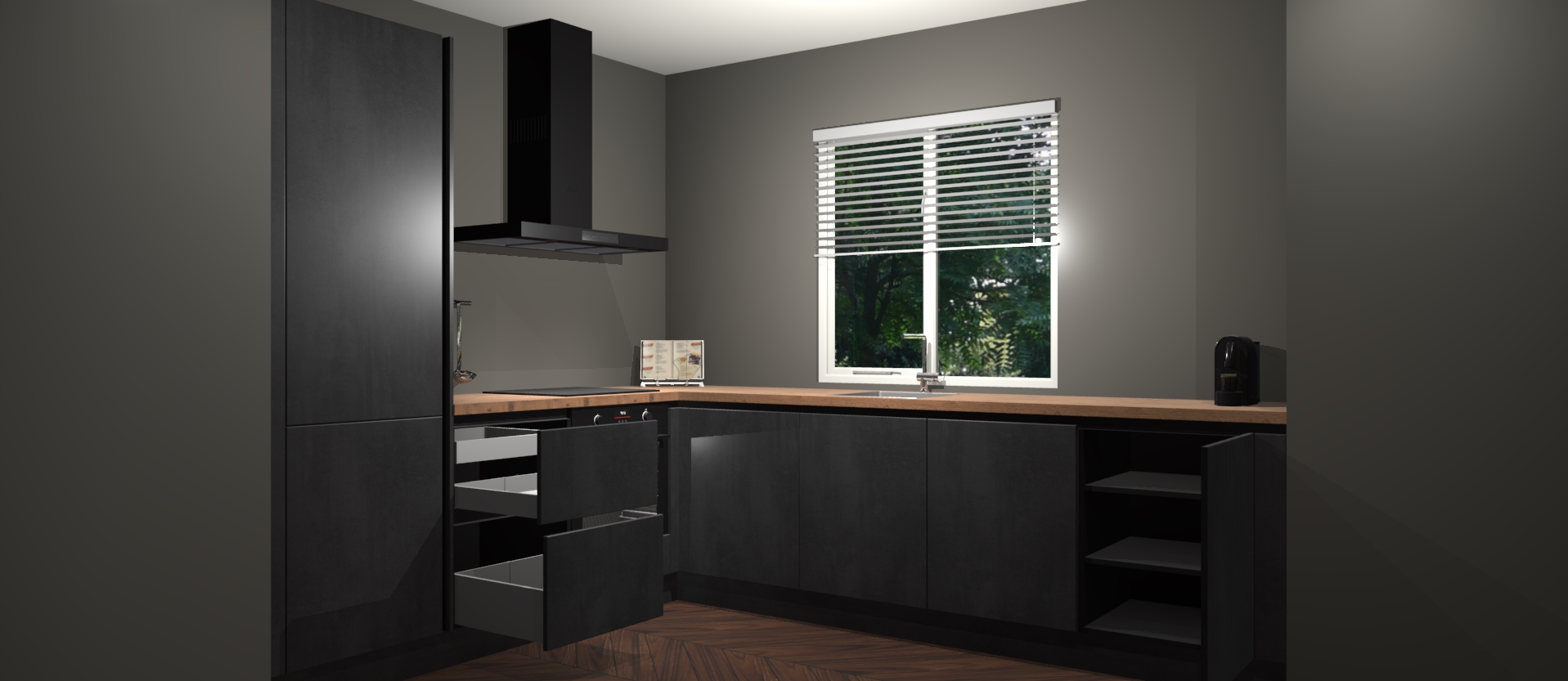 Met de Beton Zwart keuken Doha Maakt u van uw keuken het pronkstuk van uw huis. Stijlvol en toch praktisch, de nieuwste look voor wie meer waarde en charme aan zijn huis wil toevoegen. Met prachtige zwarte handgrepen die zich lenen voor een klassieke stijlbron, zal u niet teleurgesteld zijn in het resultaat. De soft-close deurscharnieren geven een gevoel van luxe omdat ze zachtjes bewegen zonder storende of krakende geluiden te veroorzaken.