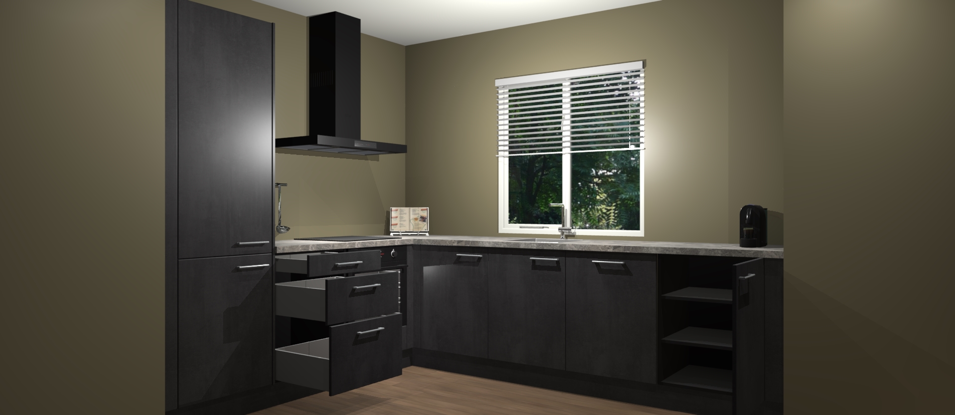 Maak kennis met de Beton Zwart keuken Doha - de perfecte aanvulling voor uw moderne keuken! Ervaar tijdloos design, elegantie en een chique uitstraling met onze zwarte handgrepen, soft-close deuren en veel opbergruimte. Dit alles wordt aangeboden tegen een vaste lage prijs voor ongeëvenaarde Duitse keukenkwaliteit!