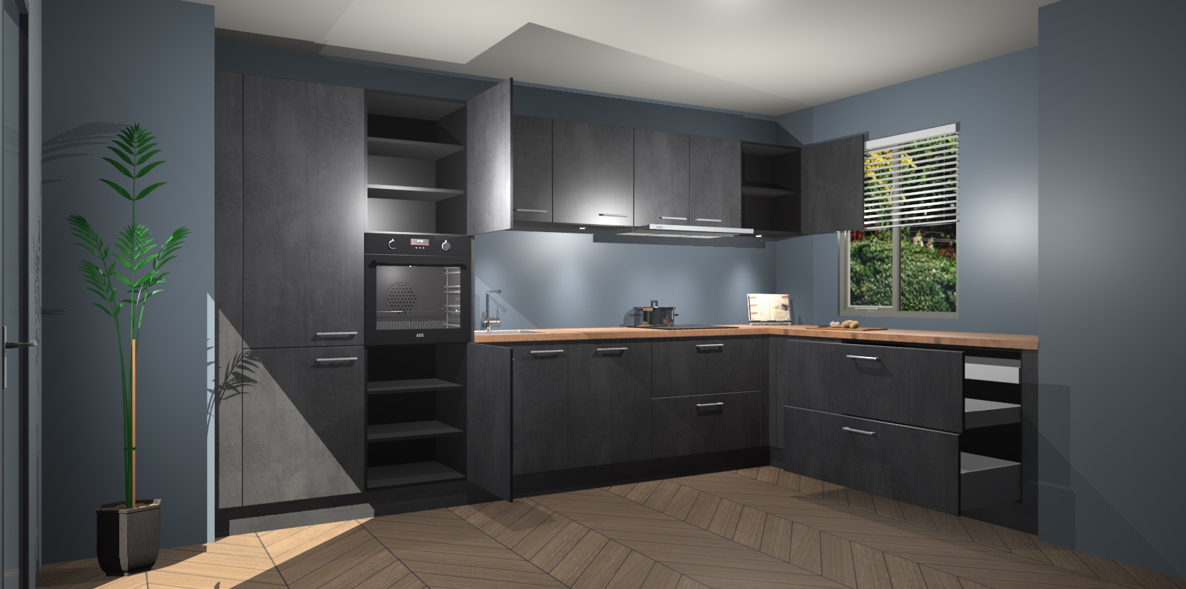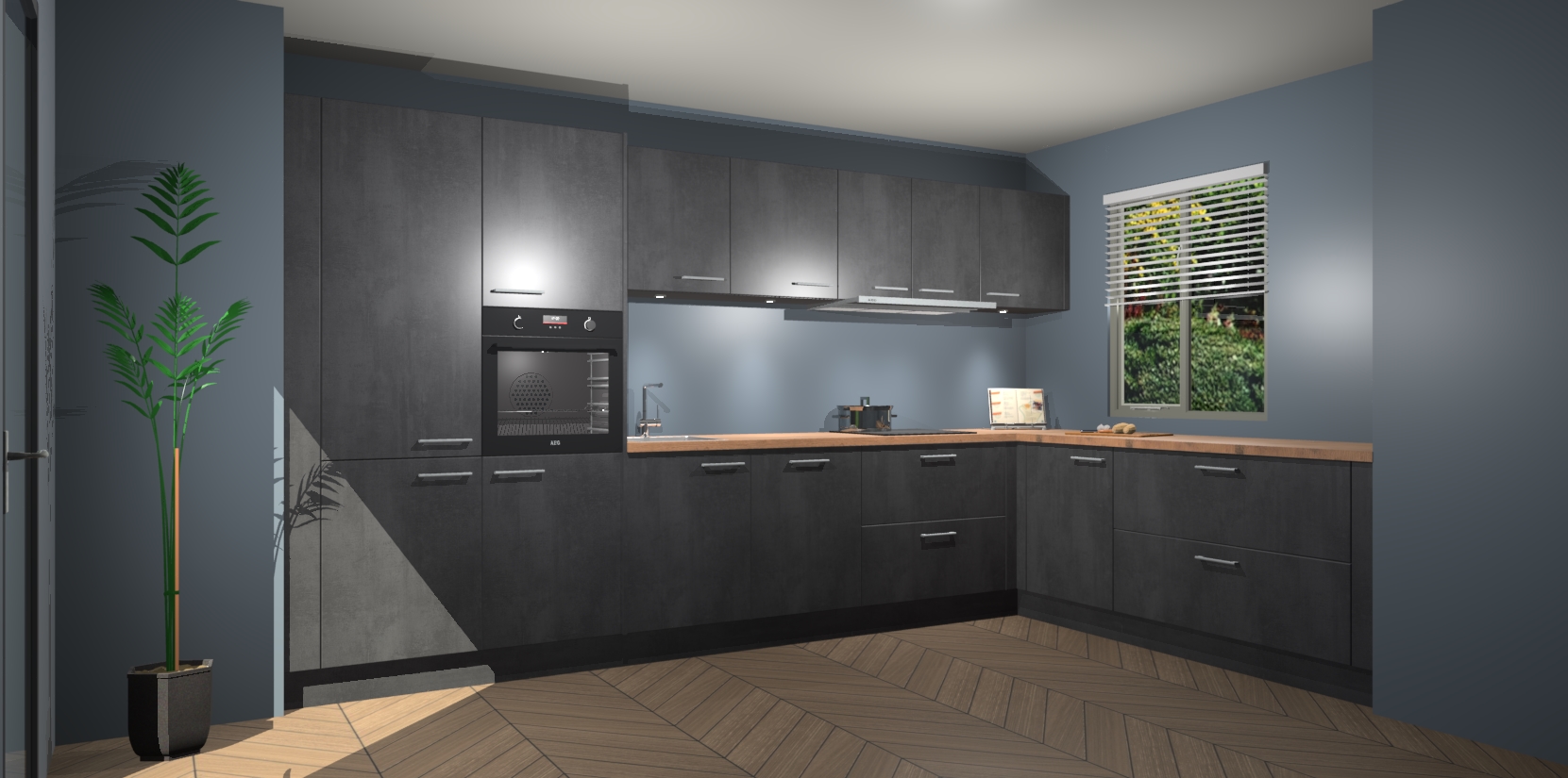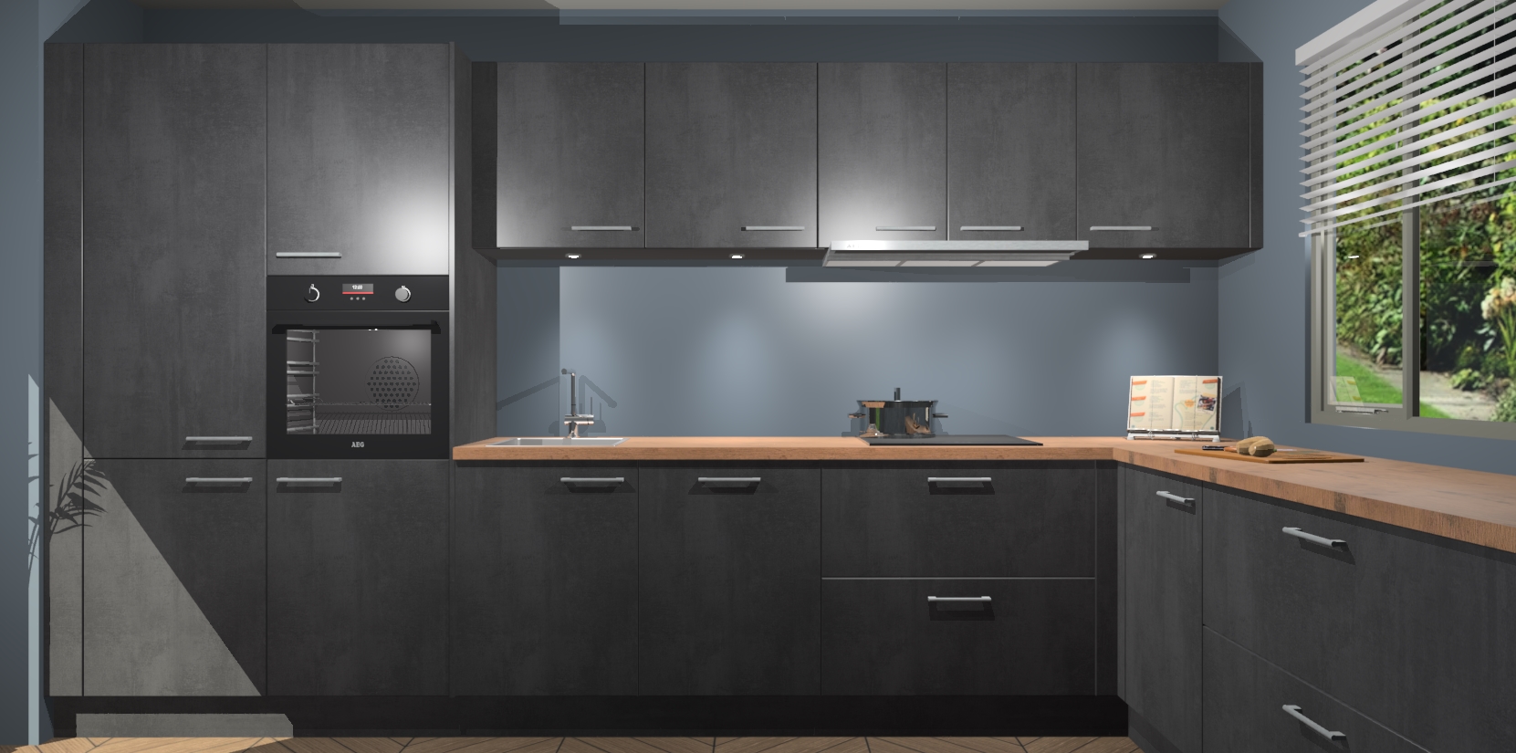 Verwelkom de natuurlijke warmte van de Beton Zwart keuken Petten in uw huis. Deze prachtige hoekkeuken met zijn moderne design en warme houten look geeft u meer dan genoeg opbergruimte om uw comfortabel te voelen in uw keuken. Geniet van soft-close deuren die al uw gasten het gevoel zullen geven dat ze zich in een luxueuze ruimte bevinden.