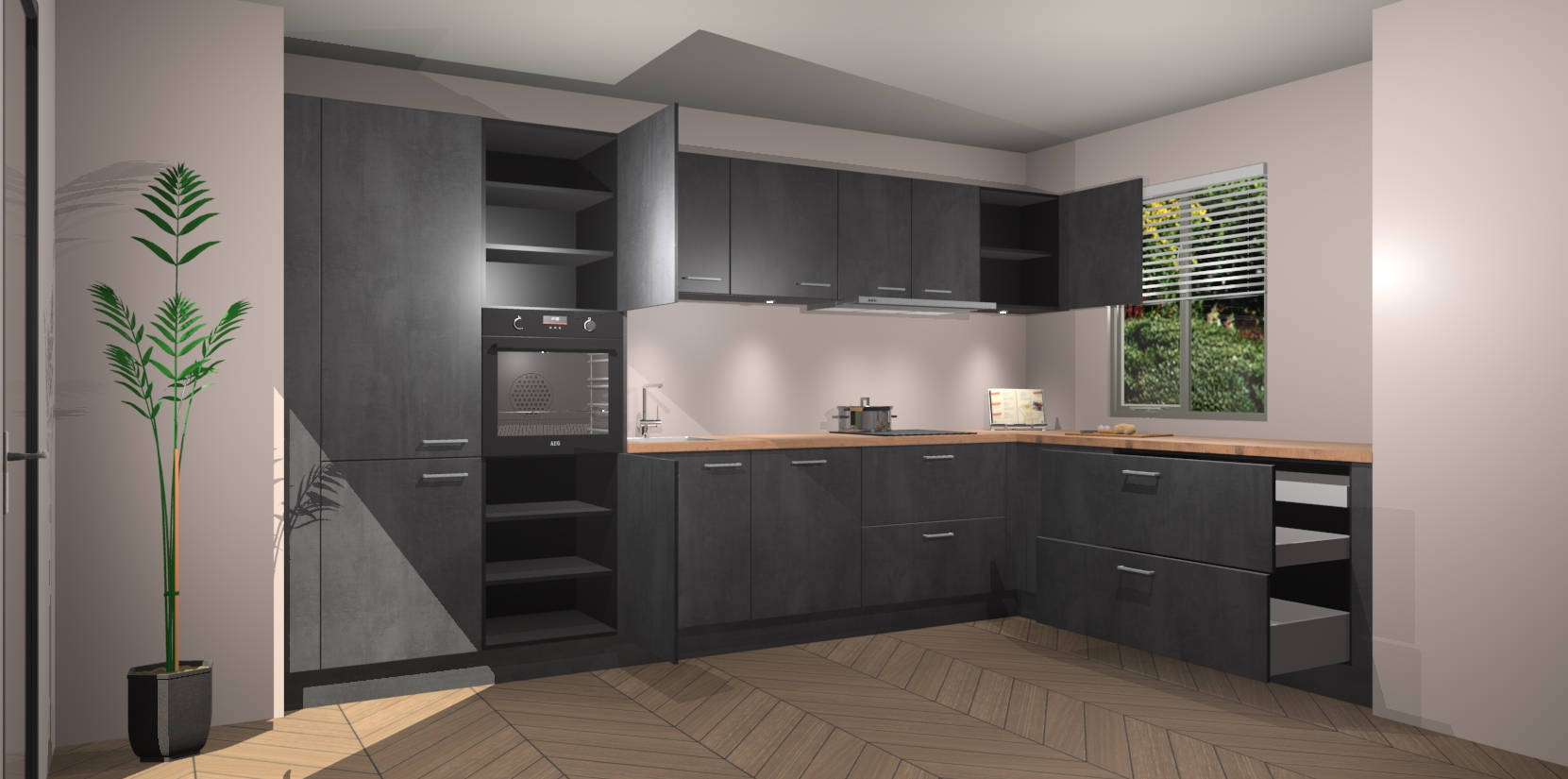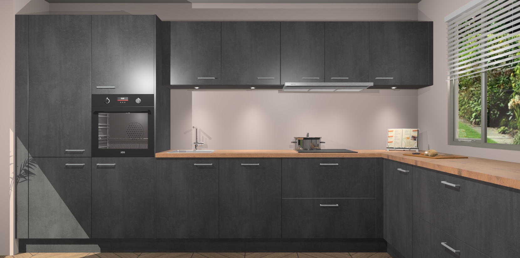 Verwelkom de natuurlijke warmte van de Beton Zwart keuken Petten in uw huis. Deze prachtige hoekkeuken met zijn moderne design en warme houten look geeft u meer dan genoeg opbergruimte om uw comfortabel te voelen in uw keuken. Geniet van soft-close deuren die al uw gasten het gevoel zullen geven dat ze zich in een luxueuze ruimte bevinden.