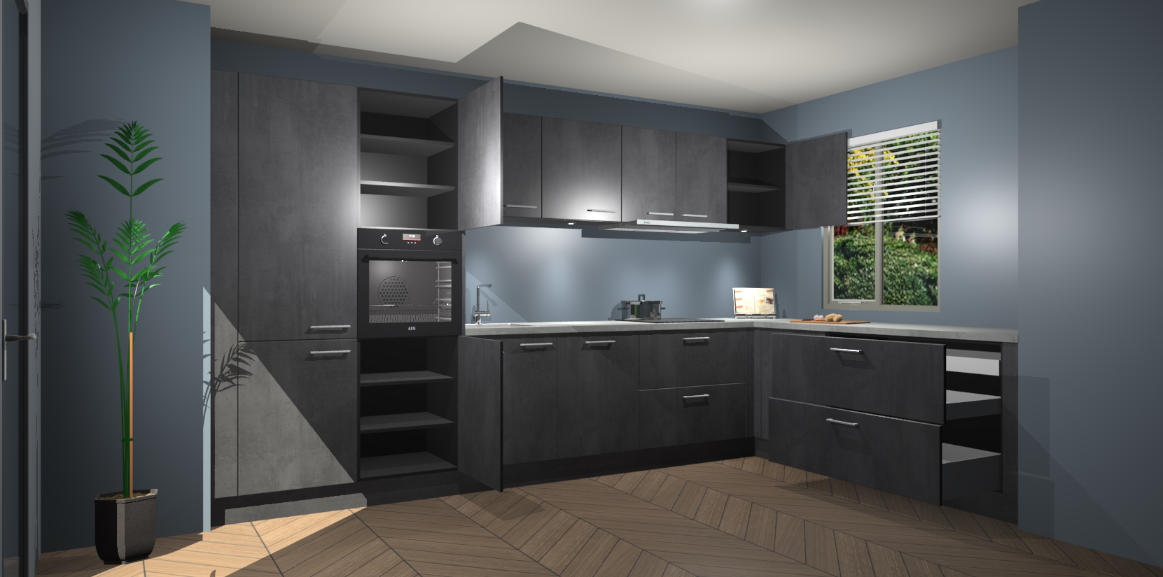 Verwelkom de natuurlijke warmte van de Beton Zwart keuken Petten in uw huis. Deze prachtige hoekkeuken met zijn moderne design en warme houten look geeft u meer dan genoeg opbergruimte om uw comfortabel te voelen in uw keuken. Geniet van soft-close deuren die al uw gasten het gevoel zullen geven dat ze zich in een luxueuze ruimte bevinden.