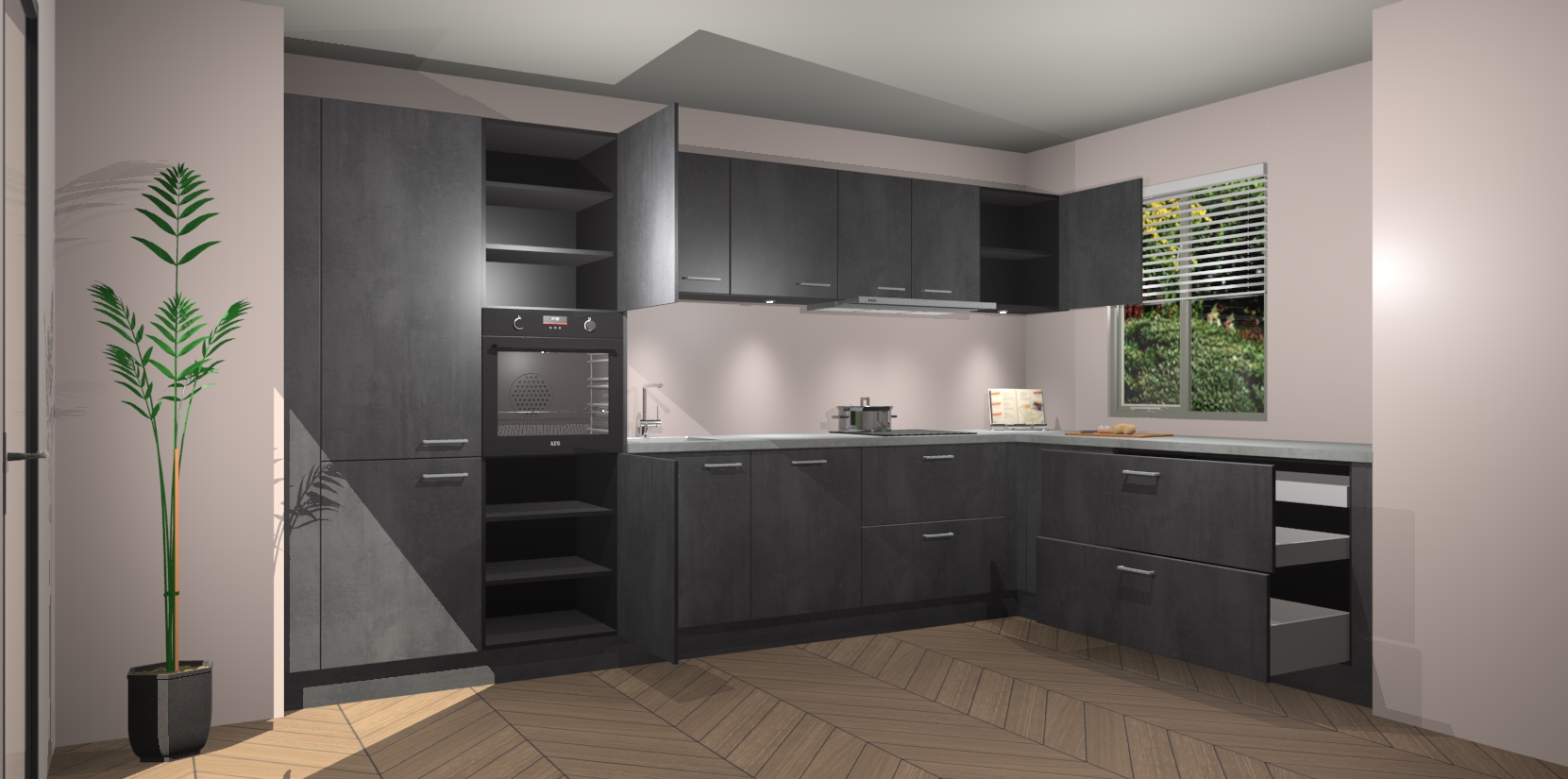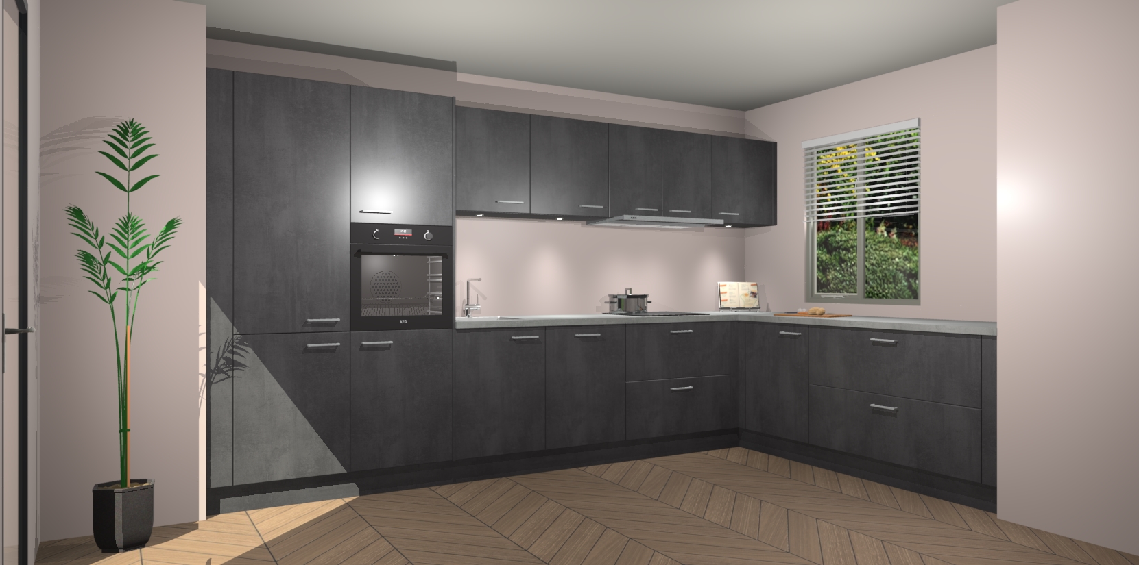 Verwelkom de natuurlijke warmte van de Beton Zwart keuken Petten in uw huis. Deze prachtige hoekkeuken met zijn moderne design en warme houten look geeft u meer dan genoeg opbergruimte om uw comfortabel te voelen in uw keuken. Geniet van soft-close deuren die al uw gasten het gevoel zullen geven dat ze zich in een luxueuze ruimte bevinden.