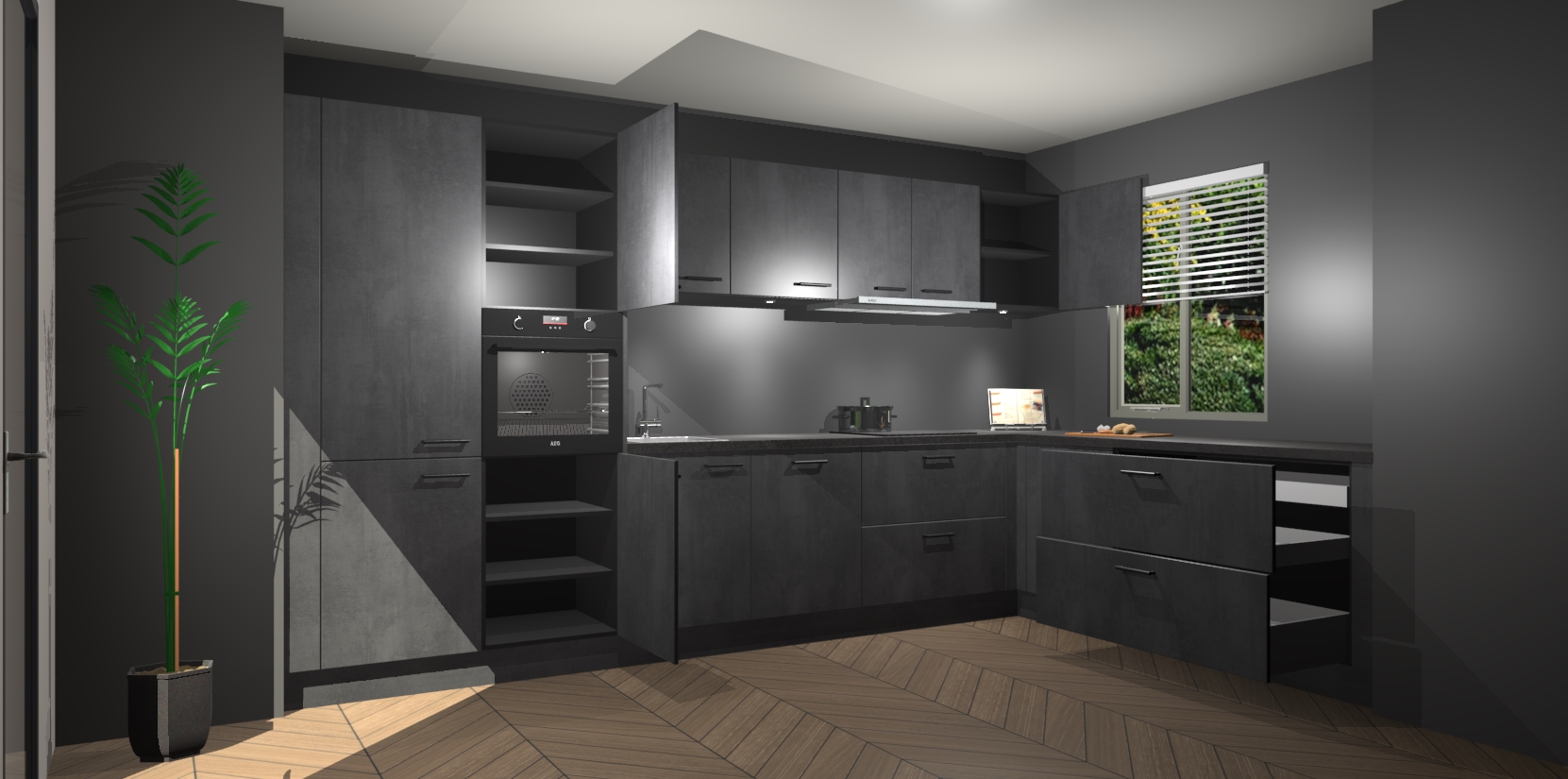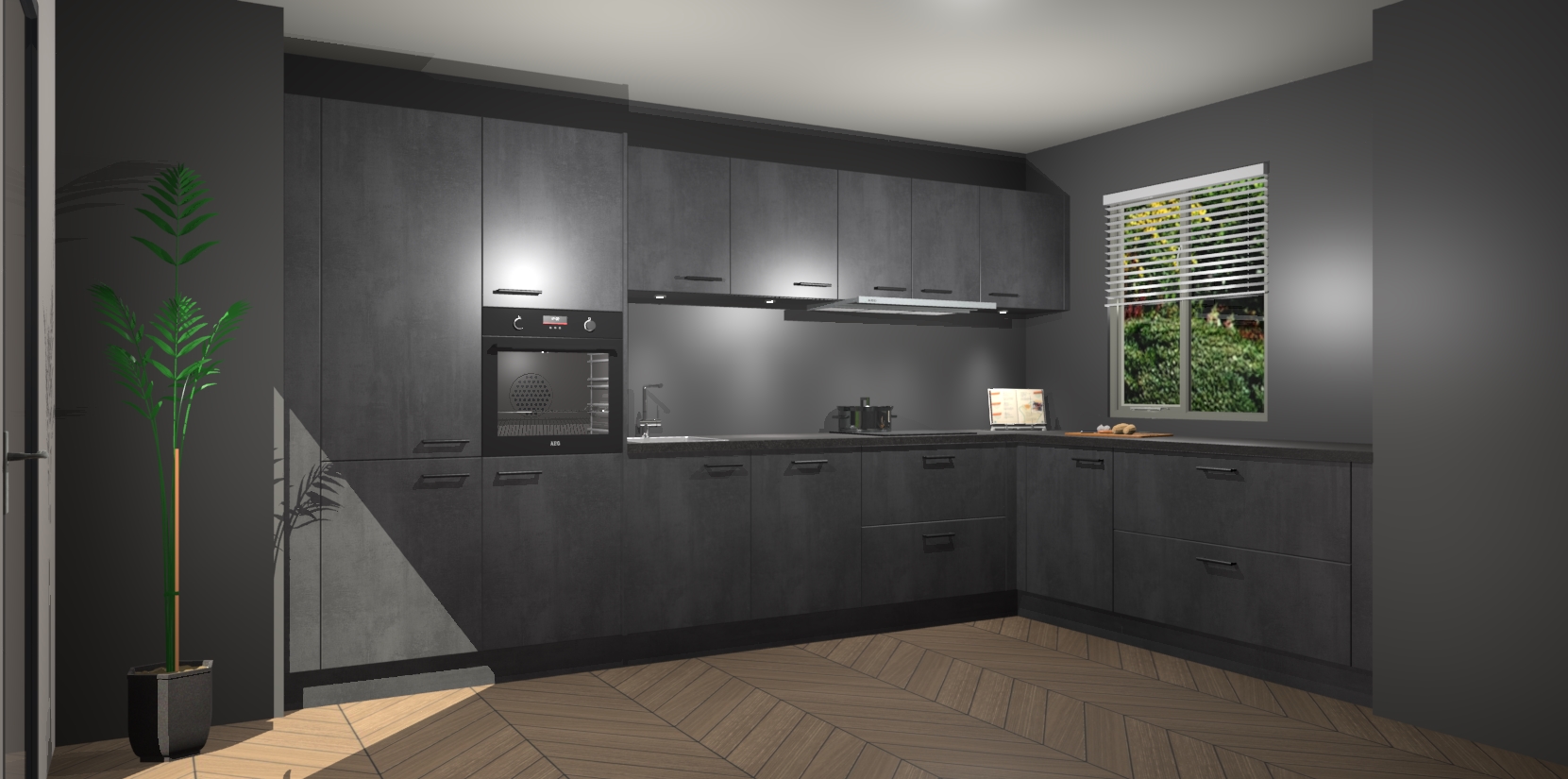 Verwelkom de natuurlijke warmte van de Beton Zwart keuken Petten in uw huis. Deze prachtige hoekkeuken met zijn moderne design en warme houten look geeft u meer dan genoeg opbergruimte om uw comfortabel te voelen in uw keuken. Geniet van soft-close deuren die al uw gasten het gevoel zullen geven dat ze zich in een luxueuze ruimte bevinden.