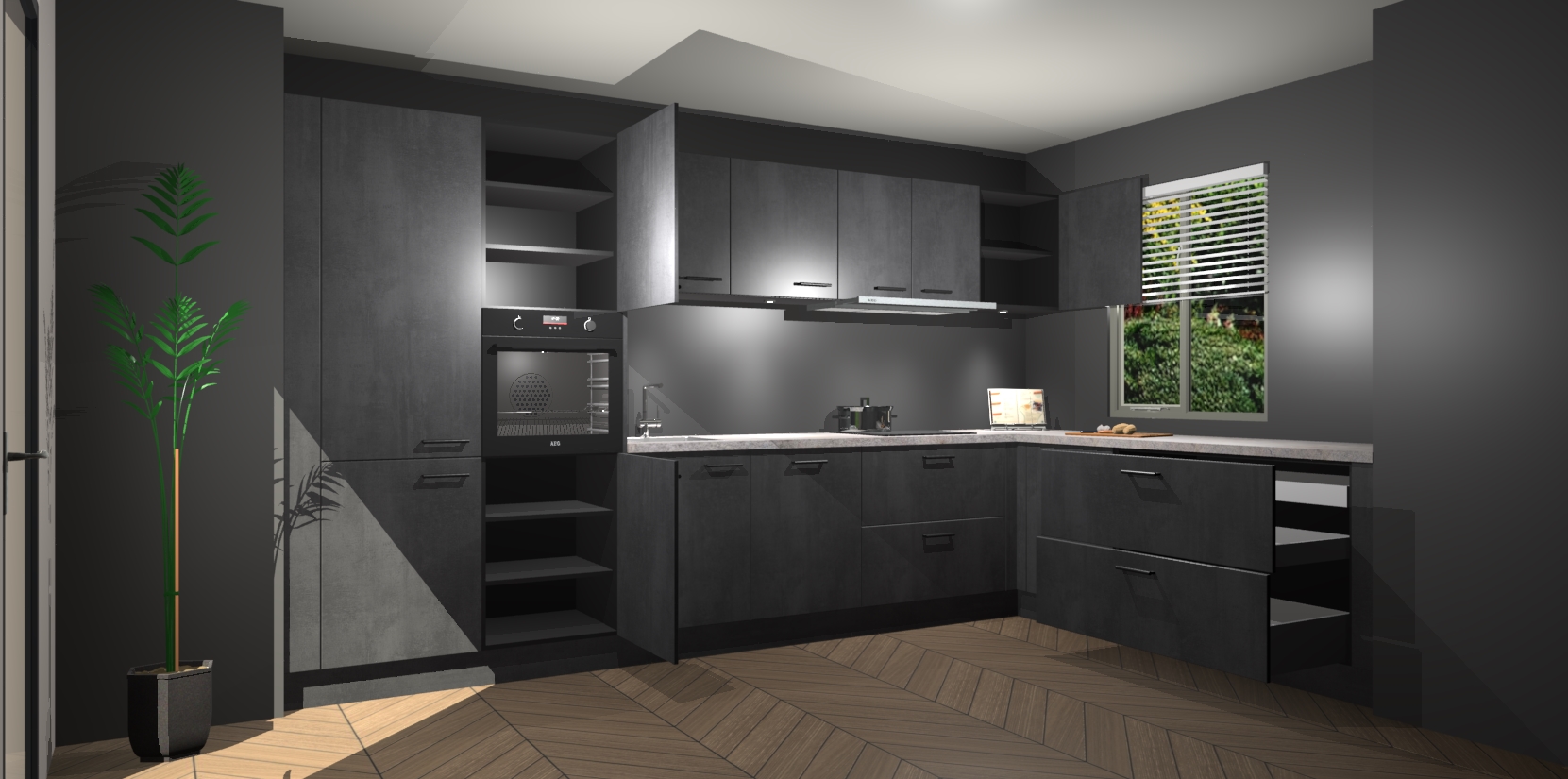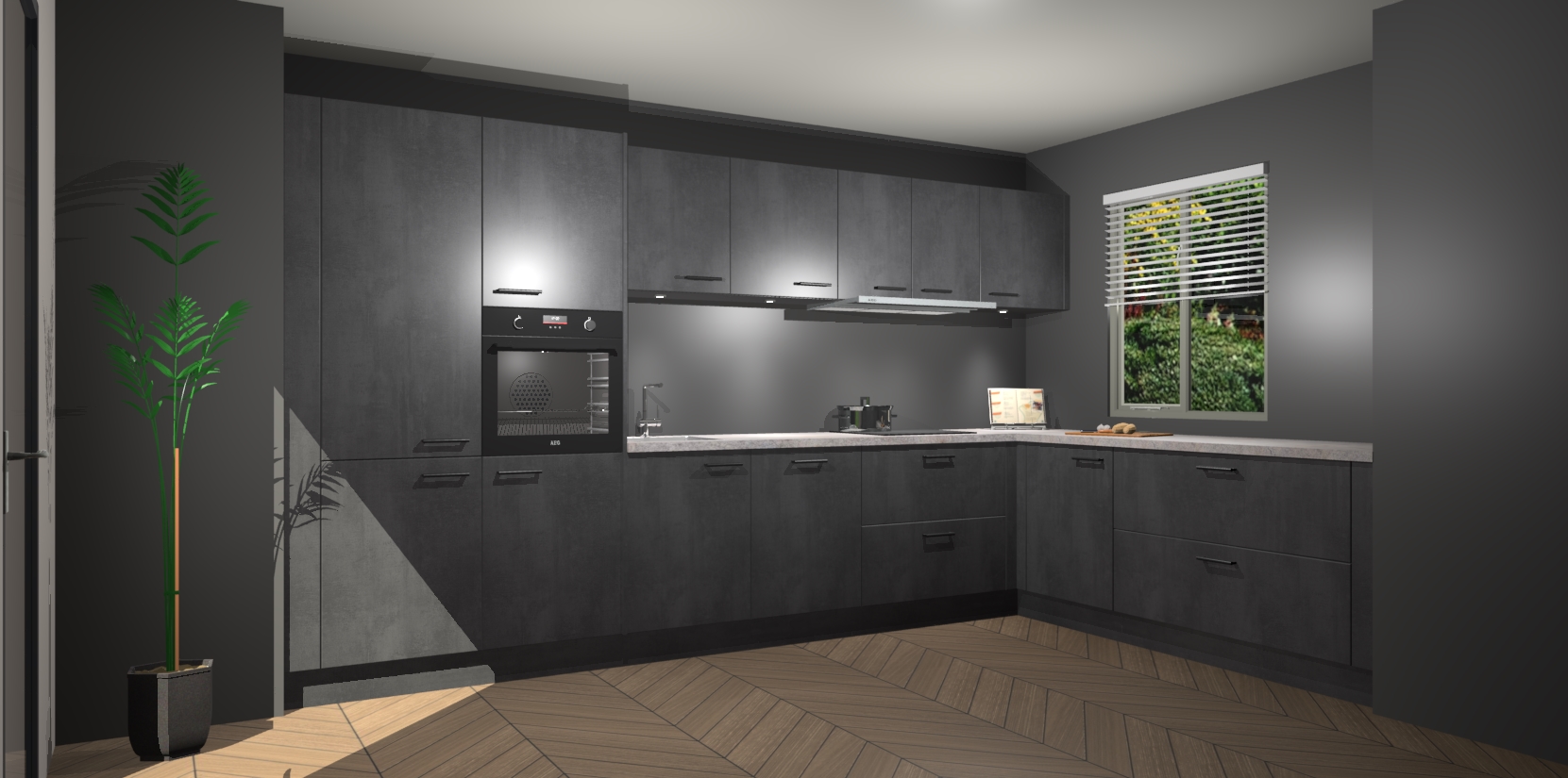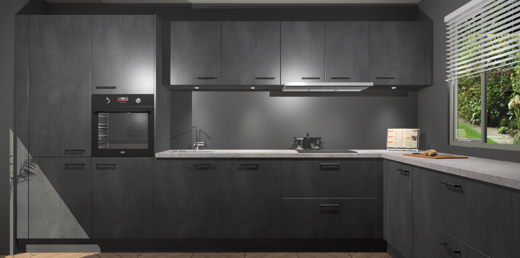 Verwelkom de natuurlijke warmte van de Beton Zwart keuken Petten in uw huis. Deze prachtige hoekkeuken met zijn moderne design en warme houten look geeft u meer dan genoeg opbergruimte om uw comfortabel te voelen in uw keuken. Geniet van soft-close deuren die al uw gasten het gevoel zullen geven dat ze zich in een luxueuze ruimte bevinden.