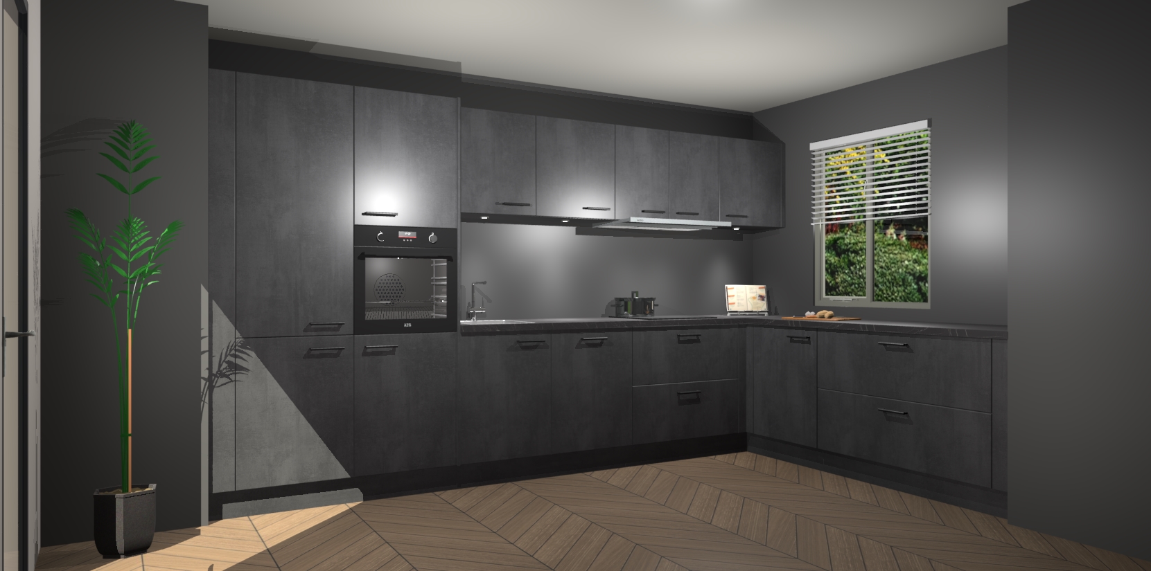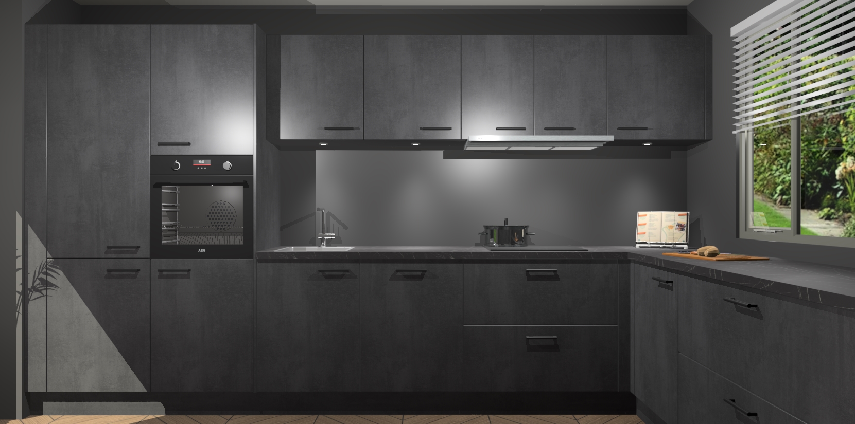 Verwelkom de natuurlijke warmte van de Beton Zwart keuken Petten in uw huis. Deze prachtige hoekkeuken met zijn moderne design en warme houten look geeft u meer dan genoeg opbergruimte om uw comfortabel te voelen in uw keuken. Geniet van soft-close deuren die al uw gasten het gevoel zullen geven dat ze zich in een luxueuze ruimte bevinden.