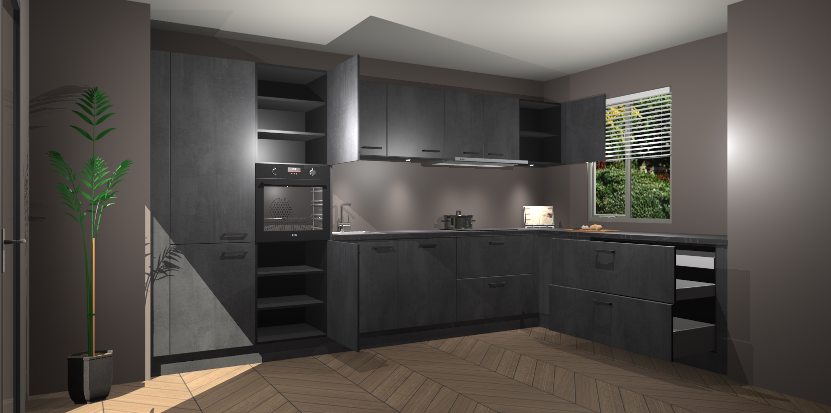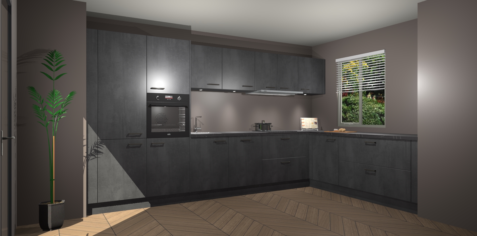 Verwelkom de natuurlijke warmte van de Beton Zwart keuken Petten in uw huis. Deze prachtige hoekkeuken met zijn moderne design en warme houten look geeft u meer dan genoeg opbergruimte om uw comfortabel te voelen in uw keuken. Geniet van soft-close deuren die al uw gasten het gevoel zullen geven dat ze zich in een luxueuze ruimte bevinden.