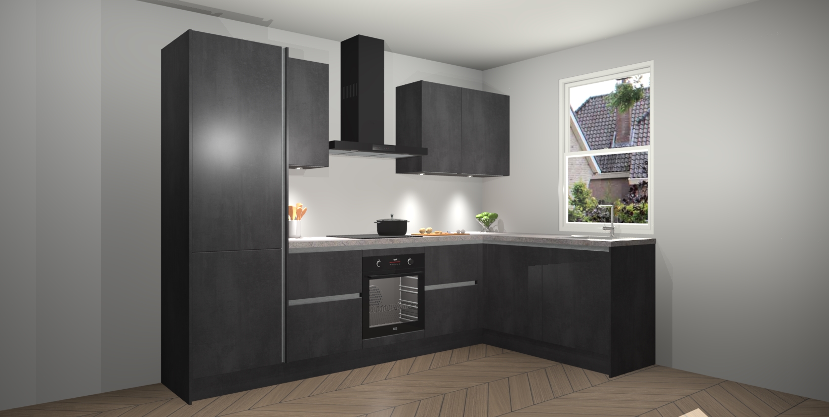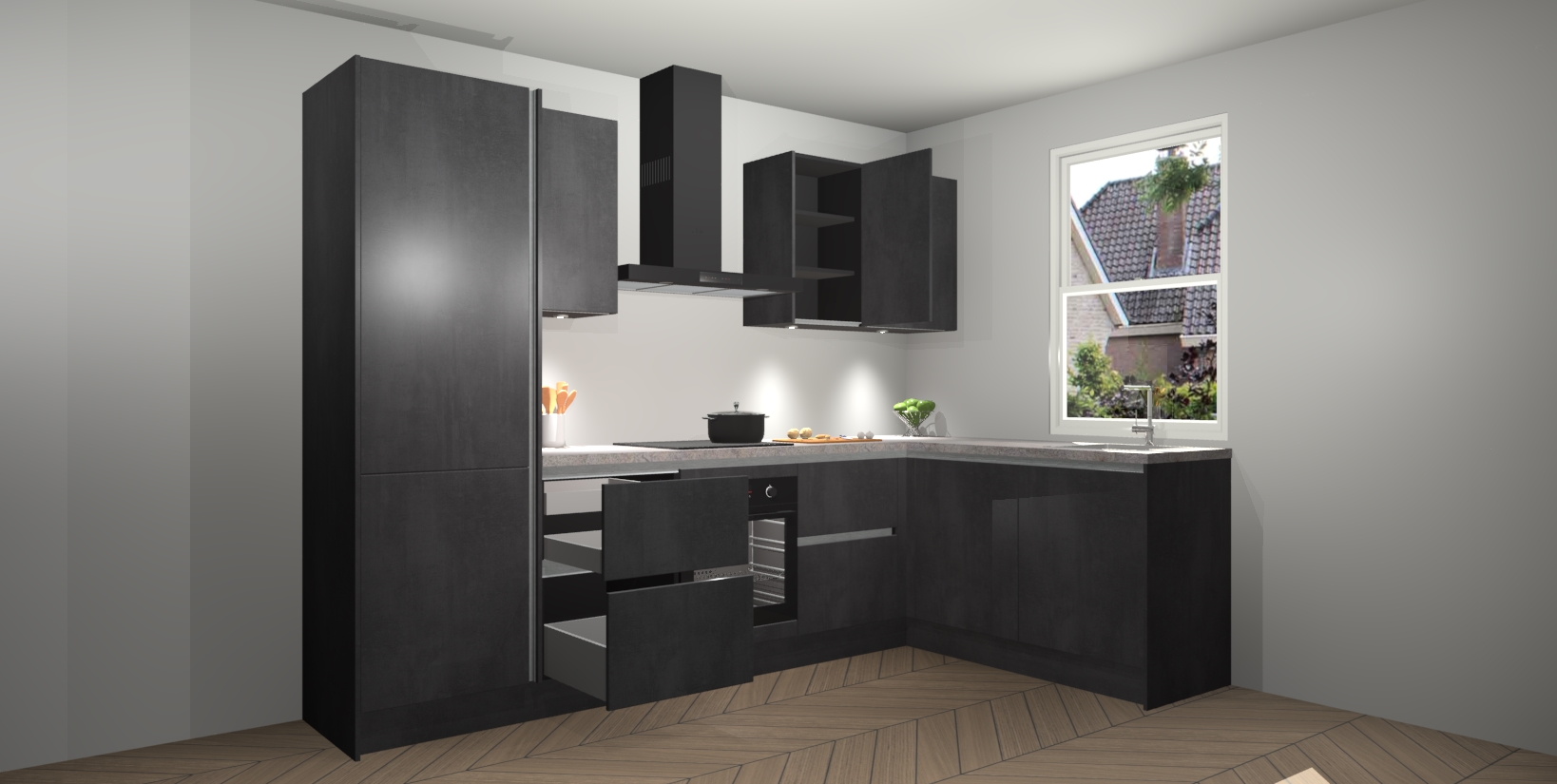 Maak kennis met de trendsettende en luxe Beton Zwarte greeploze keuken Bazel! Deze uitzonderlijke keuken van Duitse kwaliteit is stijlvol, modern en perfect om elk huis mee op te fleuren. De binnenkant van de kasten worden meegenomen in een bijpassende kleur om een samenhangende eigentijdse esthetiek te voltooien. U zult dol zijn op hoe uw pas gerenoveerde keuken eruitziet met de Beton Zwarte editie!