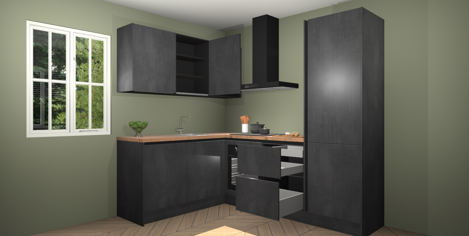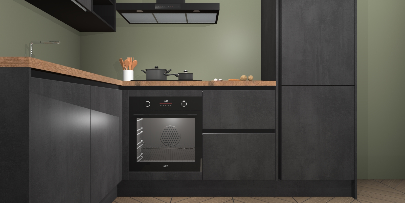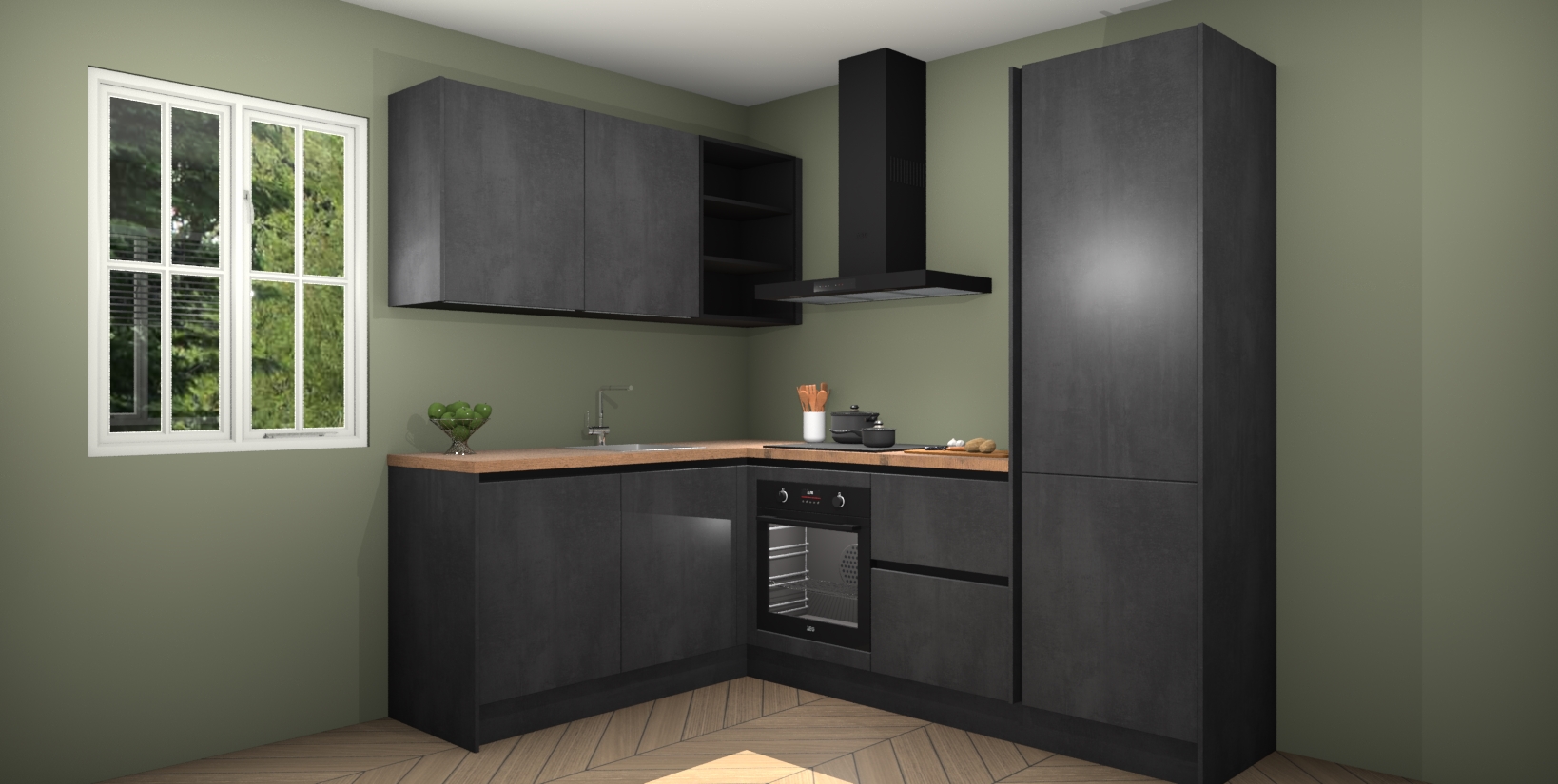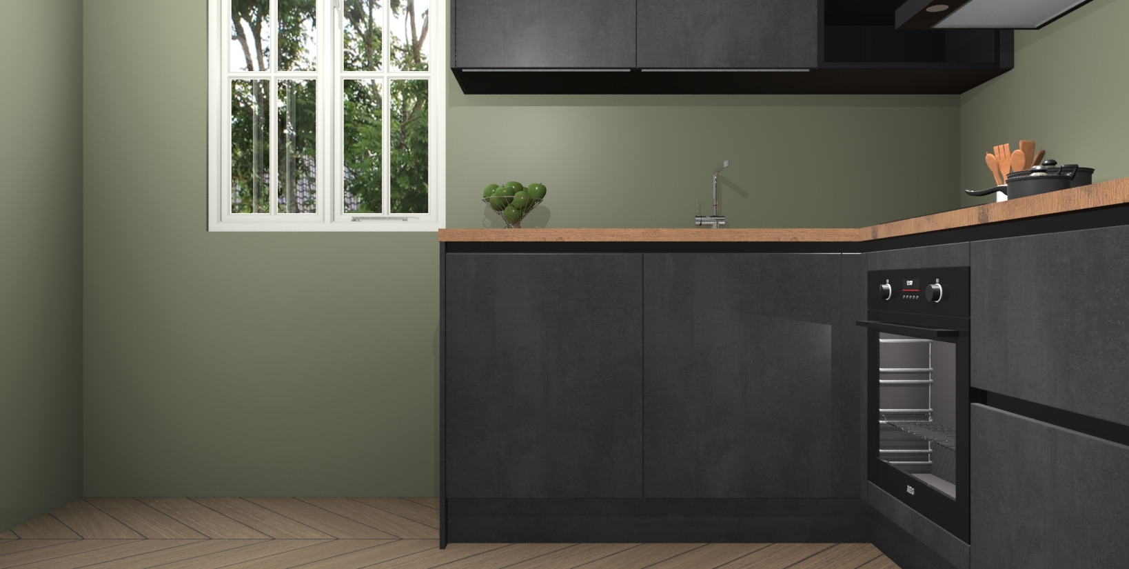 Maak kennis met de Beton Zwarte greeploze keuken Boekarest, een moderne hoekkeuken waar al uw vrienden en familie jaloers op zullen zijn! Het verbluffende mooie ontwerp past in elk interieur en is een ideale keuze voor wie op zoek is naar een klassieke, maar verfijnde look.