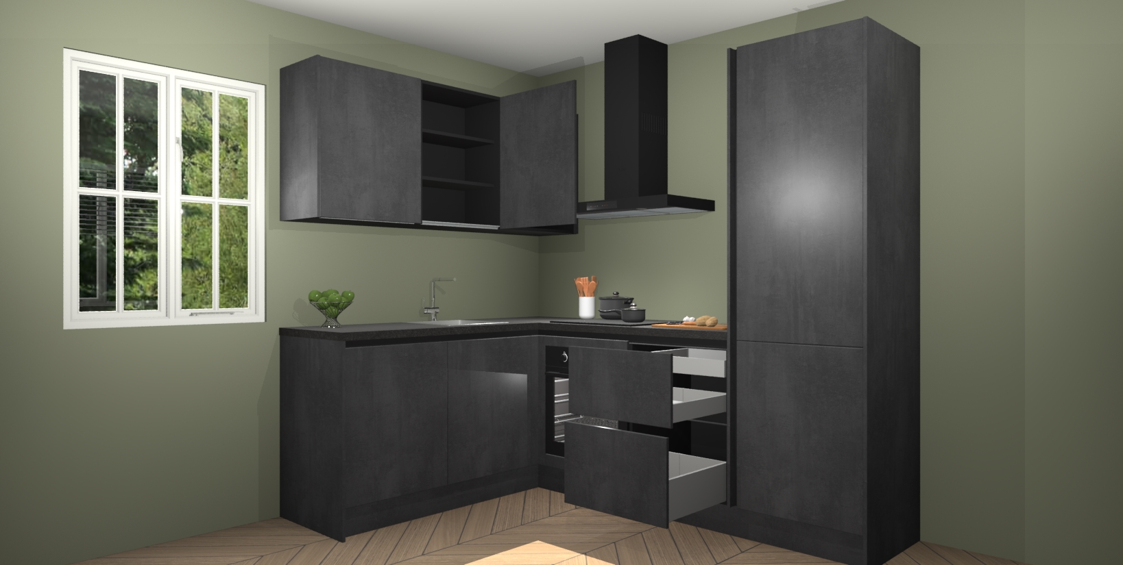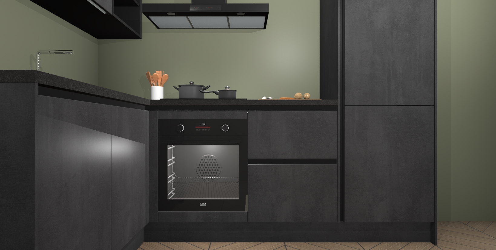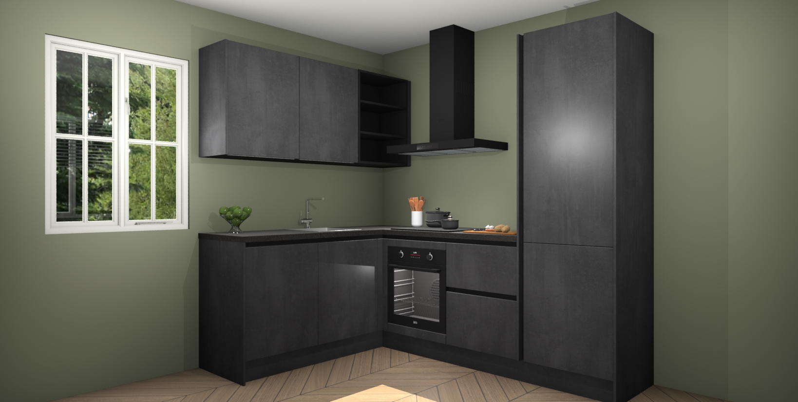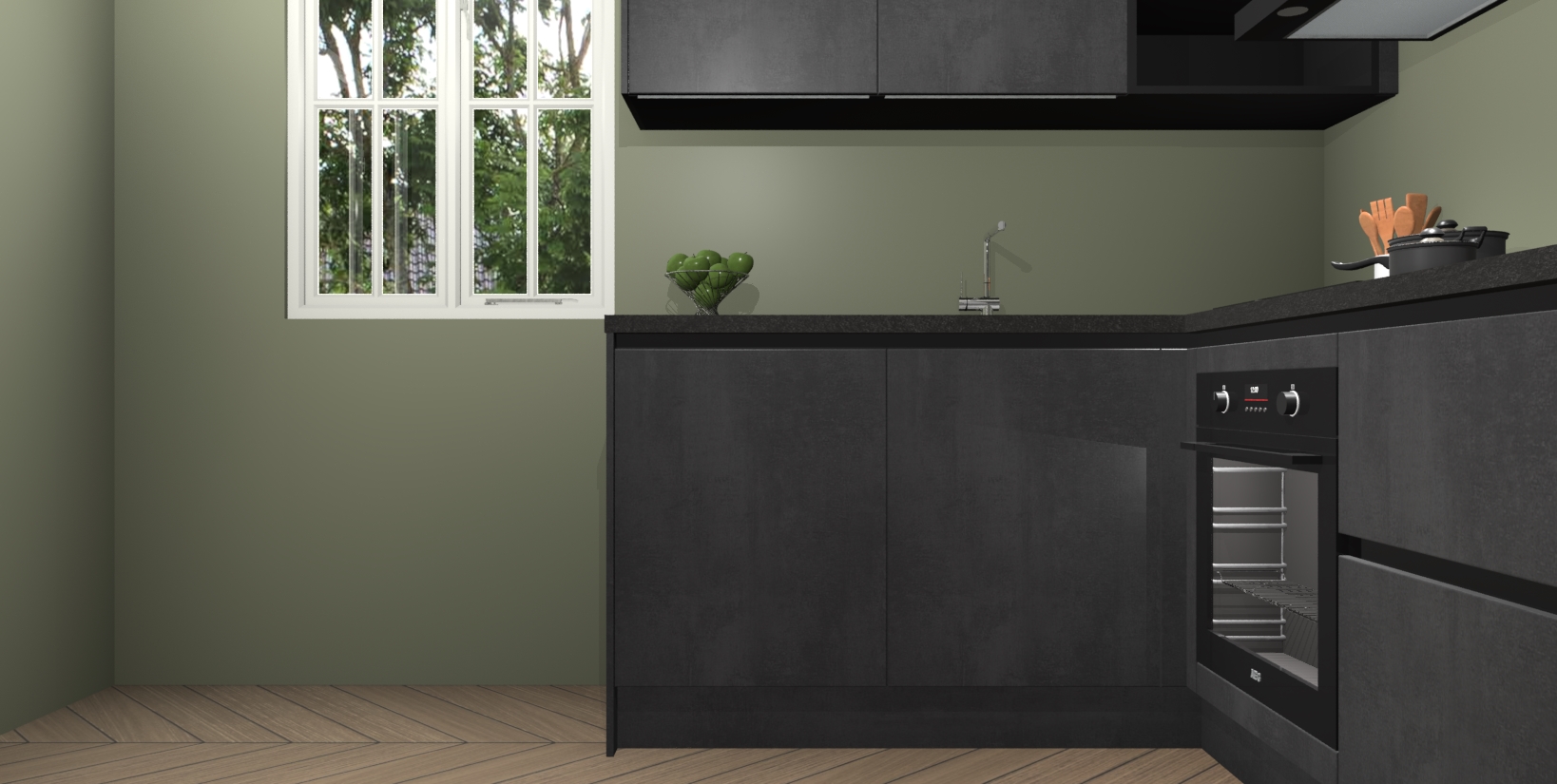 Maak kennis met de Beton Zwarte greeploze keuken Boekarest, een moderne hoekkeuken waar al uw vrienden en familie jaloers op zullen zijn! Het verbluffende mooie ontwerp past in elk interieur en is een ideale keuze voor wie op zoek is naar een klassieke, maar verfijnde look.