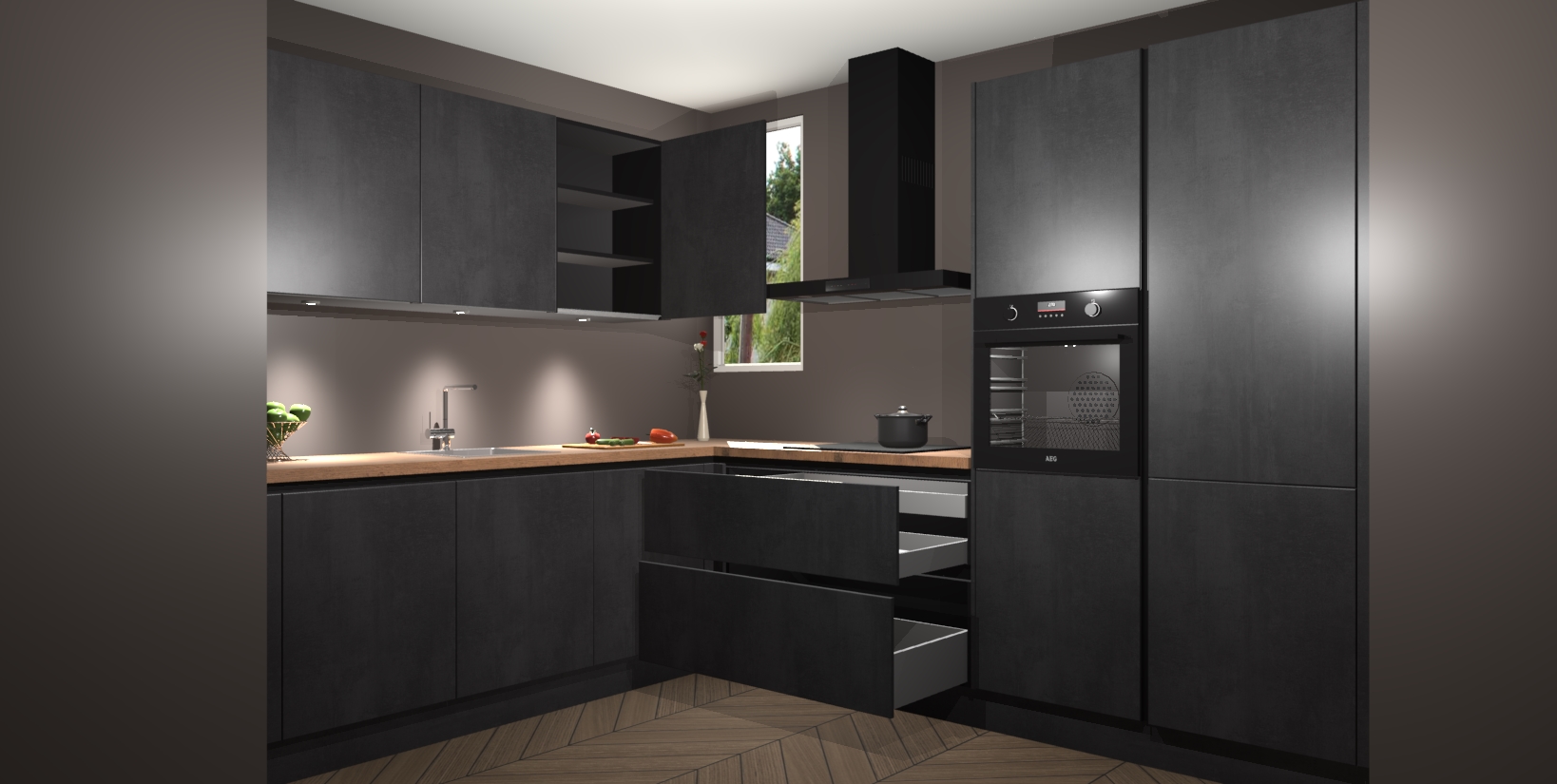 De ruime opbergruimte van dit model maakt het bereiden van voedsel en het gebruik van apparaten snel en gemakkelijk. Het beste van alles is dat het wordt geleverd met vijf inbouwapparaten: een oven, inductiekookplaat, afzuigkap, vaatwasser en koelkast - die allemaal gemakkelijk kunnen worden opgewaardeerd naar AEG na aankoop. Wat de gemaksfactor nog groter maakt, is het feit dat alle cabines voorgemonteerd worden geleverd, zodat u er meteen mee aan de slag kunt!