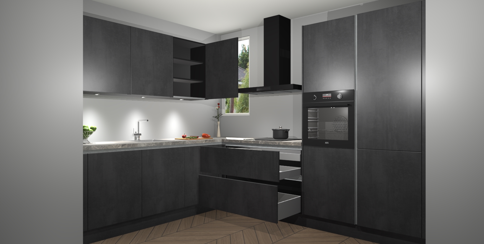 De ruime opbergruimte van dit model maakt het bereiden van voedsel en het gebruik van apparaten snel en gemakkelijk. Het beste van alles is dat het wordt geleverd met vijf inbouwapparaten: een oven, inductiekookplaat, afzuigkap, vaatwasser en koelkast - die allemaal gemakkelijk kunnen worden opgewaardeerd naar AEG na aankoop. Wat de gemaksfactor nog groter maakt, is het feit dat alle cabines voorgemonteerd worden geleverd, zodat u er meteen mee aan de slag kunt!