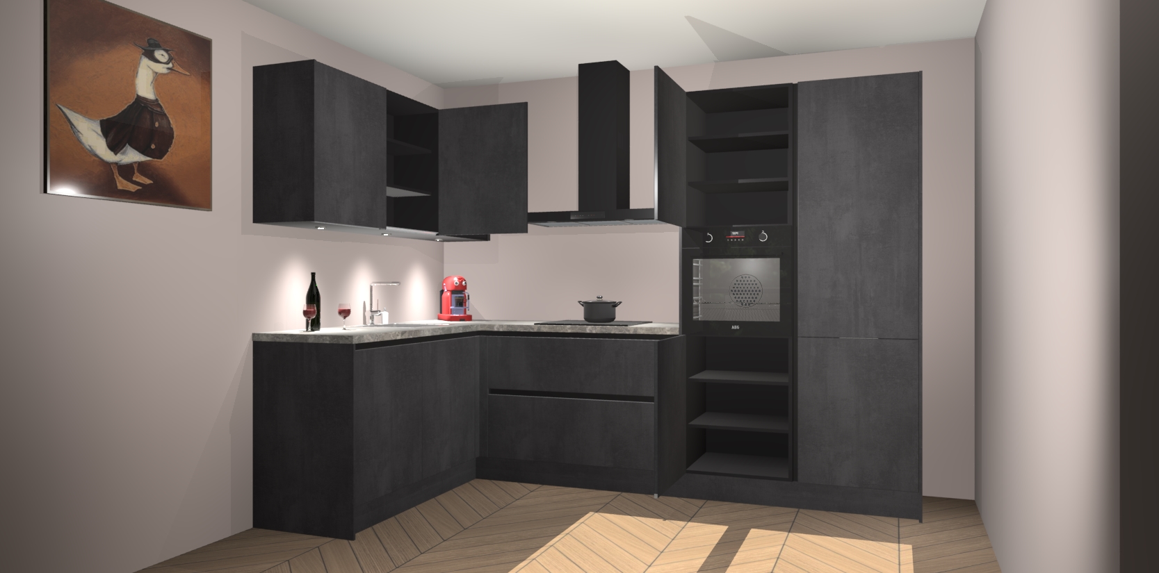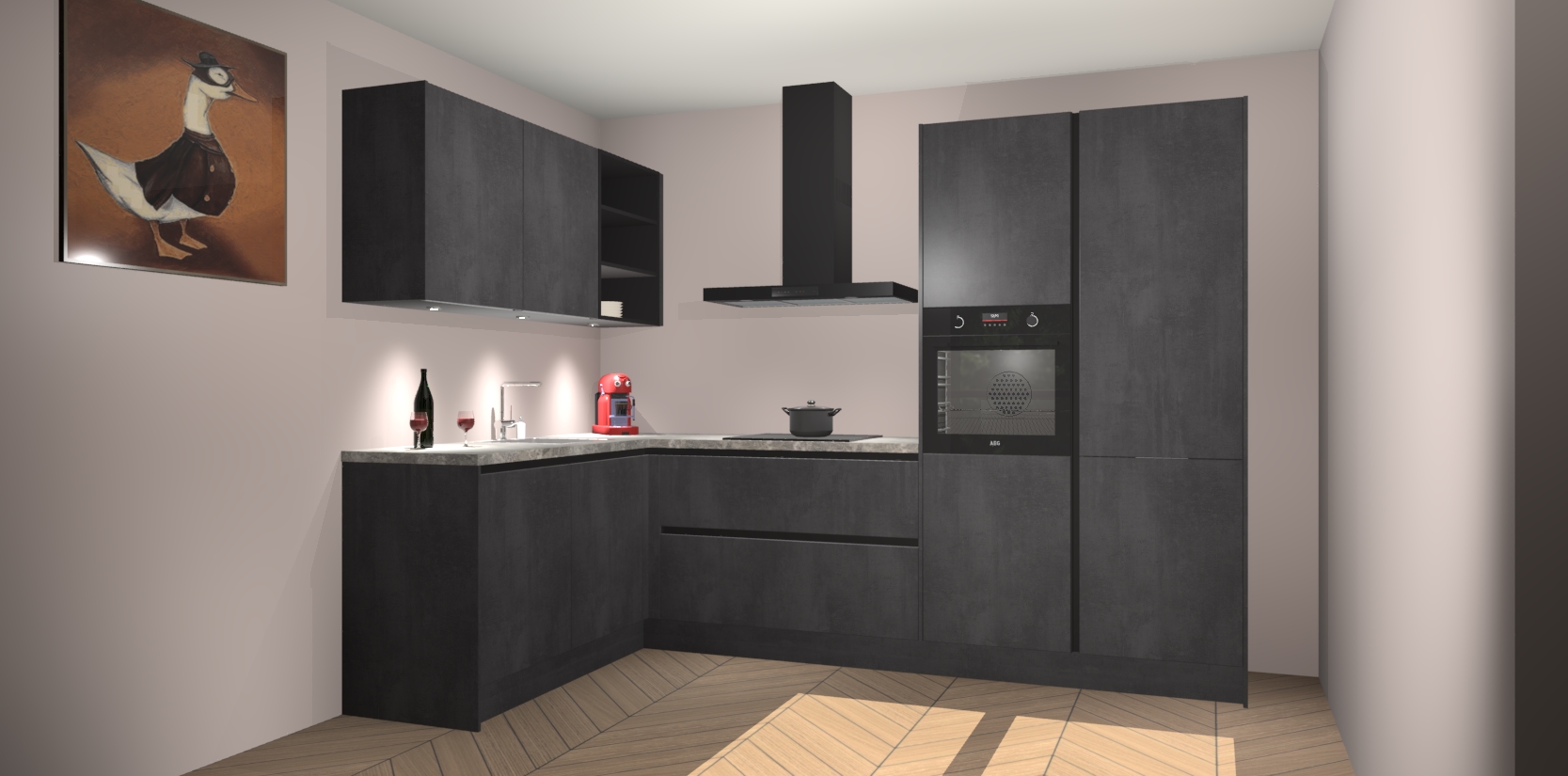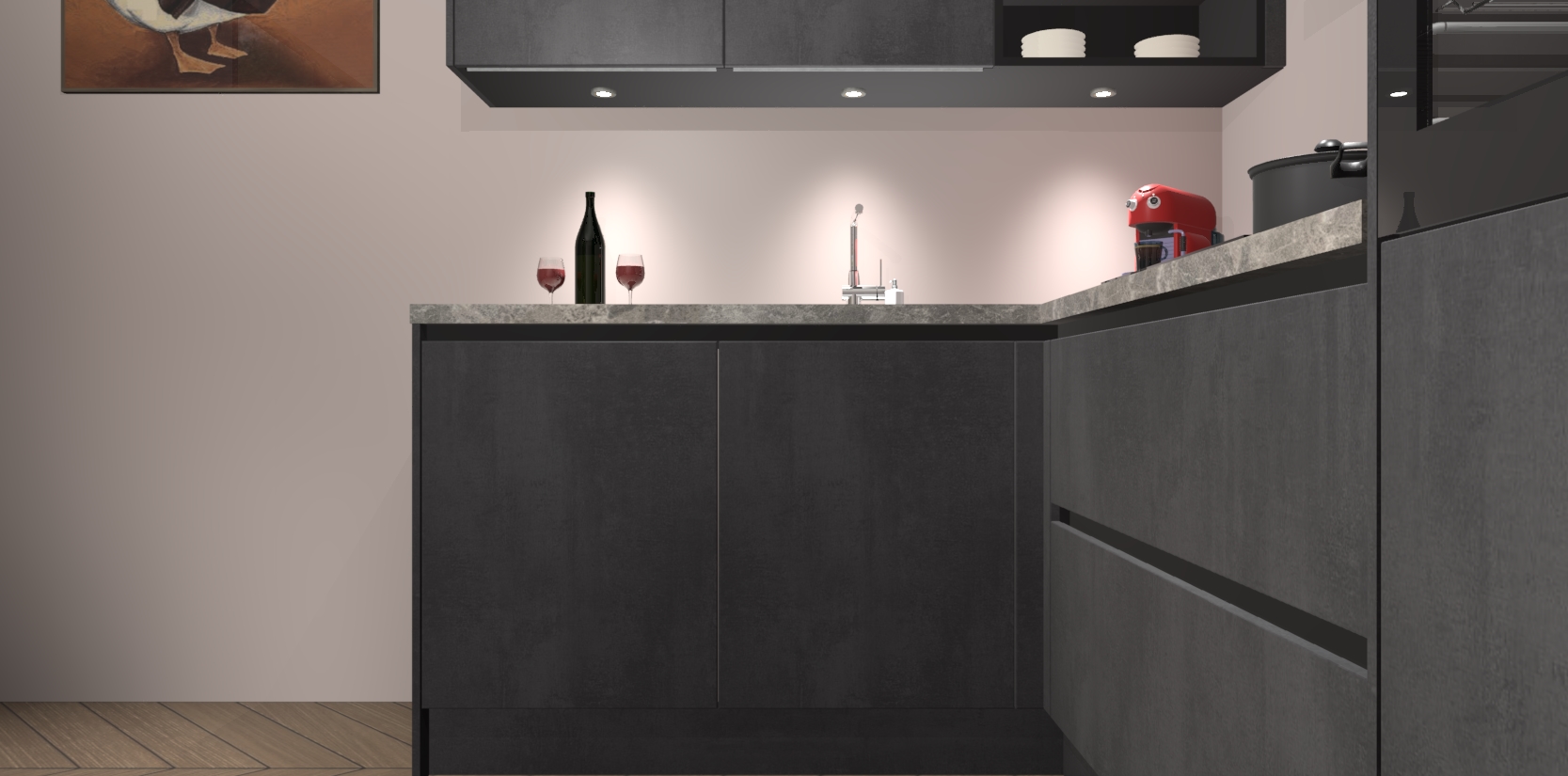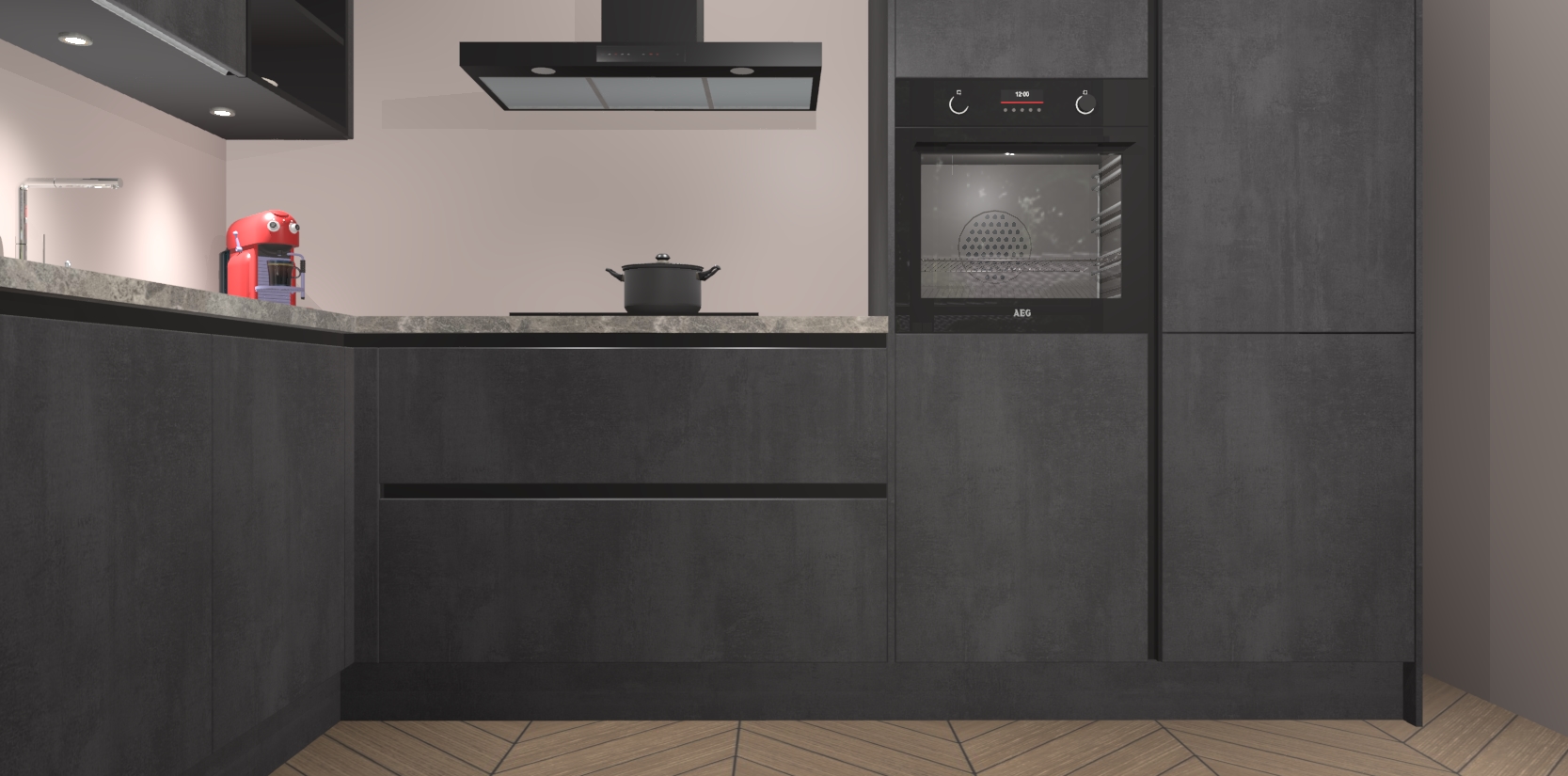 De Beton Zwarte greeploze keuken Cognac gaat alleen maar om de beste keukenervaring. Kies gewoon de beste apparatuur en ongeëvenaarde Duitse constructie die u thuis wilt hebben en verander uw huiskamer hartelijkheid meteen in professionaliteit. Laat de toon weten dat u gemakkelijk kan genieten van alle luxe die u verdiend? Bestel nu de Beton Zwarte greeploze keuken Cognac voor bij u thuis!