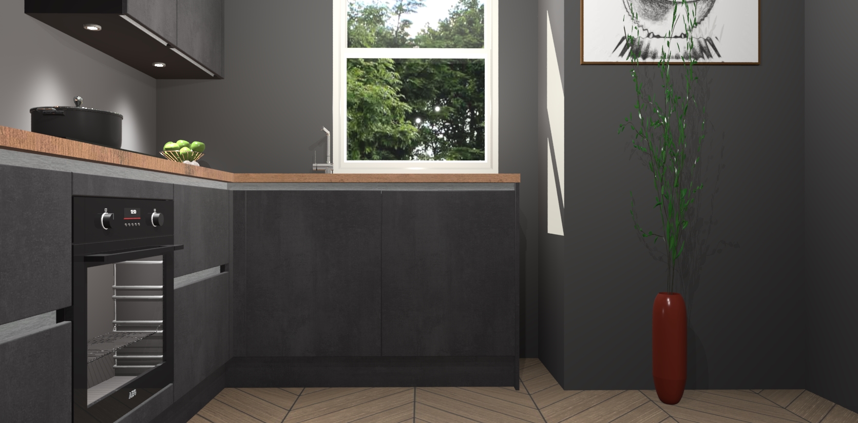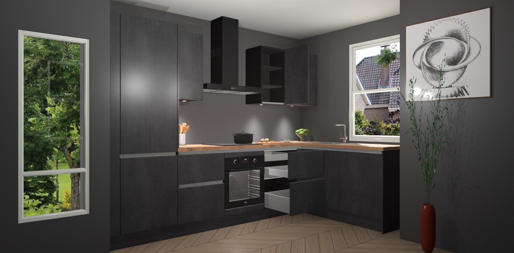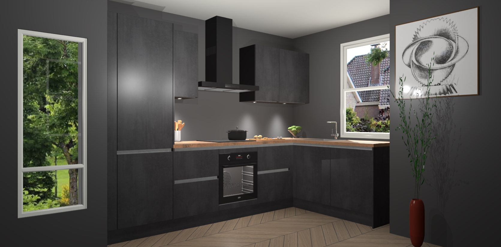 De Beton Zwarte greeploze keuken Geneve is precies wat u nodig heeft als u op zoek bent naar modern design, versmolten met tijdloze schoonheid. De strakke afwerking voegt klasse toe terwijl het toch een uitnodigende sfeer behoudt; zeker om zowel gasten als uzelf te inspireren om in stijl te gaan koken! En nog beter, het zal uw budget niet breken - dus waarom wachten? Met de Beton Zwarte greeploze keuken Geneve bent u verzekerd van kwaliteit zonder in te leveren op de prijs!