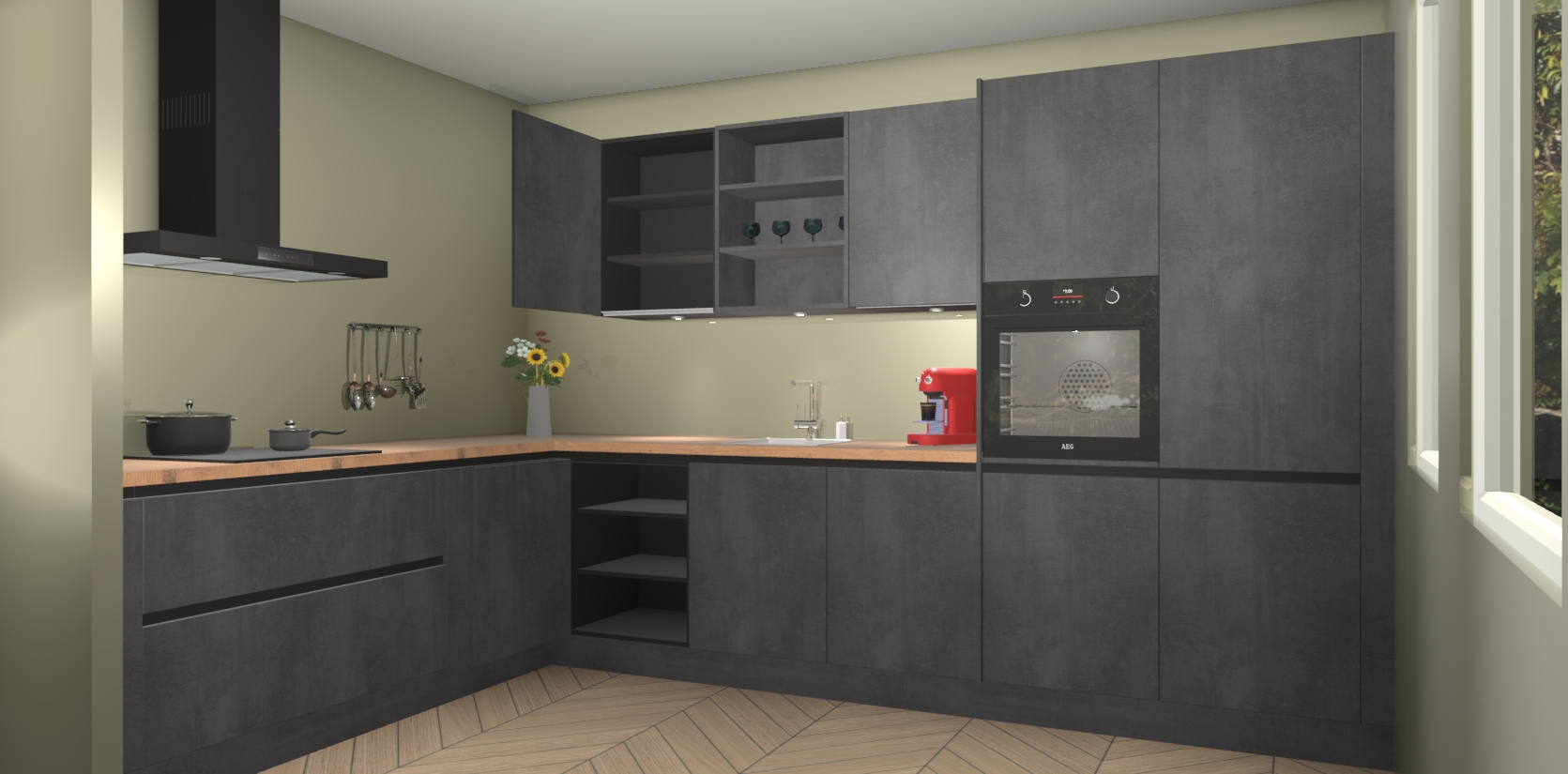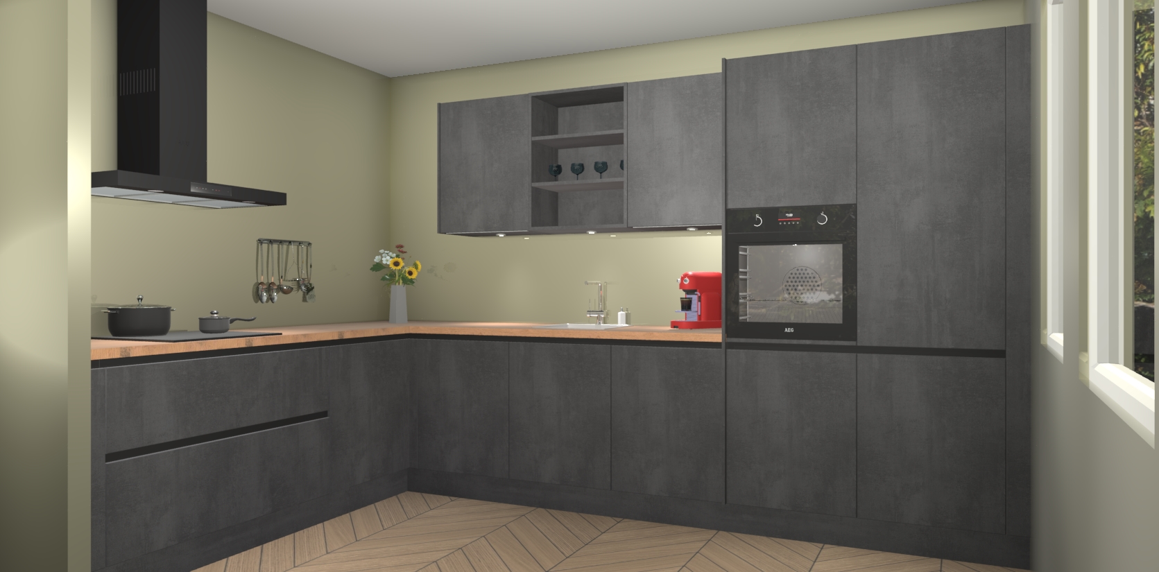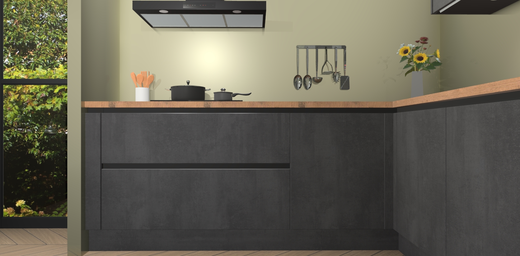 Dit is de perfecte keuken voor wie op zoek is naar een luxueuze stijl zonder zijn portemonnee te legen! Het chique ontwerp van Beton Zwarte greeploze keuken Gotenburg voegt dat vleugje verfijning toe aan elk huis.