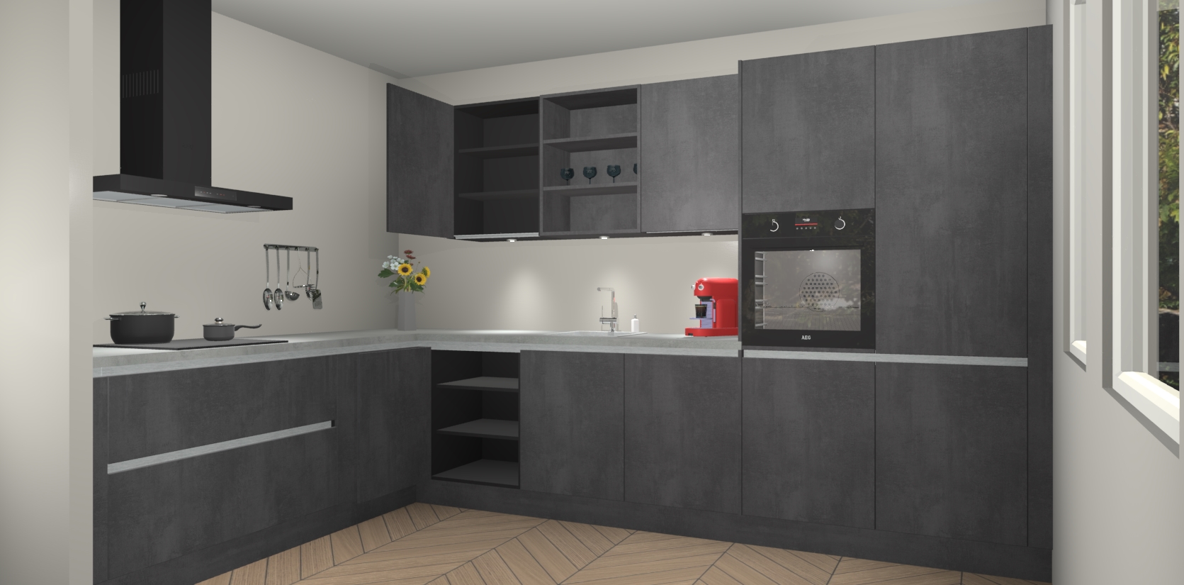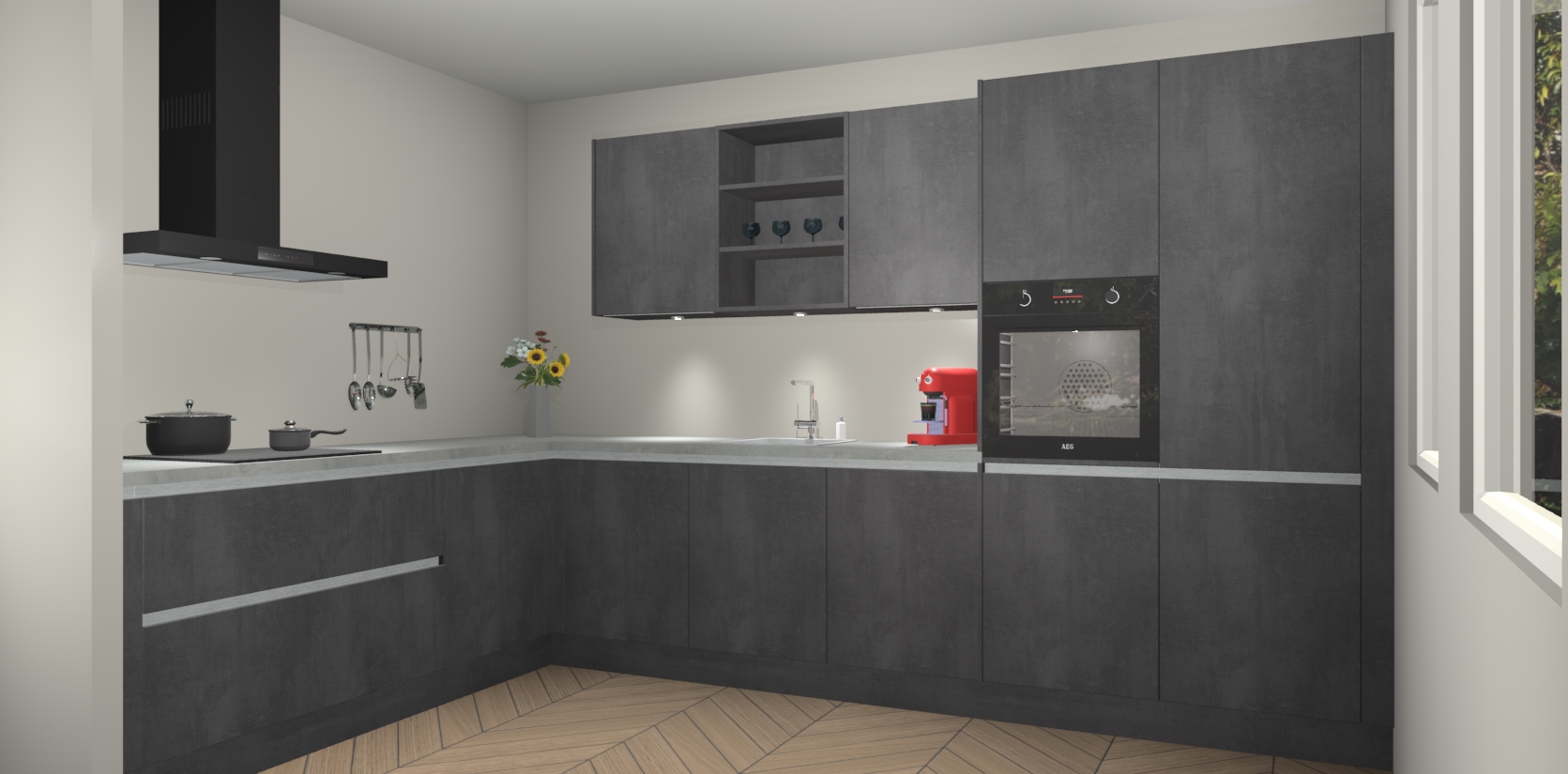 Dit is de perfecte keuken voor wie op zoek is naar een luxueuze stijl zonder zijn portemonnee te legen! Het chique ontwerp van Beton Zwarte greeploze keuken Gotenburg voegt dat vleugje verfijning toe aan elk huis.
