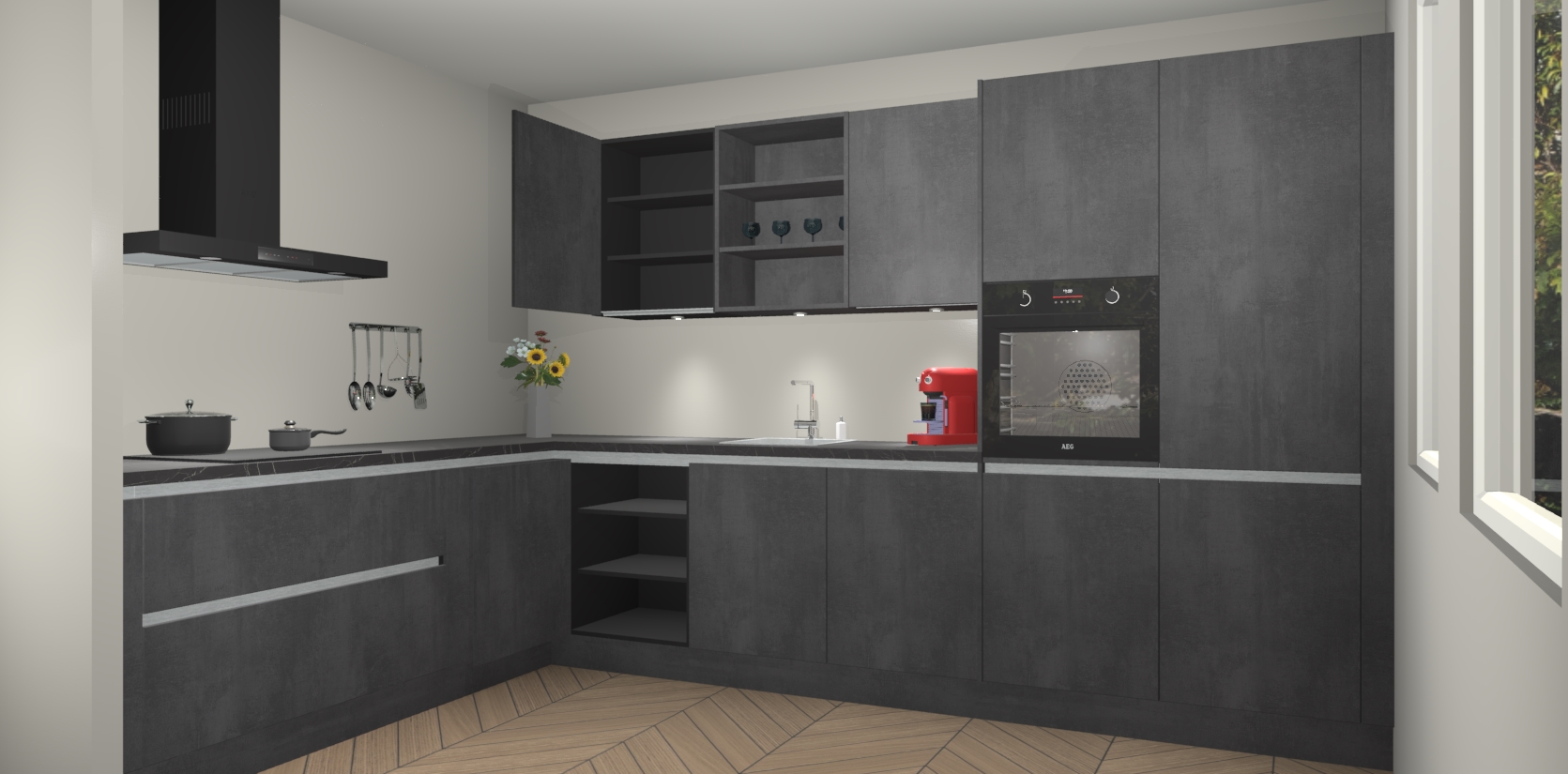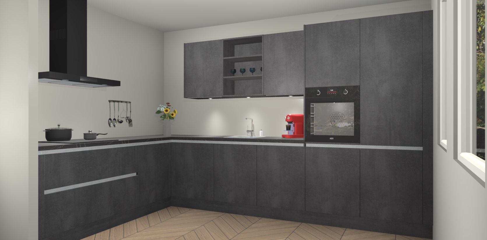 Dit is de perfecte keuken voor wie op zoek is naar een luxueuze stijl zonder zijn portemonnee te legen! Het chique ontwerp van Beton Zwarte greeploze keuken Gotenburg voegt dat vleugje verfijning toe aan elk huis.