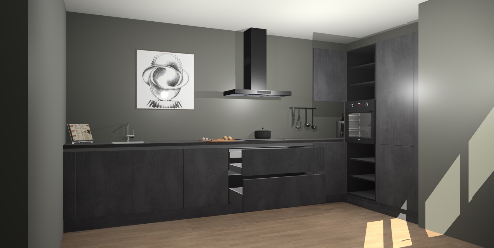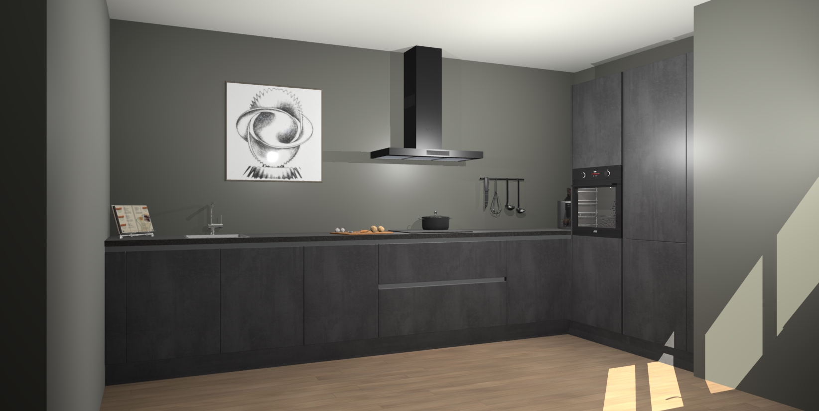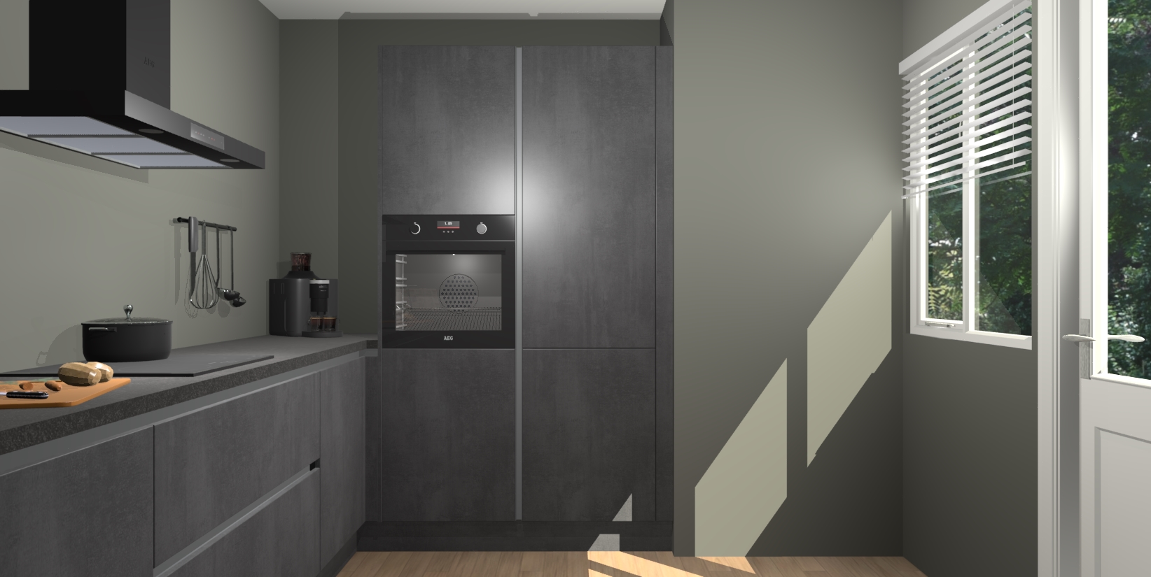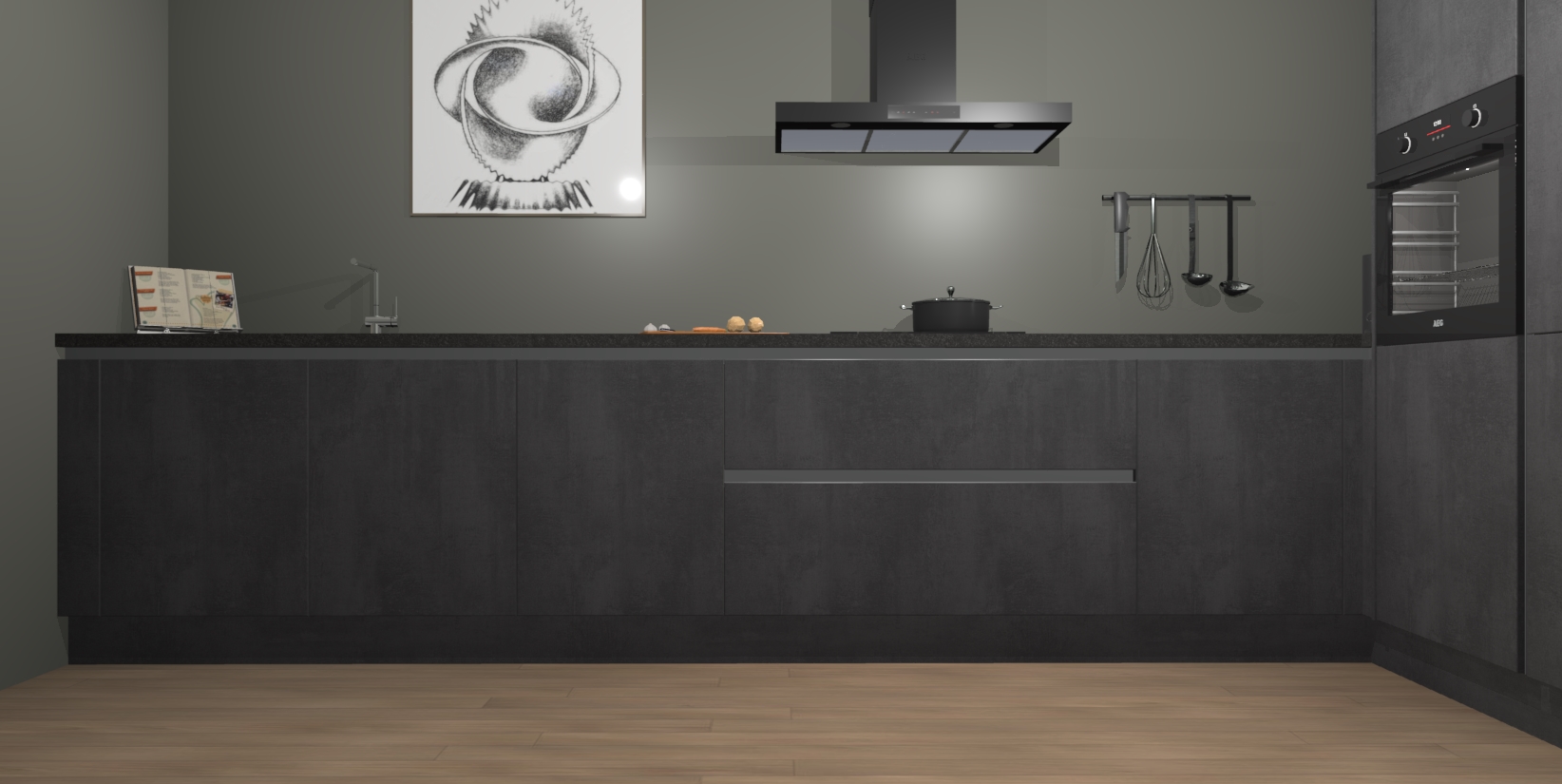 Welkom bij de Beton Zwarte greeploze keuken Khao Lak. Deze prachtige keuken zal de komende jaren het middelpunt van de belangstelling in uw huis zijn. Uitgerust met vijf inbouwapparaten komt u nooit kookgereedschap tekort. Bovendien geeft de warme houtlook elke ruimte een uitnodigende en tijdloze uitstraling.